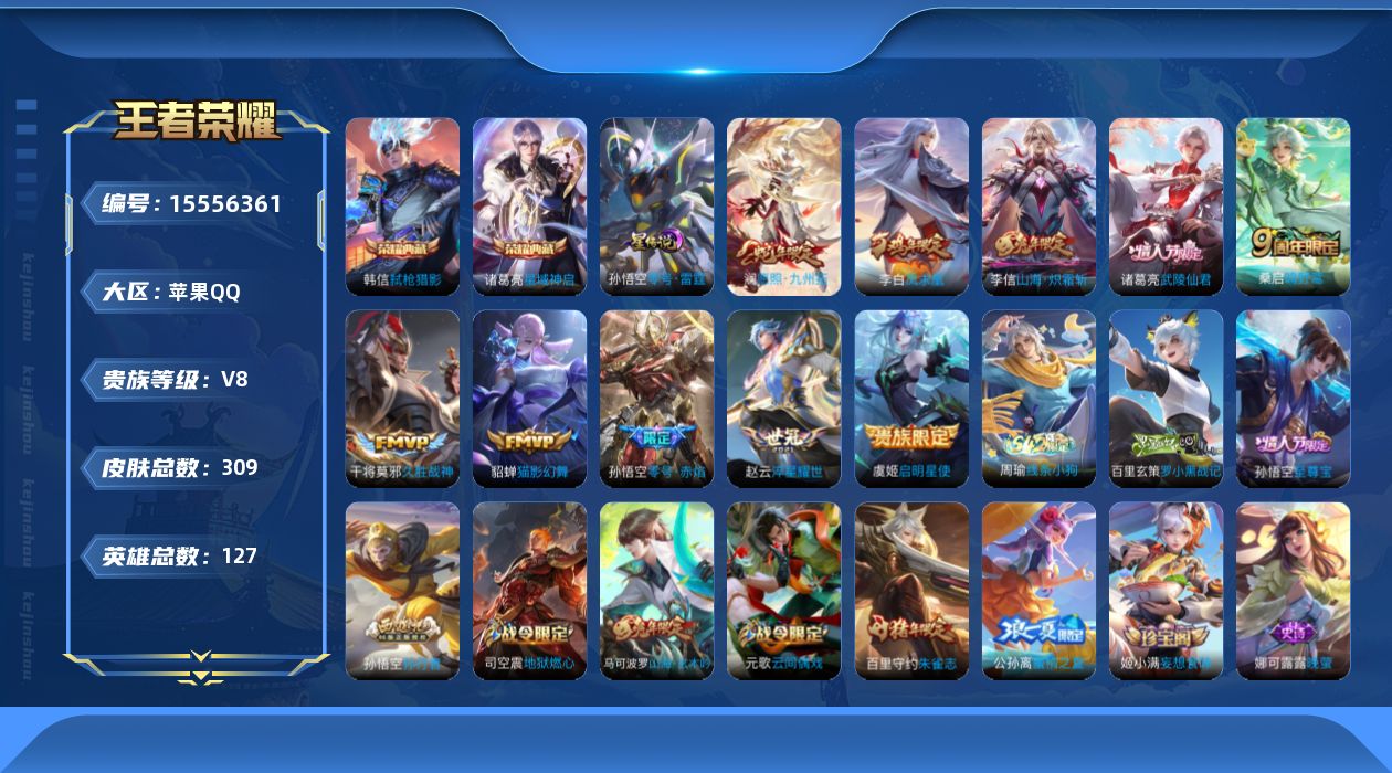 [15556361]【特价出售/店主推荐】苹果Q-V8-永恒钻石III段位-127英雄-309皮肤-2典藏皮肤-11传说-102史诗-2星元 【英雄全皮】:戈娅全皮 【荣耀典藏】:诸葛亮星域神启,韩信弑枪猎影 【传说皮肤】:后羿神树通天,澜愿照九州拓,桑启鸣野蒿,李信山海炽霜斩,赵云淬星耀世,虞姬启明星使,孙悟空零号赤焰,貂蝉猫影幻舞,干将莫邪久胜战神,诸葛亮武陵仙君,李白凤求凰 【限定皮肤】:蔡文姬夏日便利店,虞姬夏日便利店,姜子牙天穹之誓,狄仁杰阴阳师,赵云皇家上将,赵云龙胆,墨子神迹守卫,嬴政优雅恋人,孙尚香蔷薇恋人,鲁班七号狮舞东方,庄周云端筑梦师,庄周高山流水,钟无艳超时空战士,扁鹊奇幻香踪,白起夜都怪侠,芈月幻夜卜梦,周瑜赤莲之焰,元歌云间偶戏,元歌无心,甄姬落雪兰心,马可波罗山海玄木吟,狄仁杰魔术师,狄仁杰万华元夜,达摩星际陆战队,达摩沙漠行僧,项羽海滩派对,老夫子醍醐杖,老夫子航海奇遇记,程咬金演武夺筹,韩信逐梦之影,王昭君午后时光,兰陵王金庭之子,花木兰瑞麟志,亚瑟潮玩骑士王,孙悟空至尊宝,孙悟空零号赤焰,孙悟空孙行者,后羿如梦令,后羿圣弓游侠,李元芳匿光侦查者,李元芳云中旅人,虞姬启明星使,钟馗驱傩正仪,杨戬潮玩骑兵,女娲朔望之晖,干将莫邪真爱魔法,雅典娜单词大作战,蔡文姬繁星吟游,鬼谷子原初探秘者,鬼谷子五谷丰年,诸葛亮武陵仙君,黄忠火炮绅士,苏烈千军破阵,百里玄策原初追逐者,百里守约朱雀志,弈星混沌棋,梦奇顽趣,公孙离蜜橘之夏,沈梦溪大漠名商,明世隐疑决卦,明世隐吟游魔法,裴擒虎李小龙,裴擒虎擒涛扼浪,狂铁电玩高手,米莱狄胡桃异想国,云中君纤云弄巧,李信山海炽霜斩,上官婉儿梁祝,嫦娥拒霜思,嫦娥暖冬兔眠,西施玲珑珍味,蒙犽狂想玩偶喵,鲁班大师探海日志,桑启海盐诗旅,暃星界游侠,戈娅驭风魔法,艾琳流音漫舞,司空震地狱燃心,阿古朵江河有灵,张良古海寻踪,蒙恬荣光圣徽,高渐离燃音魔法,妲己灵卜魔法,鬼谷子天穹祈灯,伽罗琥珀纪元,姬小满妄想食味,沈梦溪龙舞盛年,鲁班七号蔬乡物语,李元芳蔬乡物语,刘邦剑破天穹,程咬金群星魔术团,镜青焰无极,项羽苍威无极,周瑜熔金海岸 【年限皮肤】:百里守约朱雀志,花木兰瑞麟志,李白凤求凰,赵云龙胆,马可波罗山海玄木吟,李信山海炽霜斩 【赛季限定】:狄仁杰万华元夜,达摩沙漠行僧,老夫子醍醐杖,程咬金演武夺筹,兰陵王金庭之子,张良古海寻踪,