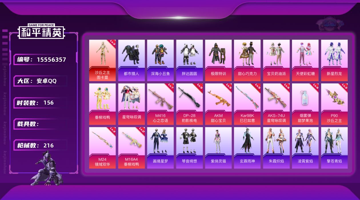 - PX_2061987- 苹果手Q-3王牌印记-11粉装-5特效枪-2载具-42137热力值-71套装-126枪皮-0卓越印记-0传奇印记 【11粉装】,梦幻火箭,甜心巧克力,宝贝奶油派,天使彩虹糖,猩猩队长,炫光之旅,智能音符,傲雪凌霜,霞光圣骑,暗夜鎏金,挚爱序曲 【5特效枪】AKM-炫紫旋律-5级 SCAR-L-甜梦小狐-5级 M416-五爪金龙-5级 Kar98K-巳巳如意-5级 平底锅-仲