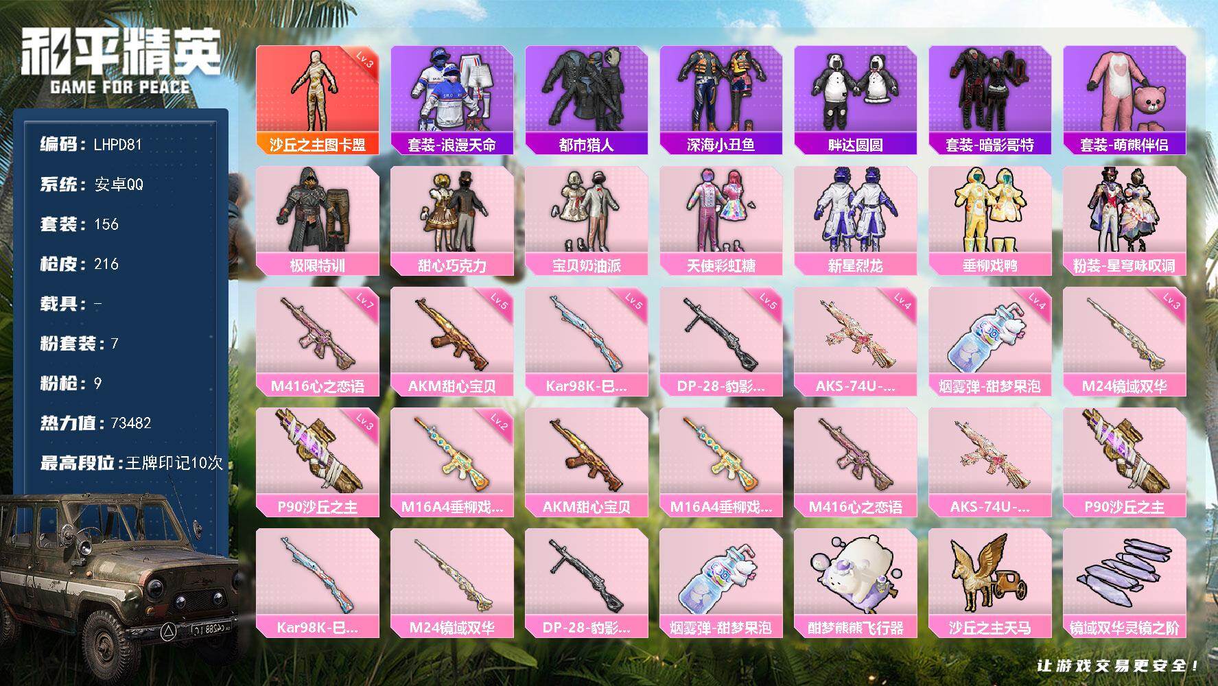 [15556357]【特价出售/店主推荐】安卓 手Q-1神装-7粉装-9特效枪-0载具-7粉色飞行器-73482热力值-10王牌印记-156套装-216枪皮【红色神装等级】:沙丘之主-图卡盟(三级)【红色角色神装】:沙丘之主-图卡盟【热门品类】:套装-浪漫天命,套装-都市猎人,套装-深海小丑鱼,套装-胖达圆圆,套装-暗影哥特,套装-萌熊伴侣【粉色套装】:粉装-极限特训,粉装-甜心巧克力,粉装-宝贝奶油派,粉装-天使彩虹糖,粉装-新星烈龙,粉装-垂柳戏鸭,粉装-星穹咏叹调【粉色枪皮等级】:AKM-甜心宝贝(五级),M16A4-垂柳戏鸭(二级),M416-心之恋语(七级),AKS-74U-星穹咏叹调(四级),P90-沙丘之主(三级),Kar98K-巳巳如意(五级),M24-镜域双华(三级),DP-28-豹影疾电(五级),烟雾弹-甜梦果泡(四级)【粉色枪皮】:AKM-甜心宝贝,M16A4-垂柳戏鸭,M416-心之恋语,AKS-74U-星穹咏叹调,P90-沙丘之主,Kar98K-巳巳如意,M24-镜域双华,DP-28-豹影疾电,烟雾弹-甜梦果泡【粉色飞行器】:酣梦熊熊飞行器,沙丘之主天马,镜域双华-灵镜之阶,龙翔九天飞行器