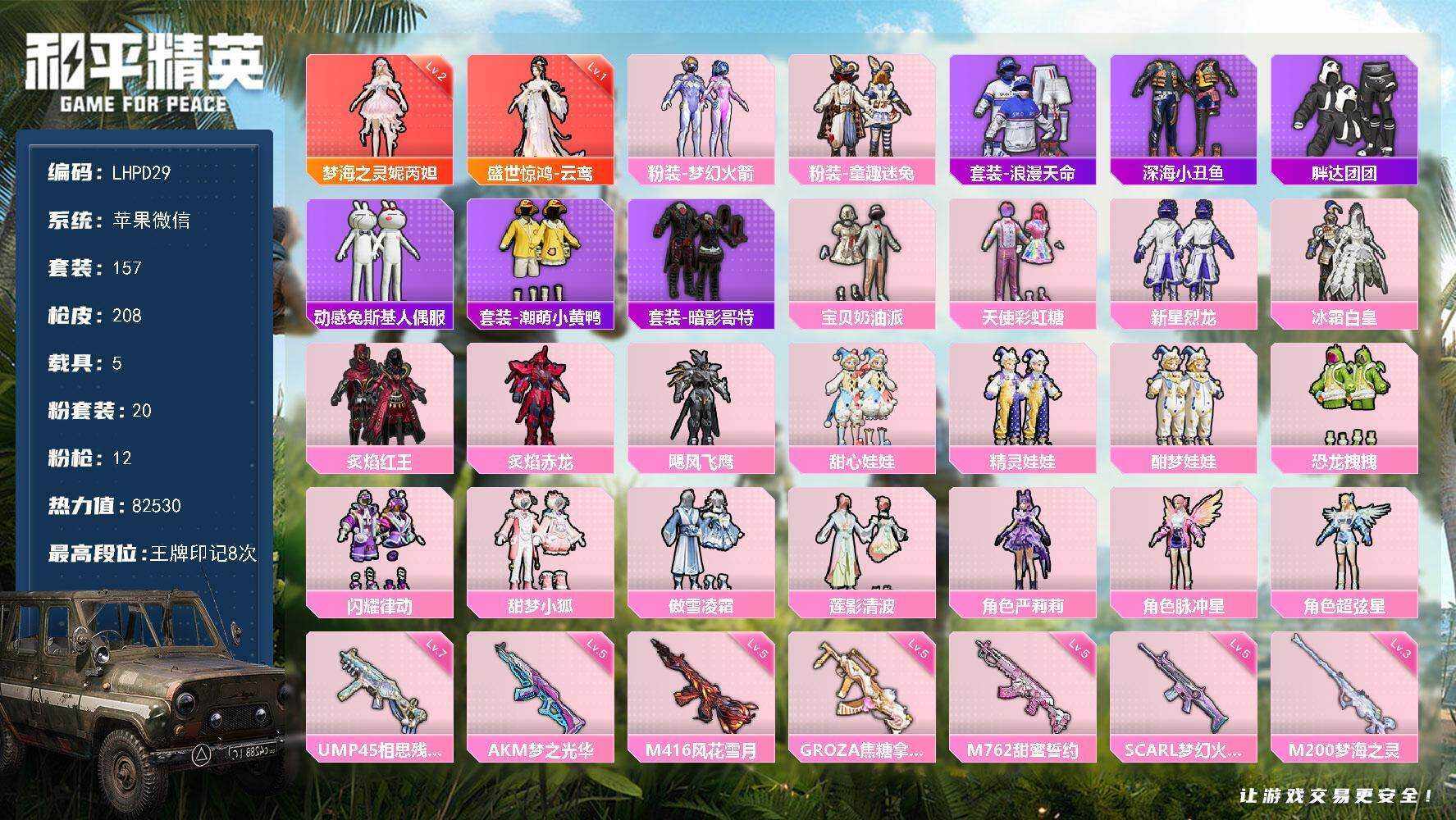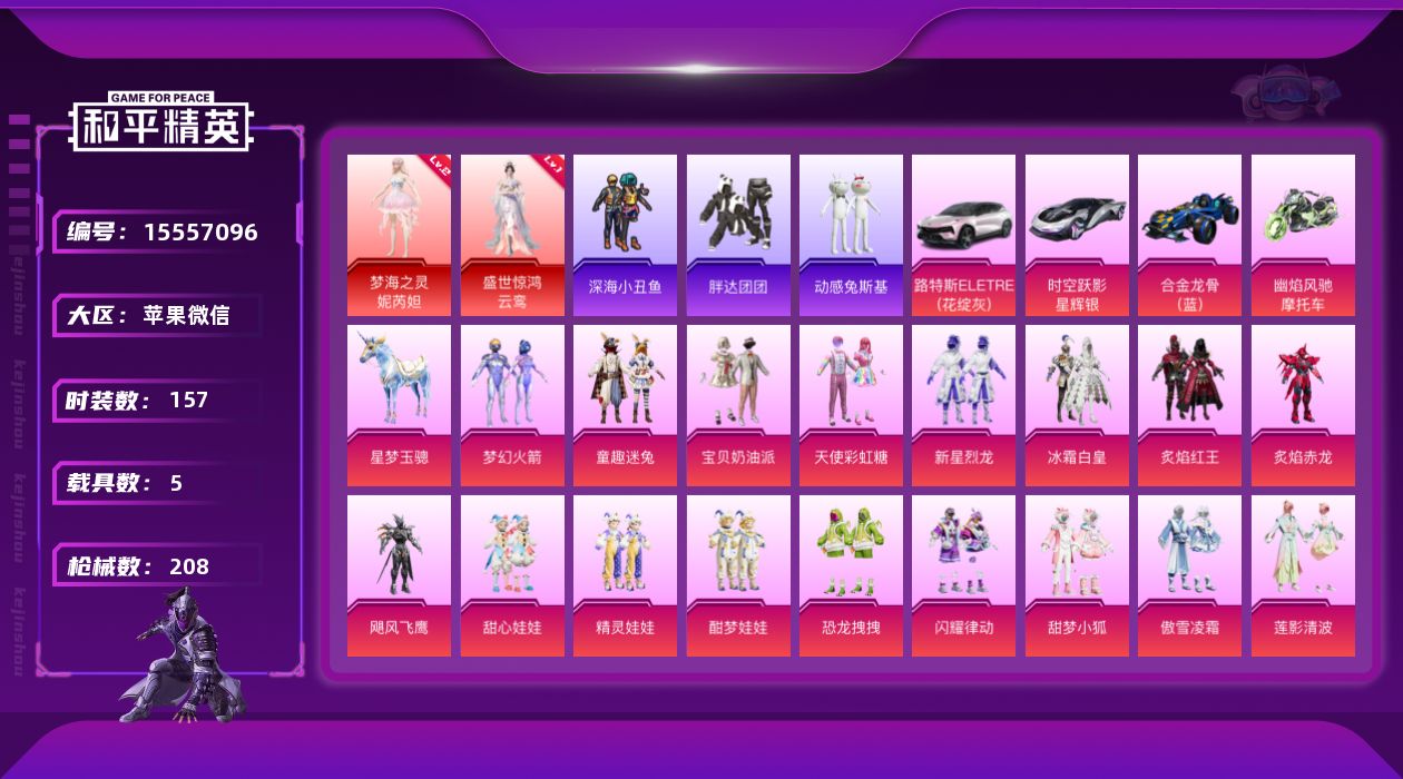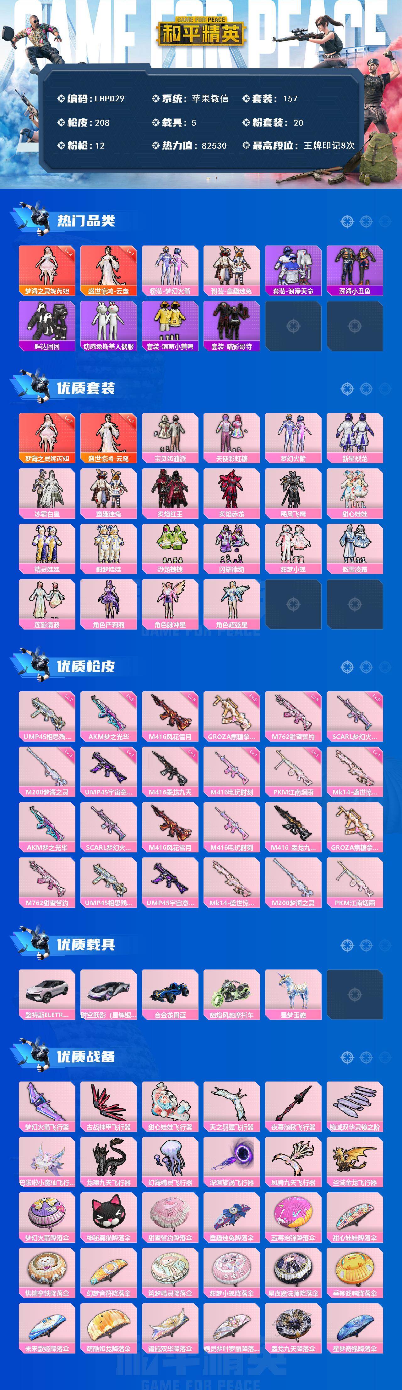 [15557096]【特价出售/店主推荐】苹果 微信-2神装-20粉装-12特效枪-5载具-12粉色飞行器-82530热力值-8王牌印记-157套装-208枪皮【红色神装等级】:盛世惊鸿-云鸾(一级),梦海之灵-妮芮妲(二级)【红色角色神装】:盛世惊鸿-云鸾,梦海之灵-妮芮妲【热门品类】:粉装-梦幻火箭,粉装-童趣迷兔,套装-浪漫天命,套装-深海小丑鱼,套装-胖达团团,套装-动感兔斯基人偶服,套装-潮萌小黄鸭,套装-暗影哥特【粉色套装】:粉装-宝贝奶油派,粉装-天使彩虹糖,粉装-梦幻火箭,粉装-新星烈龙,粉装-冰霜白皇,粉装-童趣迷兔,粉装-炙焰红王,粉装-炙焰赤龙,粉装-飓风飞鹰,粉装-甜心娃娃,粉装-精灵娃娃,粉装-酣梦娃娃,粉装-恐龙拽拽,粉装-闪耀律动,粉装-甜梦小狐,粉装-傲雪凌霜,粉装-莲影清波,角色-严莉莉,角色-脉冲星,角色-超弦星【粉色枪皮等级】:AKM-梦之光华(五级),SCAR-L-梦幻火箭(五级),M416-风花雪月(五级),M416-电玩时刻(一级),M416-墨龙九天(一级),GROZA-焦糖拿铁(五级),M762-甜蜜誓约(五级),UMP45-相思残雪(七级),UMP45-宇宙意志(一级),Mk14-盛世惊鸿(一级),M200-梦海之灵(三级),PKM-江南烟雨(一级)【粉色载具】:路特斯ELETRE(花绽灰),时空跃影(星辉银),合金龙骨(蓝),幽焰风驰摩托车,星梦玉骢【粉色枪皮】:AKM-梦之光华,SCAR-L-梦幻火箭,M416-风花雪月,M416-电玩时刻,M416-墨龙九天,GROZA-焦糖拿铁,M762-甜蜜誓约,UMP45-相思残雪,UMP45-宇宙意志,Mk14-盛世惊鸿,M200-梦海之灵,PKM-江南烟雨【粉色飞行器】:梦幻火箭飞行器,古战神甲飞行器,甜心娃娃飞行器,天之羽翼飞行器,夜幕颂歌飞行器,镜域双华-灵镜之阶,巴啦啦小魔仙飞行器,龙翔九天飞行器,幻海精灵飞行器,深渊漩涡飞行器,凤舞九天飞行器,圣域金龙飞行器