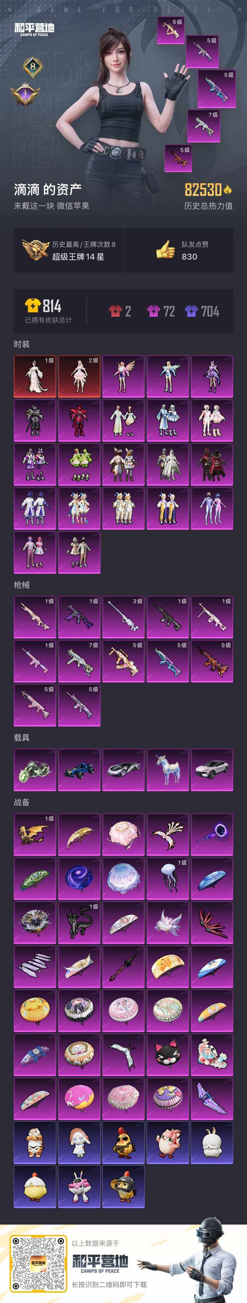 - [15147951]9英雄角色数-232英雄武器数 【王者系列】:王者之影,王者之狱,王者之霆,王者之誉 【热门武器】:KSG-孟获,81式-光明之神,MK47-仁德,M4A1-仲达,AK47-奉先,M200-幻神,AWM-妙才,81式-阿波罗*2,COP 357-绚樱,CZS2-仲康,AN94-盖 【角色】:零,关小雨,零-水下丽影,炽天使-X,祝融夫人,零-新生,步练师*2,九安-X 【英雄武器】:AK47-无影,AK47-火麒麟*2,AK47-奉先,AK47-雷霆,AK47-雅韵青花,AK47-谜城烟火,M4A1-雷神,M4A1-黑骑士,M4A1-死神,M4A1-仲达,M4A1-太白诗仙,SCAR-幽暗骑士,AN94-盖,M14EBR-拂影,AK12-天启,HK417-炎龙铠甲,81式-光明之神,MK47-云舞,MK47-仁德,SKS-曳鼎,G3A3-衍神兵,QBZ191-帝皇铠甲,AWM-天龙,AWM-妙才,AWM-裁决,AWM-天使,AWM-指南针,AWM-大湾溢彩,巴雷特-毁灭*5,巴雷特-极光*4,巴雷特-金色蔷薇,M200-幻神,98K-黑骑士,MR1-龙吟惊沧海,RPK-盘龙,加特林-堡垒,QBB95-极光,QBB95-再战涿鹿,汤姆逊-烈龙*3,双持斯泰尔-天使*4,QCW05-变形金刚·大黄蜂*2,CBJ-MS-毒蜂,CZS2-血月,CZS2-仲康,PP19野牛-造纸术觉醒,打击者-天神,地狱火*3,地狱烈炎,AA12-火药,亡命之徒-幻兽,KSG-火力竞放,KSG-孟获,KSG-钟馗觉醒,Origin12-机变奇蛇觉醒,USP-神罚*2,USP-机械迷城*2,沙鹰-修罗*4,沙鹰-天神,双持沙鹰-亚龙,沙鹰-神兵修罗*2,沙鹰-宇航兔兔*2,双持沙鹰-元让,蟒蛇-鼓龙,左轮-卧龙觉醒,双持GLOCK18-本初,GLOCK18-猎神,QSZ92-天使,柯尔特-仲达,双持柯尔特-极光,CZ75-策,MK23-机械纪元,雌雄双股剑,虎贲钩镰刀,蝴蝶刀-天神,女皇利刃-铁胆虎魄*2,炽芒蝶刃,清刚-觉醒,匕首-浩瀚征途,龙啸*2,神罚战斧*2,血阳,手斧-机械迷城*3,秋逸觉醒,气勇胆烈戟,屠龙*7,血月,尼泊尔-机械纪元,尼泊尔-铜头铁臂,太白诗仙扇*2,麒麟刺,星芒,马来剑-毁灭,唐刀-大唐荣耀,擎天觉醒*2,斩魔刀,末日裁决觉醒,破邪蛇棍觉醒,马来剑-耀金伯爵