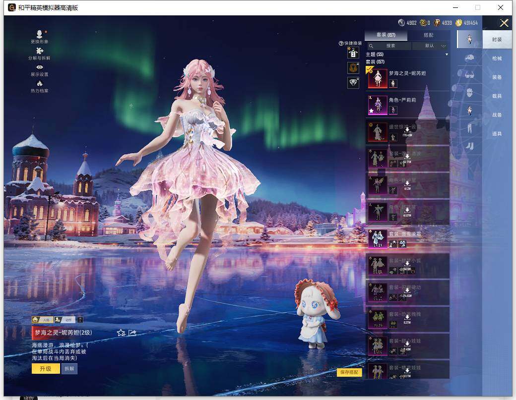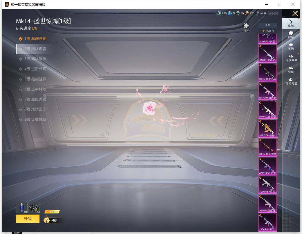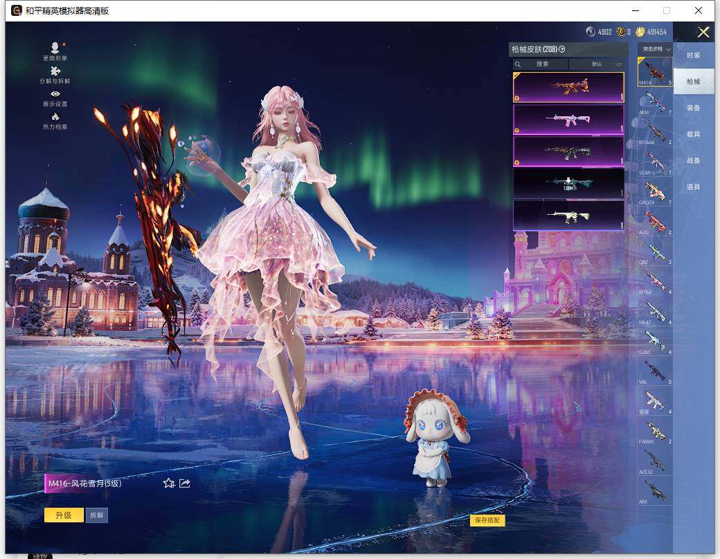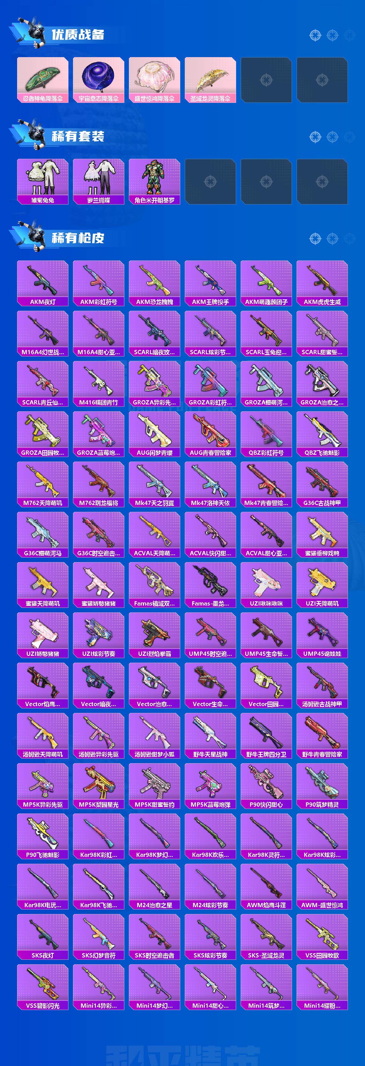 AKM-梦之光华,SCAR-L-梦幻火箭,M416-风花雪月,M416-电玩时刻,M416-墨龙九天,GROZA-焦糖拿铁,M762-甜蜜誓约,UMP45-相思残雪,UMP45-宇宙意志,Mk14-盛世惊鸿,M200-梦海之灵,PKM-江南烟雨