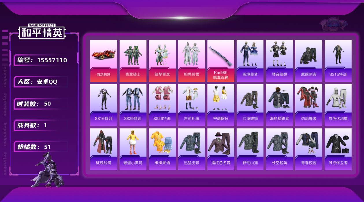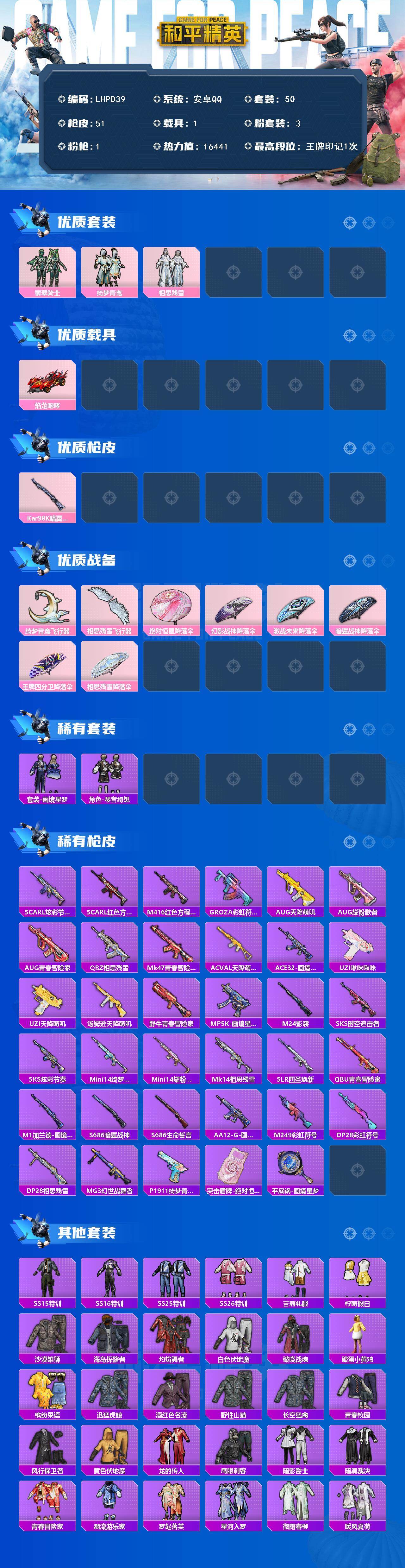 - [15145343]【店主推荐捡漏号!可直接换绑】安卓 手Q-3神装-6粉装-12特效枪-3载具-11粉色飞行器-68855热力值-8王牌印记-116套装-181枪皮【红色神装等级】:金蛇镇世-烛九(一级),盛世惊鸿-云鸾(一级),沙丘之主-图卡盟(三级)【红色角色神装】:金蛇镇世-烛九,盛世惊鸿-云鸾,沙丘之主-图卡盟【热门品类】:粉装-梦幻火箭,套装-冥河战士,套装-胖达团团,套装-暗影哥特,套装-粉红小猪【粉色套装】:粉装-梦幻火箭,粉装-甜心娃娃,粉装-精灵娃娃,粉装-酣梦娃娃,粉装-桃粉嫣然,角色-羊梦糖心【粉色枪皮等级】:AKM-幽焰骑士(三级),SCAR-L-金蛇镇世(三级),M416-墨龙九天(三级),GROZA-镜光银凌(五级),M762-青锋波束(五级),AKS-74U-信仰神谕(七级),P90-沙丘主(三级),Kar98K-巳巳如意(五级),Mk14-盛世惊鸿(三级),MK12-雪月幻音(四级),DP-28-豹影疾电(五级),MG-36-沧焰双生(五级)【粉色载具】:兰博基尼Estoque(炫光金),盛世惊鸿摩托车,护世瑞兽【粉色枪皮】:AKM-幽焰骑士,SCAR-L-金蛇镇世,M416-墨龙九天,GROZA-镜光银凌,M762-青锋波束,AKS-74U-信仰神谕,P90-沙丘之主,Kar98K-巳巳如意,Mk14-盛世惊鸿,MK12-雪月幻音,DP-28-豹影疾电,MG-36-沧焰双生【粉色飞行器】:酣梦熊熊飞行器,焦糖拿铁飞行器,沙丘之主天马,镜域双华-灵镜之阶,龙翔九天飞行器,幽焰列车飞行器,凤舞九天飞行器,万象金身飞行器,极意拳锋飞行器