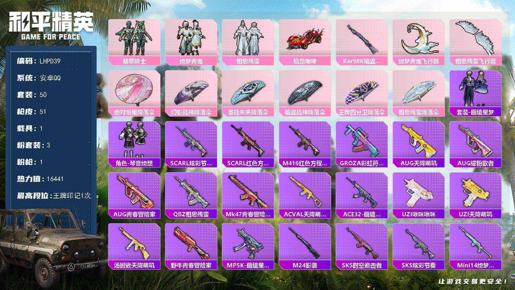 [15557110]【特价出售/店主推荐】安卓 手Q-3粉装-1特效枪-1载具-2粉色飞行器-16441热力值-1王牌印记-50套装-51枪皮【粉色套装】:粉装-翡翠骑士,粉装-绮梦青鸾,粉装-相思残雪【粉色载具】:焰龙咆哮【粉色枪皮】:Kar98K-暗翼战神【粉色飞行器】:绮梦青鸾飞行器,相思残雪飞行器