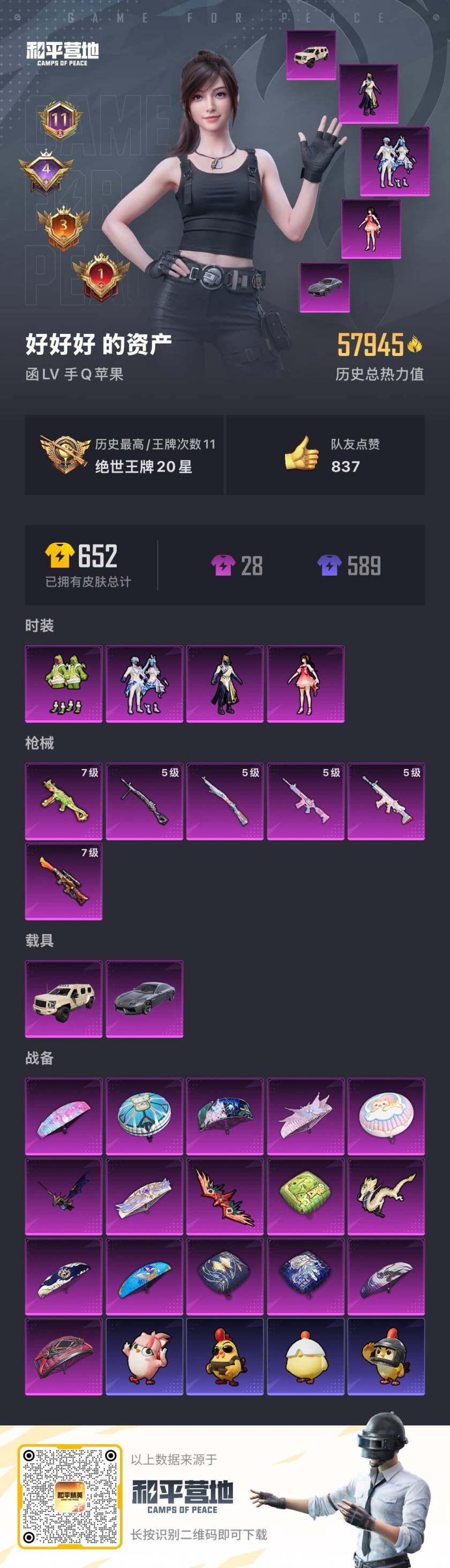 - [14740582]【店主推荐捡漏号!可直接换绑】/素材身法号/地铁满天赋 苹果 手Q-11粉装-6特效枪-2载具-8粉色飞行器-10w热力值-17王牌印记-233套装-306枪皮【热门品类】:套装-浪漫天命,套装-都市猎人,套装-深海小丑鱼,套装-奇异狩猎者,套装-金羽特工,套装-龟仙人,套装-暗影哥特,角色-Mark.06,熔岩游骑兵连帽夹克【粉色套装】:粉装-幻影战神,粉装-放客神游,粉装-天禅智恒,粉装-绚金战神,粉装-暗星紫秘,粉装-闲梦青缨,角色-宙之时溯,角色-智耀战神,角色-星渊,角色-异瞳寒姬【粉色枪皮等级】:AKM-炫紫旋律(七级),SCAR-L-青春物语(七级),Kar98K-巳巳如意(五级),Kar98K-圣域龙灵(三级),AMR-智耀战神(七级),DP-28-豹影疾电(五级)【粉色载具】:保时捷Panamera(梦幻青),冰绡玉鳞【粉色飞行器】:天之羽翼飞行器,镜光幻境飞行翼,初号机 觉醒Ver.飞行器,圣域金龙飞行器,绯果甜心飞行器,飞天猪飞行器,灵珠游龙飞行器