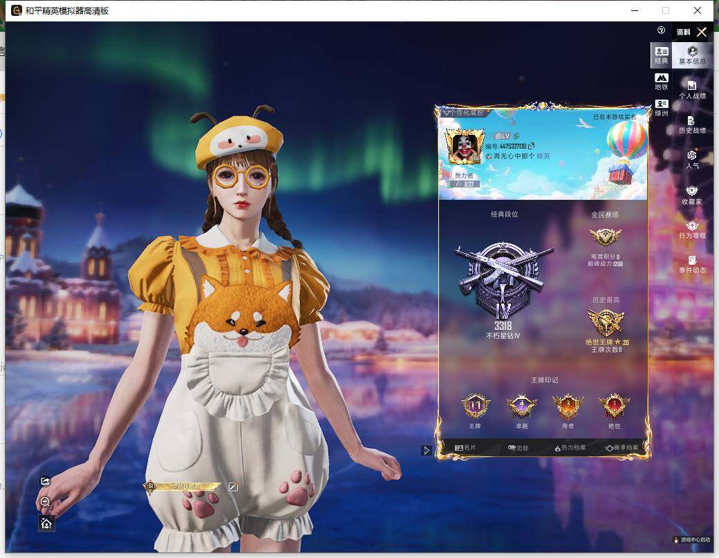 - PX_2103248-贵族等级: V6 英雄数: 124 皮肤数: 289 荣耀水晶: 星域神启 无双皮: 青丘·九尾,碎月剑心,小乔时之魔女,韩信群星魔术团 星传说: 时之愿境,金色仲夏夜,玉鸾吟 传说皮: 绛天战甲,猫影幻舞,炽阳神光,一念神魔,云霓雀翎,末日机甲-孙尚香,仲夏夜之梦,乞巧织情,游龙清影,挚爱之约,挚爱花嫁,无双飞将,记忆之芯,青丘·九尾,大乔-时之奇旅,霜月吟,乘龙·问璇玑,