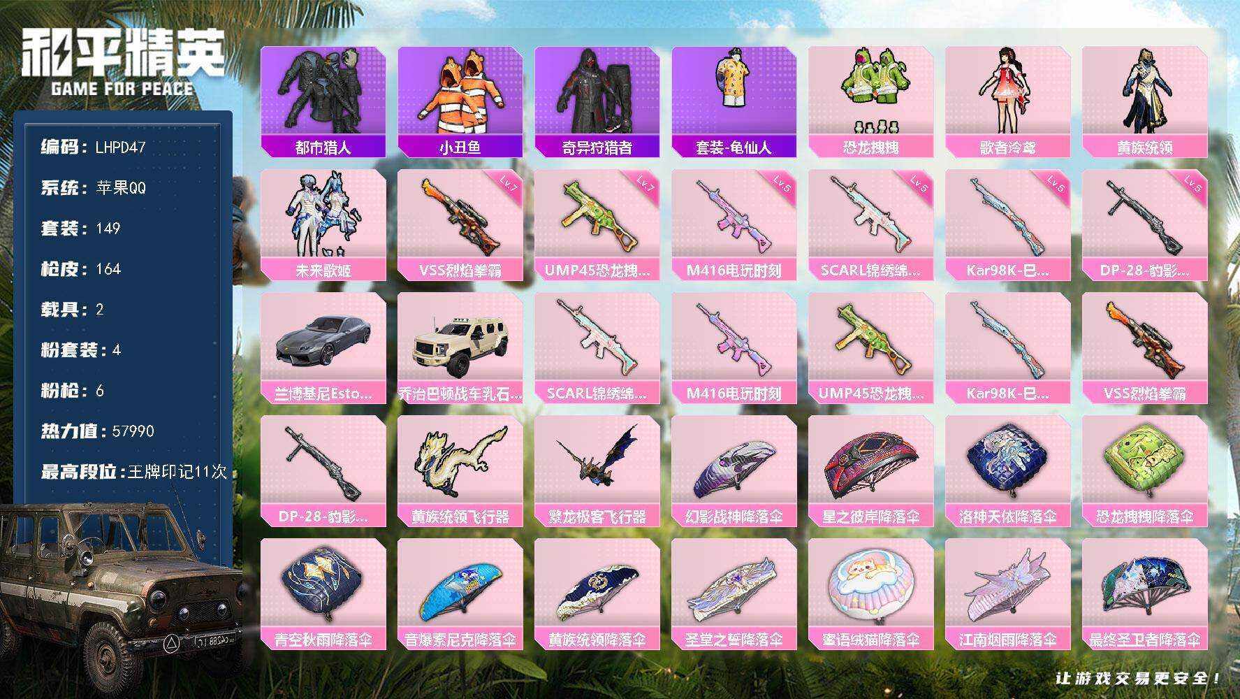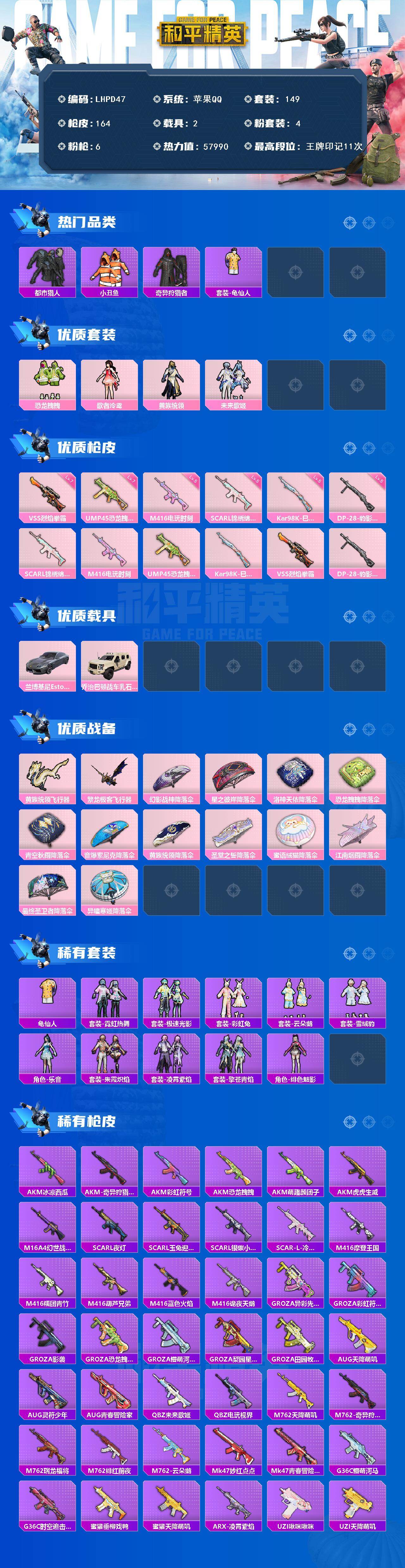 [15557113]【特价出售/店主推荐】苹果 手Q-4粉装-6特效枪-2载具-3粉色飞行器-57990热力值-11王牌印记-149套装-164枪皮【热门品类】:套装-都市猎人,套装-小丑鱼,套装-奇异狩猎者,套装-龟仙人【粉色套装