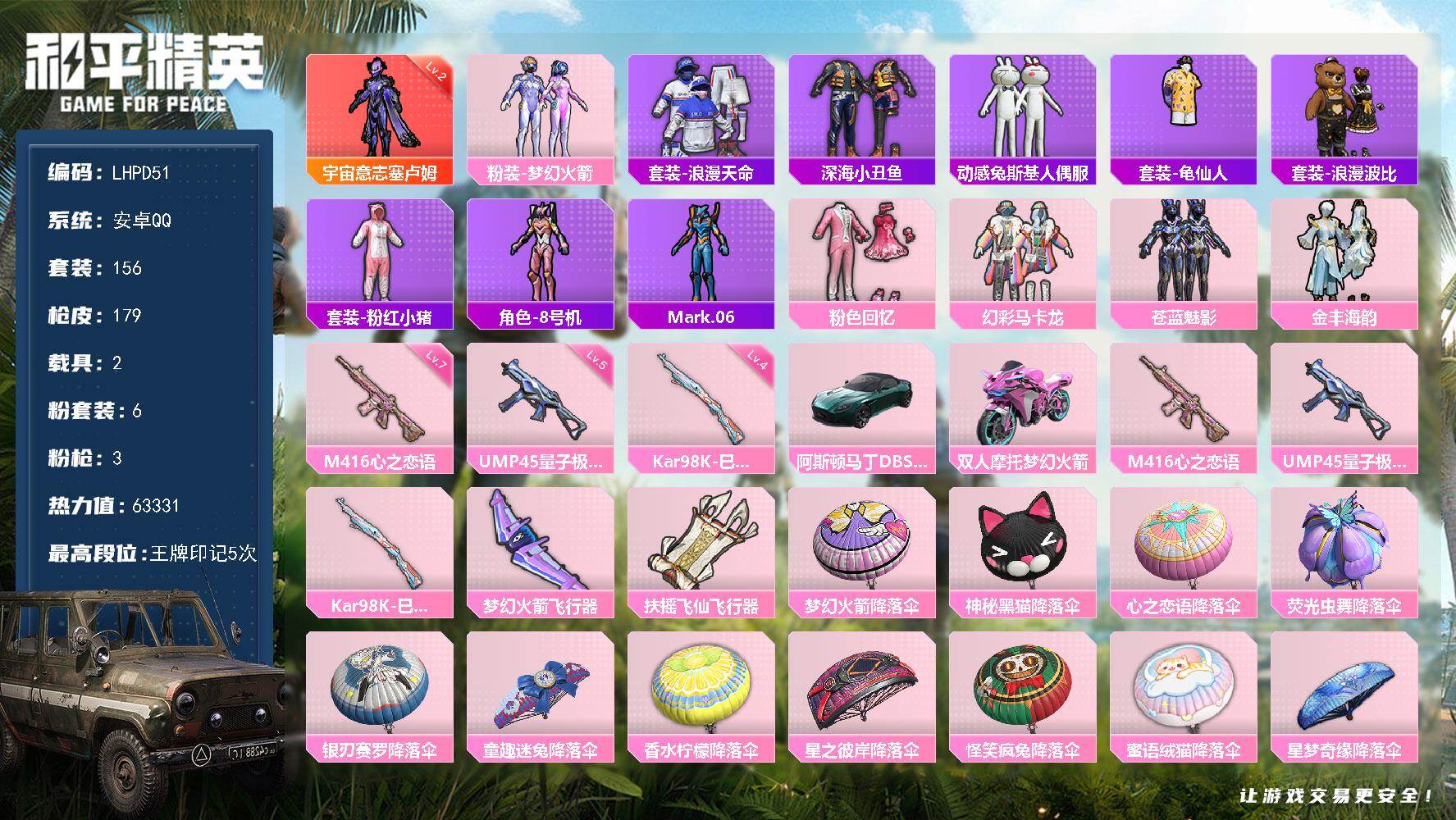 [15557114]【特价出售/店主推荐】安卓 手Q-1神装-6粉装-3特效枪-2载具-2粉色飞行器-63331热力值-5王牌印记-156套装-179枪皮【红色神装等级】:宇宙意志-塞卢姆(二级)【红色角色神装】:宇宙意志-塞卢姆【热门品类】:粉装-梦幻火箭,套装-浪漫天命,套装-深海小丑鱼,套装-动感兔斯基人偶服,套装-龟仙人,套装-浪漫波比,套装-粉红小猪,角色-8号机,角色-Mark.06【粉色套装】:粉装-粉色回忆,粉装-梦幻火箭,粉装-幻彩马卡龙,粉装-苍蓝魅影,粉装-金丰海韵【粉色枪皮等级】:M416-心之恋语(七级),UMP45-量子极限(五级),Kar98K-巳巳如意(四级)【粉色载具】:阿斯顿马丁DBS(绿),双人摩托-梦幻火箭【粉色枪皮】:M416-心之恋语,UMP45-量子极限,Kar98K-巳巳如意【粉色飞行器】:梦幻火箭飞行器,扶摇飞仙飞行器