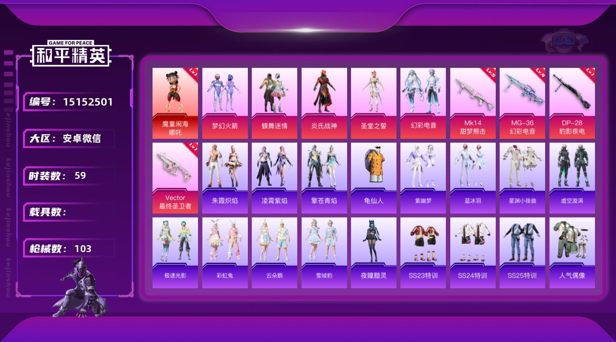 [15152501]特价急出-1414个神装碎片可随意悦换-安卓-1神装-5粉装-4特效枪-0载具-4粉色飞行器-29962热力值-1王牌印记-59套装-103枪皮