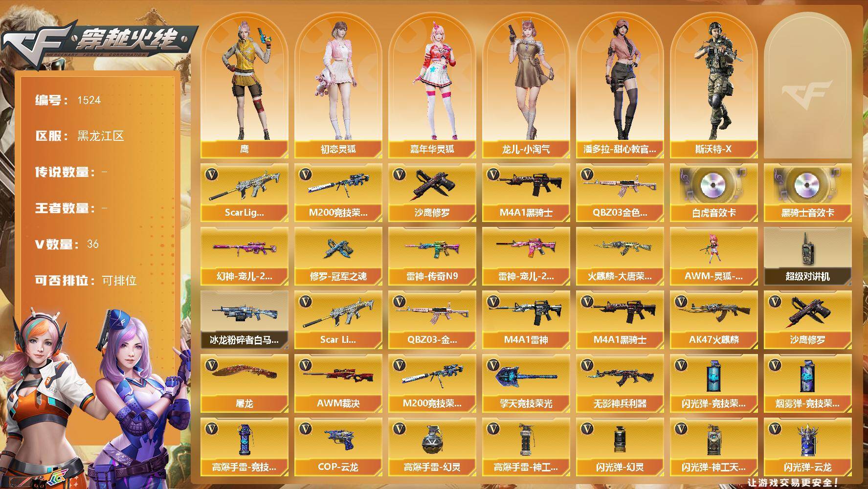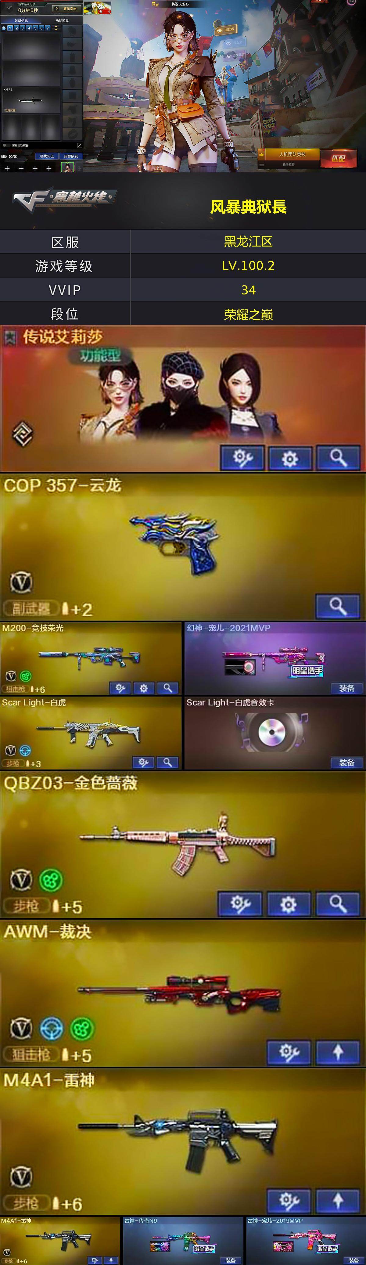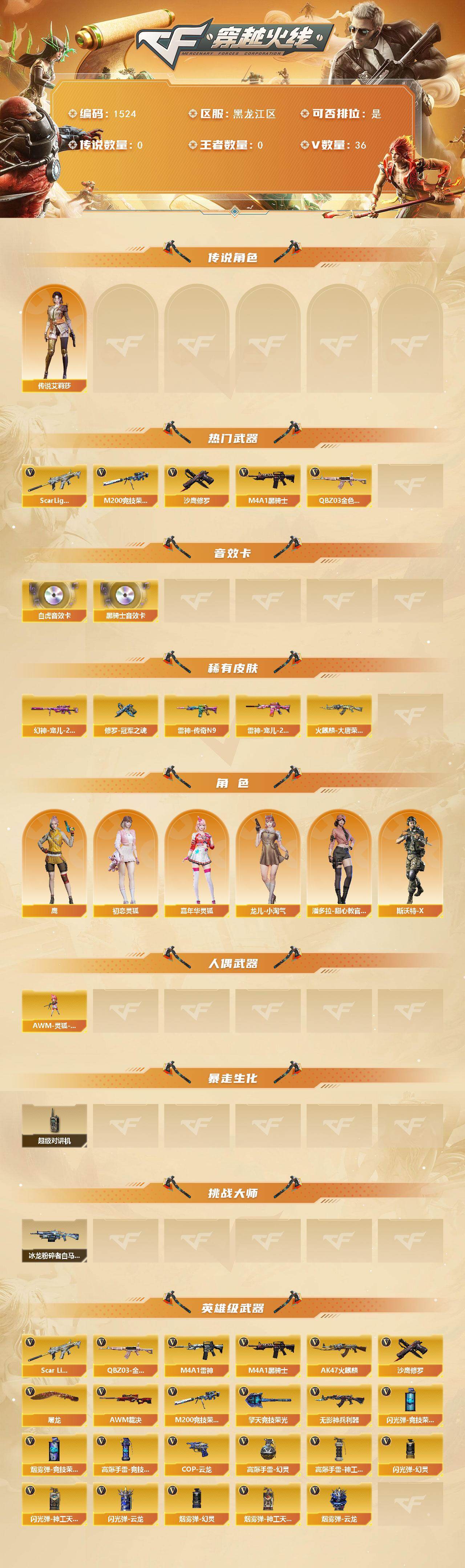[15560319]黑龙江区-36V-0王者-0炫金 【传说角色】:传说艾莉莎 【热门武器】:QBZ03-金色蔷薇,Scar Light-白虎,M200-竞技荣光,M4A1-黑骑士,沙鹰-修罗*2 【音效卡】:M4A1-黑骑士音效卡,Scar Light-白虎音效卡 【皮肤】:幻神-宠儿-2021MVP,雷神-传奇N9,雷神-宠儿-2019MVP,火麒麟-大唐荣光,修罗-冠军之魂 【角色】:鹰,初恋灵狐,嘉年华灵狐,龙儿-小淘气,潘多拉-甜心教官,斯沃特-X 【人偶武器】:AWM-灵狐-15周年嘉年华 【暴走生化】:超级对讲机 【挑战大师】:冰龙粉碎者-白马银枪 【英雄级武器】:AK47-火麒麟,M4A1-雷神*2,M4A1-黑骑士,Scar Light-白虎,无影-神兵利器,QBZ03-金色蔷薇,AWM-裁决,M200-竞技荣光,沙鹰-修罗*2,COP 357-云龙,屠龙*2,擎天-竞技荣光,高爆手雷-幻灵*2,高爆手雷-竞技荣光,高爆手雷-神工天巧*3,闪光弹-幻灵*2,闪光弹-竞技荣光,闪光弹-神工天巧,闪光弹-云龙,烟雾弹-幻灵,烟雾弹-竞技荣光,烟雾弹-神工天巧,烟雾弹-云龙 【道具】:BS战队炫彩背包,云山科技背包,全能枪王背包,虎牙炫彩背包,女皇终结者-魔龙之吻,救世主-黑桃战神,绿色巨人,灵魂忍者,迷雾幽灵,夺命之镰,防化服*3,金色流光-枪王排位*2,星辰流光-枪王排位,枪王排位28赛季金色流光,枪王排位29赛季金色流光,语音特效-机器人,动感闪耀表情,云海游龙表情,EP战队名片,防弹头盔*3,防弹衣*3,C4工具钳*3,手雷包*3 【特殊枪械】:1白虎,1黑骑士