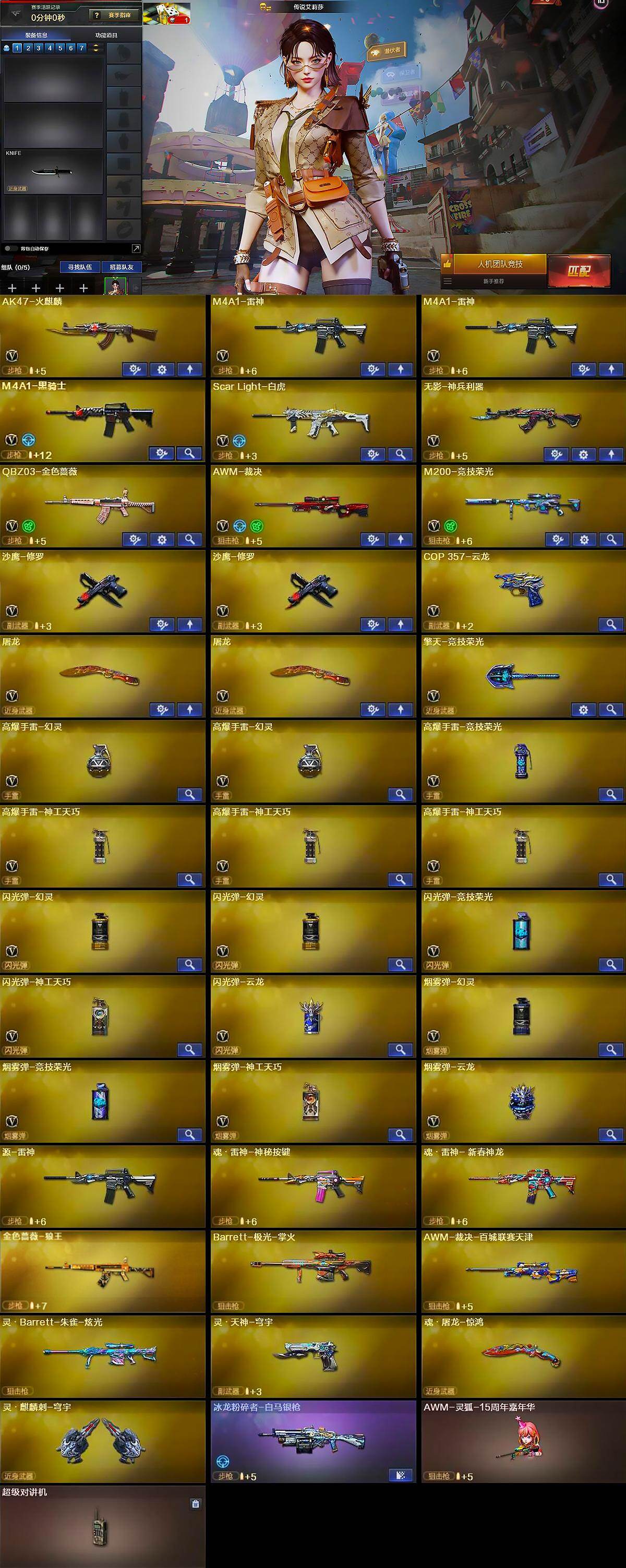 【英雄级武器】:AK47-火麒麟,M4A1-雷神*2,M4A1-黑骑士,Scar Light-白虎,无影-神兵利器,QBZ03-金色蔷薇,AWM-裁决,M200-竞技荣光,沙鹰-修罗*2,COP 357-云龙,屠龙*2,擎天-竞技荣光,高爆手雷-幻灵*2,高爆手雷-竞技荣光,高爆手雷-神工天巧*3,闪光弹-幻灵*2,闪光弹-竞技荣光,闪光弹-神工天巧,闪光弹-云龙,烟雾弹-幻灵,烟雾弹-竞技荣光,烟雾弹-神工天巧,烟雾弹-云龙