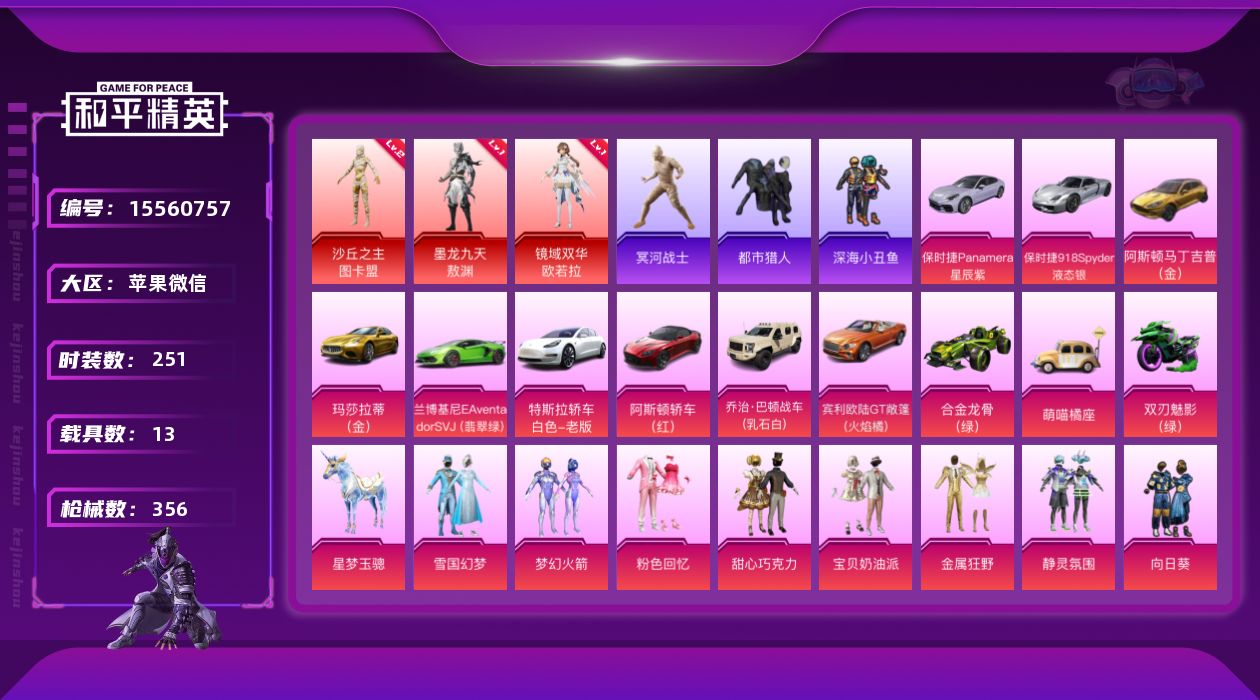 [15560757]老木乃伊/素材号 苹果 微信-无敌战神框-3神装-32粉装-30特效枪-13载具-13粉色飞行器-167033热力值-21王牌印记-251套装-356枪皮【红色神装等级】:墨龙九天-敖渊(一级),镜域双华-欧若拉(一级),沙丘之主-图卡盟(二级)【红色角色神装】:墨龙九天-敖渊,镜域双华-欧若拉,沙丘之主-图卡盟【热门品类】:粉装-雪国幻梦,粉装-梦幻火箭,套装-浪漫天命,套装-都市猎人,套装-冥河战士,套装-深海小丑鱼,角色-忠义严颜,套装-暗影哥特,套装-浪漫波比,角色-8号机,角色-Mark.06,大砍刀-青龙偃月刀,撬棍-龙胆亮银枪【粉色套装】:粉装-粉色回忆,粉装-甜心巧克力,粉装-宝贝奶油派,粉装-雪国幻梦,粉装-梦幻火箭,粉装-金属狂野,粉装-静灵氛围,粉装-向日葵,粉装-甜蜜誓约,粉装-心之恋语,粉装-迷蝶贵族,粉装-星点战士,粉装-草莓生巧,粉装-香水柠檬,粉装-相思残雪,粉装-甜梦冰蝶,粉装-绿野柔风,粉装-馨动时刻,角色-洛天依,粉装-吟月归客,角色-零号机款机体服,粉装-绚金瑰梦,角色-复仇流浪者,粉装-灵感创作师,粉装-千面幻镜,粉装-海螺星光,角色-茉莉星,角色-圣堂之誓,角色-鸢尾晶梦,角色-初号机 觉醒Ver.,粉装-金丰海韵,角色-绯穹魔姬【粉色枪皮等级】:AKM-炫紫旋律(一级),AKM-梦之光华(七级),AKM-绿萝繁花(五级),SCAR-L-天蓬元帅(七级),SCAR-L-纯梦嫁纱(一级),M416-五爪金龙(一级),M416-心之恋语(一级),M416-风花雪月(一级),M416-至情至圣(九级),M416-超新星(一级),M416-电玩时刻(一级),M416-墨龙九天(一级),M416-灵猫魔法师(九级),GROZA-香水柠檬(五级),AUG-许七安(五级),M762-甜蜜誓约(五级),UMP45-雪国精灵(五级),UMP45-相思残雪(七级),Vector-环太平洋(四级),Vector-灵感创作师(一级),P90-沙丘之主(一级),P90-金丰海韵(六级),Kar98K-巳巳如意(四级),M24-镜域双华(三级),Mini14-荧光虫舞(四级),Mk14-精灵梦叶罗丽(五级),MK20-H-海螺星光(四级),M200-伏羲圣卦(五级),MG3-洛神天依(五级【粉色载具】:特斯拉Model 3(珍珠白),兰博基尼Ave