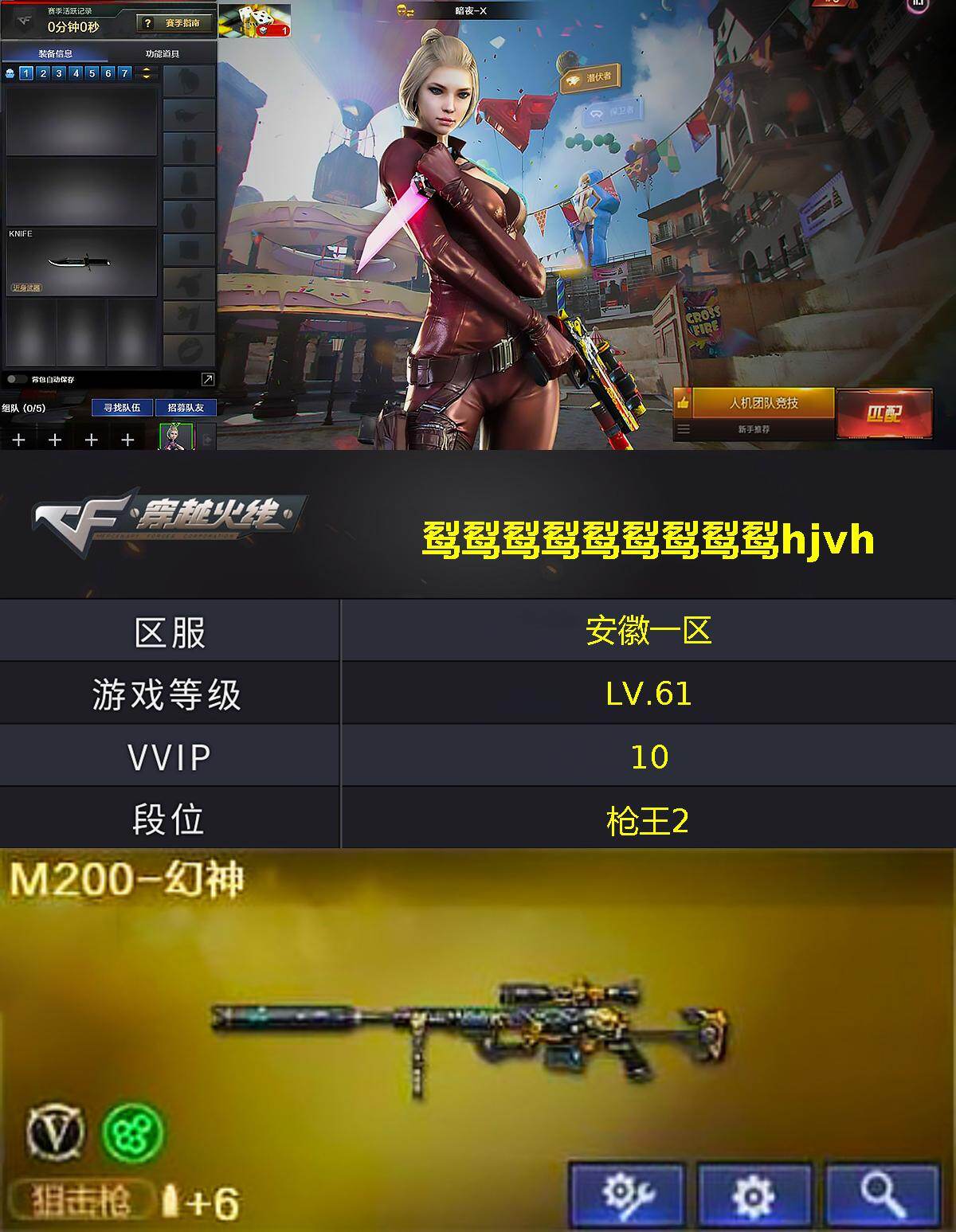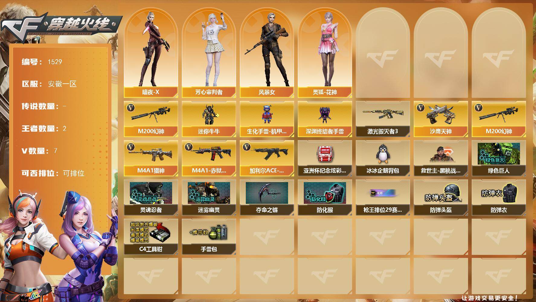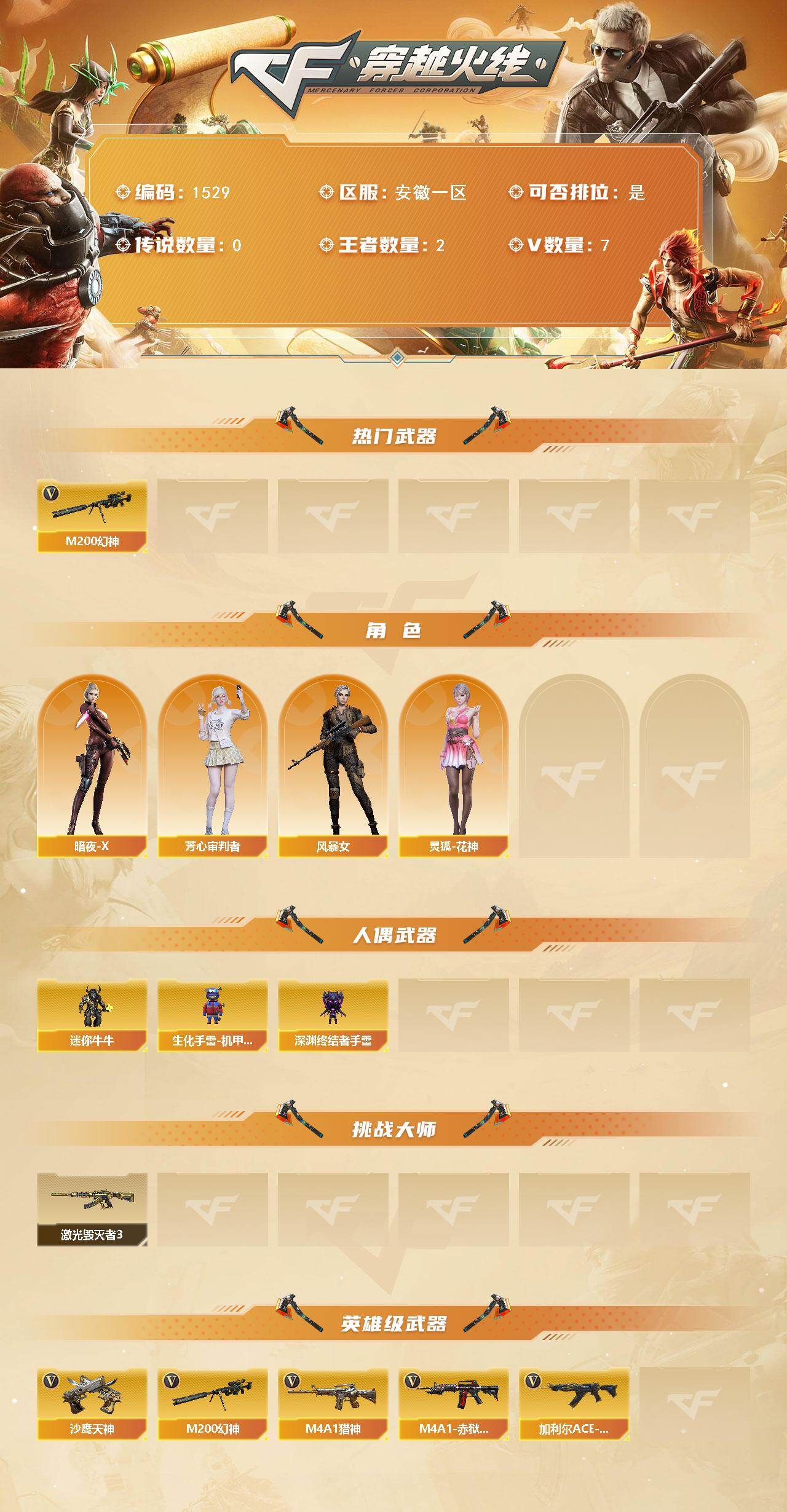 [15560805]安徽一区-7V-2王者-0炫金 【热门武器】:M200-幻神 【角色】:暗夜-X,芳心审判者,风暴女,灵狐-花神 【人偶武器】:迷你牛牛,生化手雷-机甲核心,深渊终结者手雷 【挑战大师】:激光毁灭者III 【英雄级武器】:M4A1-猎神,加利尔ACE-天袭,M200-幻神,沙鹰-天神*3,M4A1-赤狱骑士 【道具】:亚洲杯纪念炫彩背包,冰冰企鹅背包,救世主-黑桃战神,绿色巨人,灵魂忍者,迷雾幽灵,夺命之镰,防化服*2,枪王排位29赛季金色流光,防弹头盔*2,防弹衣*2,C4工具钳*2,手雷包*2 【特殊枪械】:
