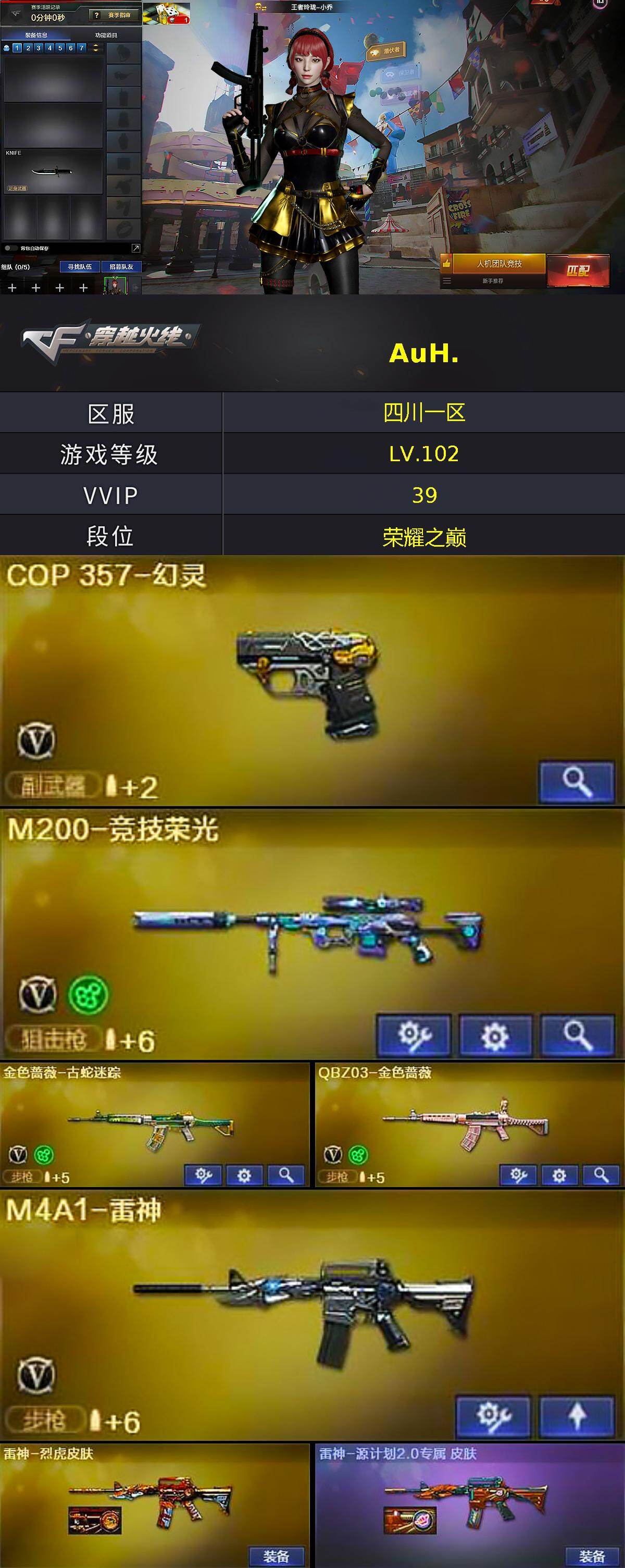 [15562063]四川一区-36V-3王者-0炫金 【热门武器】:QBZ03-金色蔷薇,金色蔷薇-古蛇迷踪,修罗-古蛇迷踪,M200-竞技荣光,加特林-炼狱,COP 357-幻灵,金刚伞 【音效卡】:屠龙-云海游龙音效卡,Barrett-毁灭音效卡 【皮肤】:雷神-烈虎皮肤,雷神-源计划2.0专属 皮肤,火麒麟-雷神,火麒麟-平天大圣,火麒麟-心动糖果,毁灭-黑大圣皮肤,AK47-B-常胜将军-刘备,AK47-B-常胜将军-孙权*2 【角色】:王者玲珑-小乔,蛇隐宗,乔伊教练,云海玲珑,暗夜-X,初恋灵狐,芳心审判者,风暴女*2,虎妞,嘉年华灵狐,娟娟,灵狐者-黄金海岸,灵狐者-七夕宝贝,龙儿-小淘气,麻雀,潘多拉-X,青霞仙子,蛇姬,斯沃特-X,蜀雪,铁骑荣耀,兔囡囡,新娜塔莎,影武者-X 【人偶武器】:迷你钢铁终结者,AWM-灵狐-15周年嘉年华,迷你深渊冰龙,迷你裂空之翼,迷你牛魔王,夺魂*3,迷你生化手雷,生化手雷-机甲核心,闪光弹-貂蝉,高爆手雷-大乔,迷你艾比,灵狐娃娃手雷 【暴走生化】:超级对讲机 【挑战大师】:AK47-冰龙粉碎者,冰龙粉碎者-白马银枪,激光毁灭者III-白马银枪,激光毁灭者III,KAC-圣炎切割者III,神圣爆裂者-末日III 【英雄级武器】:AK47-火麒麟,M4A1-雷神,AK47-黑鲨,无影-神兵利器,金色蔷薇-古蛇迷踪,QBZ03-金色蔷薇,烈火-动感闪耀,AK-47-猩红传说,AK47-B-战神,黑骑士-海王*3,AK47-B-常胜将军,Barrett-毁灭,Barrett-朱雀,M200-竞技荣光,王者之怒-觉醒版,加特林-炼狱,COP 357-幻灵,天神-动感闪耀,修罗-古蛇迷踪,屠龙,幻灵之锋*2,擎天-竞技荣光,屠龙-动感闪耀,王者之啸-觉醒版*2,高爆手雷-幻灵,高爆手雷-竞技荣光,手雷-动感闪耀,高爆手雷-古蛇迷踪,闪光弹-幻灵,闪光弹-竞技荣光,烟雾弹-幻灵,烟雾弹-竞技荣光,烟雾弹-古蛇迷踪 【道具】:AG战队炫彩背包,XROCK炫彩背包,古蛇迷踪炫彩背包,老虎背包,超级背包,女皇终结者-魔龙之吻,救世主-黑桃战神,黄金生化钩,绿色巨人,灵魂忍者,变异宝贝,迷雾幽灵,生化弹匣,夺命之镰,防化服*3,金色流光-枪王排位*2,星辰流光-枪王排位,枪王排位29赛季金色流光,古蛇迷踪打击特效,蛇隐宗表情,动感闪耀表情,防弹头盔*
