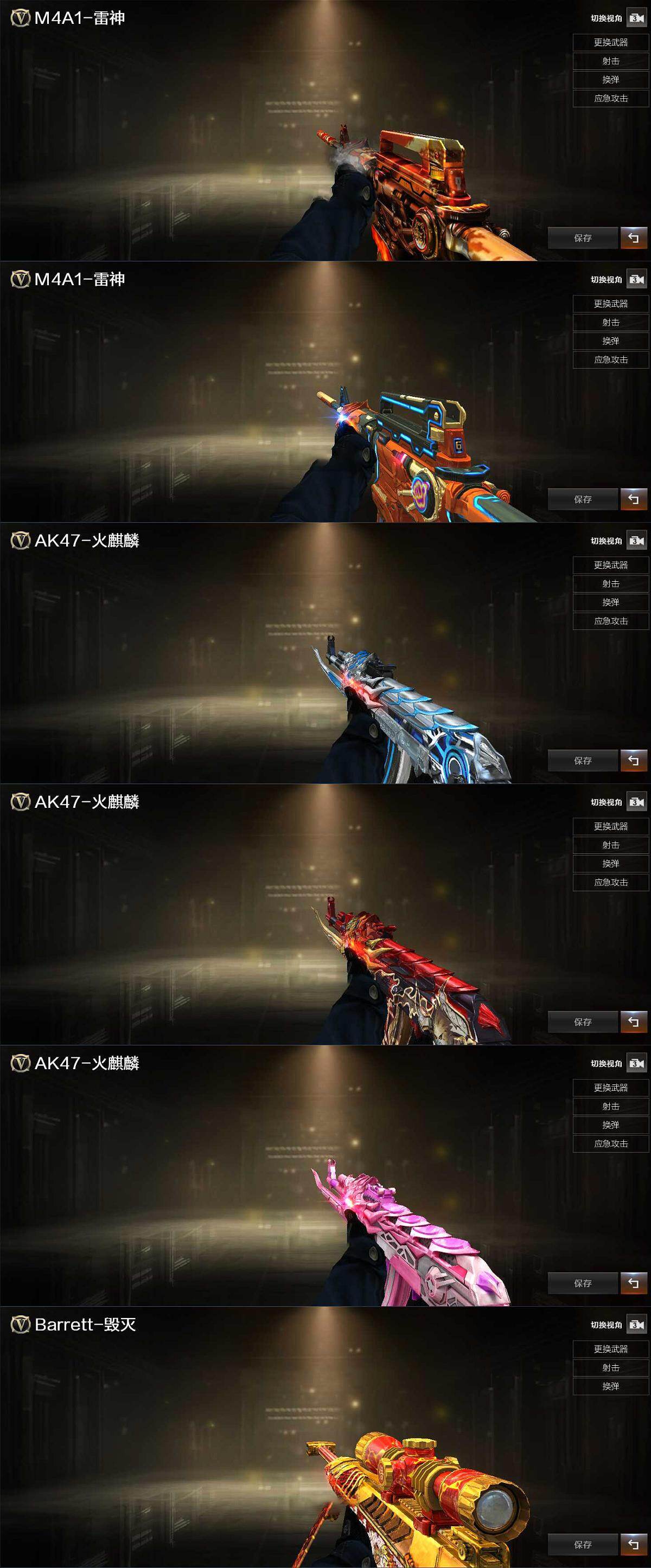 【英雄级武器】:AK47-火麒麟,M4A1-雷神,AK47-黑鲨,无影-神兵利器,金色蔷薇-古蛇迷踪,QBZ03-金色蔷薇,烈火-动感闪耀,AK-47-猩红传说,AK47-B-战神,黑骑士-海王*3,AK47-B-常胜将军,Barrett-毁灭,Barrett-朱雀,M200-竞技荣光,王者之怒-觉醒版,加特林-炼狱,COP 357-幻灵,天神-动感闪耀,修罗-古蛇迷踪,屠龙,幻灵之锋*2,擎天-竞技荣光,屠龙-动感闪耀,王者之啸-觉醒版*2,高爆手雷-幻灵,高爆手雷-竞技荣光,手雷-动感闪耀,高爆手雷-古蛇迷踪,闪光弹-幻灵,闪光弹-竞技荣光,烟雾弹-幻灵,烟雾弹-竞技荣光,烟雾弹-古蛇迷踪