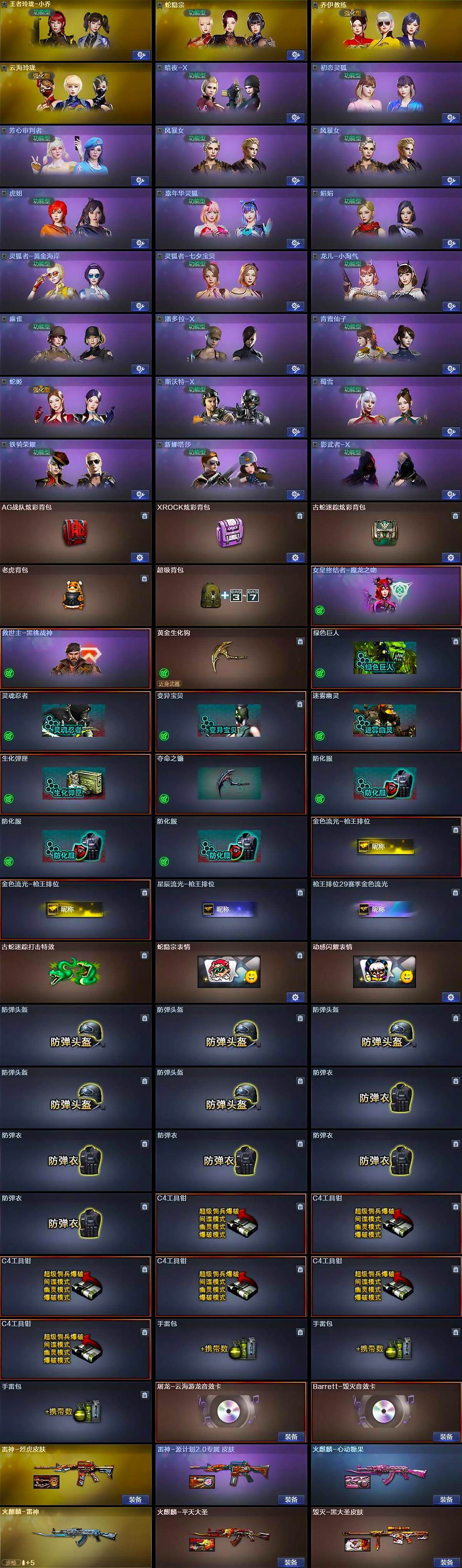 【道具】:AG战队炫彩背包,XROCK炫彩背包,古蛇迷踪炫彩背包,老虎背包,超级背包,女皇终结者-魔龙之吻,救世主-黑桃战神,黄金生化钩,绿色巨人,灵魂忍者,变异宝贝,迷雾幽灵,生化弹匣,夺命之镰,防化服*3,金色流光-枪王排位*2,星辰流光-枪王排位,枪王排位29赛季金色流光,古蛇迷踪打击特效,蛇隐宗表情,动感闪耀表情,防弹头盔*