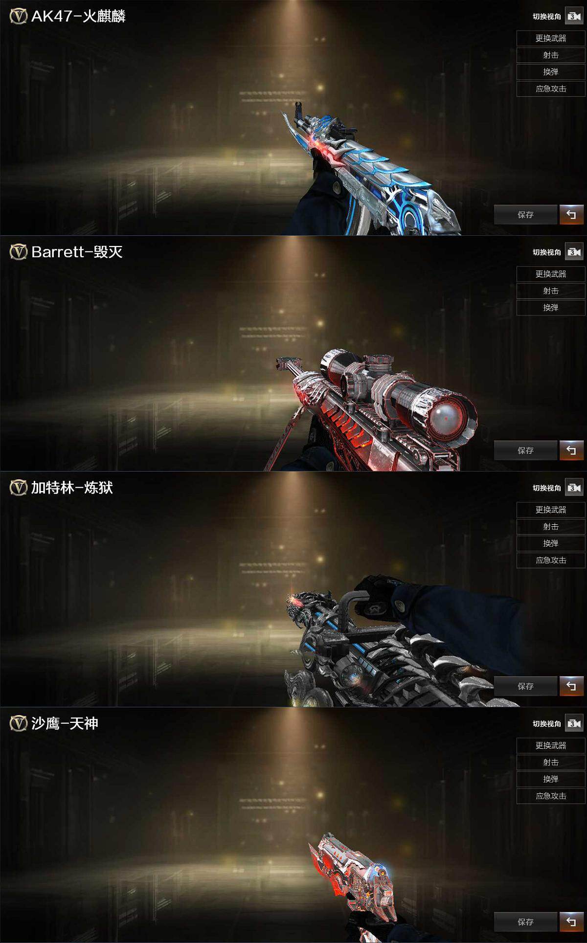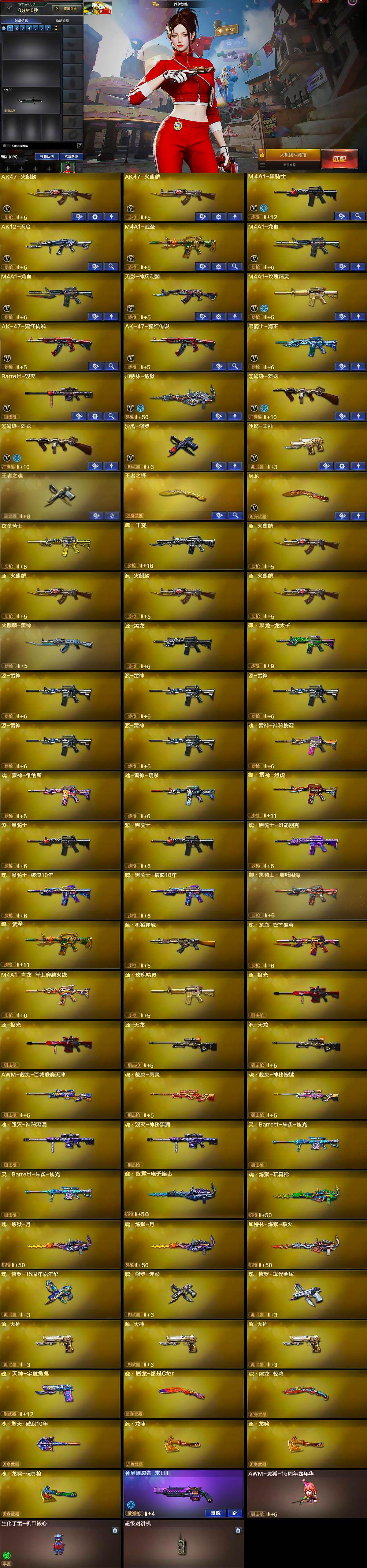 【英雄级武器】:AK47-火麒麟*2,M4A1-黑骑士,AK12-天启,M4A1-武圣,M4A1-龙血*2,无影-神兵利器,M4A1-玫瑰精灵,AK-47-猩红传说*2,黑骑士-海王,Barrett-毁灭,加特林-炼狱,汤姆逊-烈龙*2,沙鹰-修罗,沙鹰-天神,屠龙