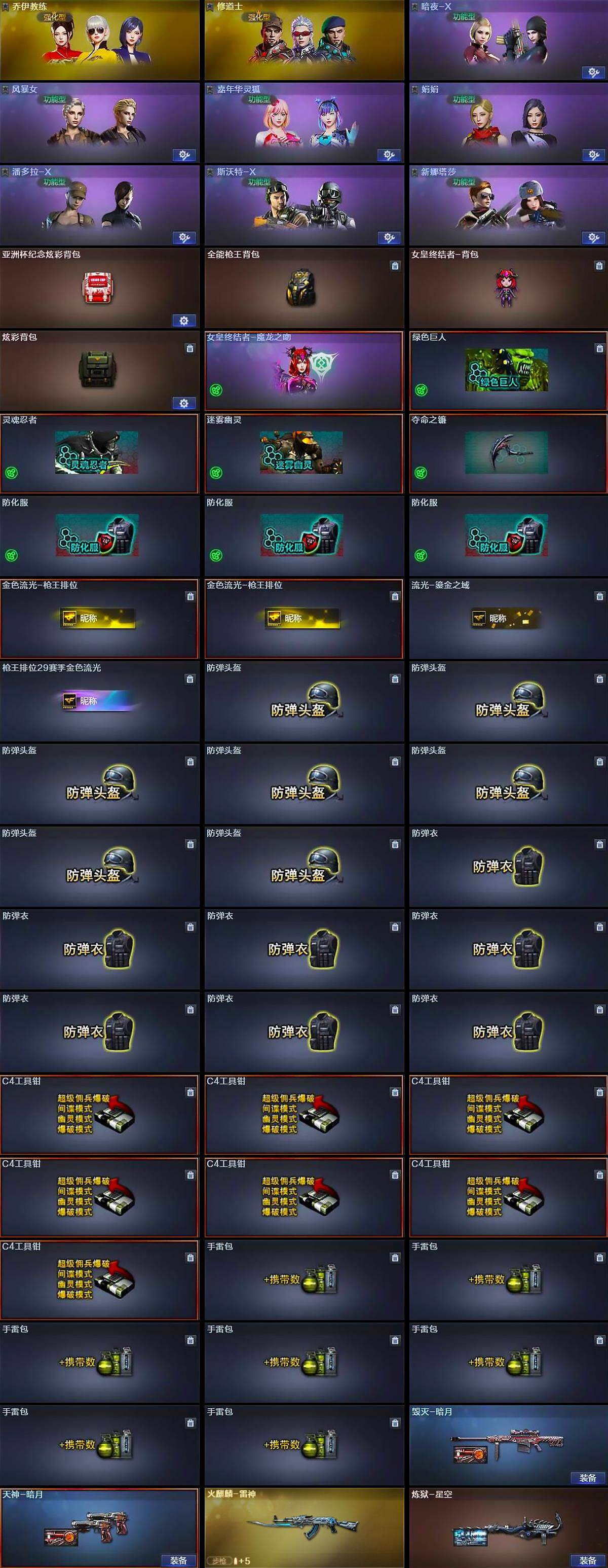 【道具】:亚洲杯纪念炫彩背包,全能枪王背包,女皇终结者-背包,炫彩背包,女皇终结者-魔龙之吻,绿色巨人,灵魂忍者,迷雾幽灵,夺命之镰,防化服*3,金色流光-枪王排位*2,流光-鎏金之域,枪王排位29赛季金色流光,防弹头盔*7,防弹衣*7,C4工具钳*7,手雷包*7