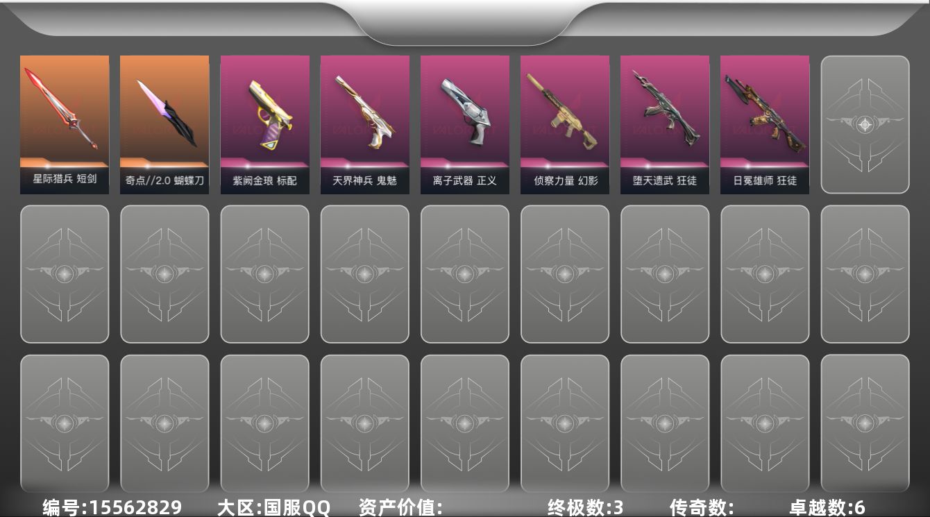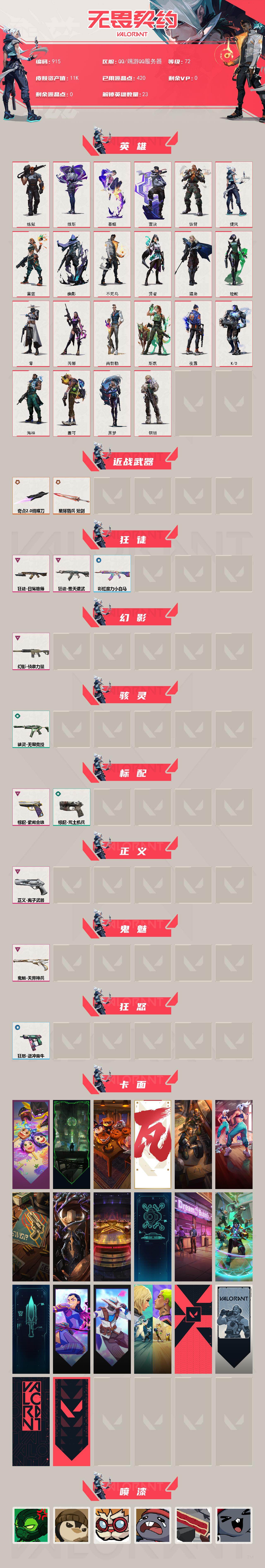 [15562829]【英雄】:炼狱,维斯,暮蝶,壹决,铁臂,捷风,雷兹,幽影,不死鸟,贤者,猎枭,蝰蛇,零,芮娜,尚勃勒,斯凯,夜露,K/O,海神,盖可,黑梦,钢锁 【近战武器】:近战武器-奇点//2.0 蝴蝶刀,近战武器-星际猎兵 短剑 【狂徒】:狂徒-堕天遗武,狂徒-日冕雄师,狂徒-彩虹魔力小白马 【幻影】:幻影-侦察力量 【骇灵】:骇灵-无限竞技 【标配】:标配-紫阙金琅,标配-荒土机兵 【正义】:正义-离子武器 【鬼魅】:鬼魅-天界神兵 【狂怒】:狂怒-逆冲蛮牛 【卡面】:瓦娃脸雪糕 P2 卡面,欢迎来到底城 卡面,南瓜盛典 卡面,VCT CN首冠 卡面,修车达人 卡面,热舞环节 卡面,正义的化身 卡面,时间到 卡面,最高舞台 卡面,声感陷阱设计图 卡面,梦幻奶茶 卡面,哨卫者之领域 卡面,零点嗅探设计图 卡面,无畏契约GO!第一卷:芮娜 卡面,无畏契约GO!第一卷:零 卡面,钢锁vs盖可 卡面,代号红色 卡面,新兵报到 卡面,V契约 卡面,无畏契约 卡面 【喷漆】:独守蝰腹 喷漆,通缉:战术企鹅 喷漆,都算到了 喷漆,熊抱 喷漆,蛋糕还是爆能器? 喷漆,超级粉丝 喷漆,捷风差距 喷漆,拼一枪 喷漆,买装还是存钱 喷漆,胜利属于无畏契约 喷漆,GLHF 喷漆,无畏契约 喷漆 【挂饰】:水壶 挂饰,熔岩灯 挂饰,瞬云履 挂饰,第九季//第二幕 纪念币 挂饰,袖珍捷风 挂饰,Z世代特饮 挂饰,第九季//第一幕 纪念币 挂饰,第八季//第三幕 纪念币 挂饰,天外飞客 挂饰,《双城之战》魄罗 挂饰,无畏契约 纪念币 挂饰