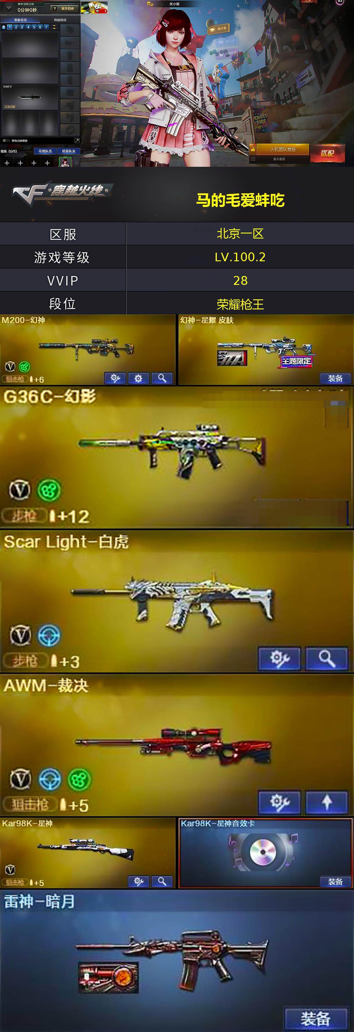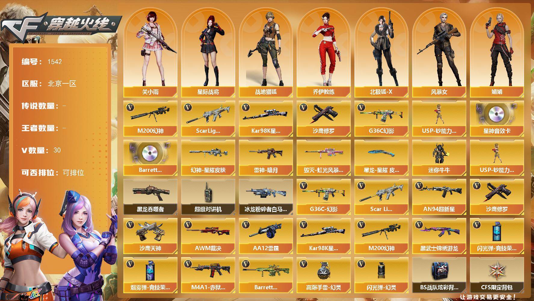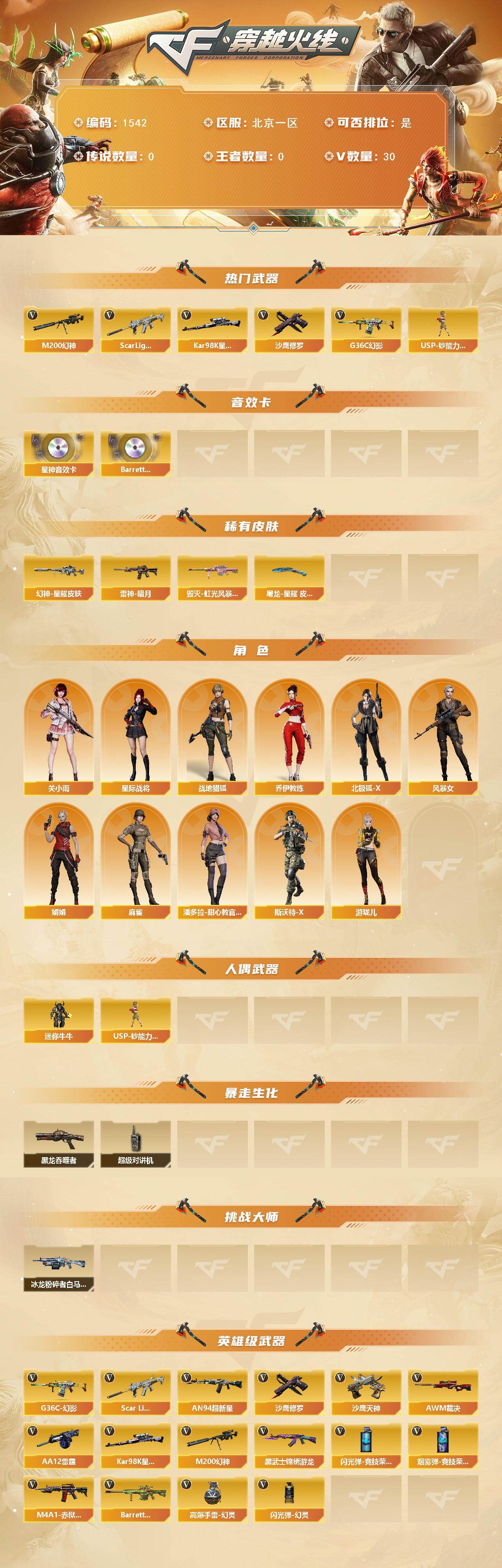 [15563305]北京一区-30V-0王者-0炫金 【热门武器】:G36C-幻影,Scar Light-白虎,M200-幻神,Kar98K-星神,USP-钞能力灵狐,沙鹰-修罗*2 【音效卡】:Kar98K-星神音效卡,Barrett-碧霄极光音效卡 【皮肤】:幻神-星耀 皮肤,雷神-暗月,毁灭-虹光风暴 皮肤,屠龙-星耀 皮肤 【角色】:关小雨,星际战将,战地猎狐,乔伊教练,北极狐-X,风暴女,娟娟,麻雀,潘多拉-甜心教官,斯沃特-X,游珑儿 【人偶武器】:USP-钞能力灵狐,迷你牛牛 【暴走生化】:黑龙吞噬者,超级对讲机 【挑战大师】:冰龙粉碎者-白马银枪 【英雄级武器】:AN94-超新星,Scar Light-白虎,G36C-幻影,黑武士-锦绣游龙,AWM-裁决,M200-幻神,Kar98K-星神,AA-12-雷霆,沙鹰-修罗*2,沙鹰-天神*4,高爆手雷-幻灵,闪光弹-幻灵,闪光弹-竞技荣光,烟雾弹-竞技荣光,M4A1-赤狱骑士,Barrett-碧霄极光*2 【道具】:BS战队炫彩背包,CFS限定背包,亚洲杯纪念炫彩背包,超级背包,终极猎手-荒漠刀客,女皇终结者-魔龙之吻,救世主-黑桃战神,绿色巨人,灵魂忍者,迷雾幽灵,生化弹匣,夺命之镰,防化服*3,星辰流光-枪王排位,防弹头盔*3,防弹衣*3,C4工具钳*3,手雷包*3 【特殊枪械】:1白虎