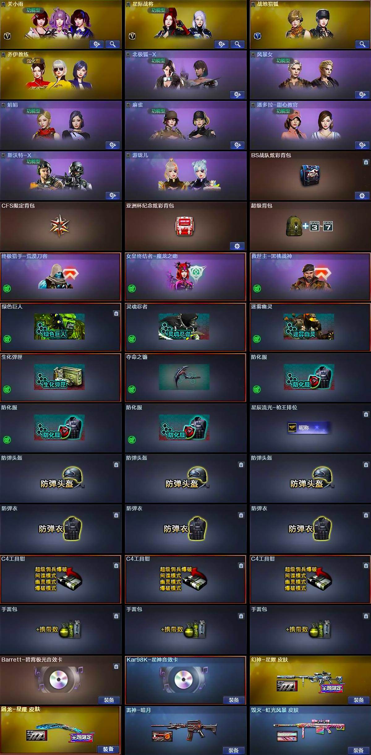 【道具】:BS战队炫彩背包,CFS限定背包,亚洲杯纪念炫彩背包,超级背包,终极猎手-荒漠刀客,女皇终结者-魔龙之吻,救世主-黑桃战神,绿色巨人,灵魂忍者,迷雾幽灵,生化弹匣,夺命之镰,防化服*3,星辰流光-枪王排位,防弹头盔*3,防弹衣*3,C4工具钳*3,手雷包*3