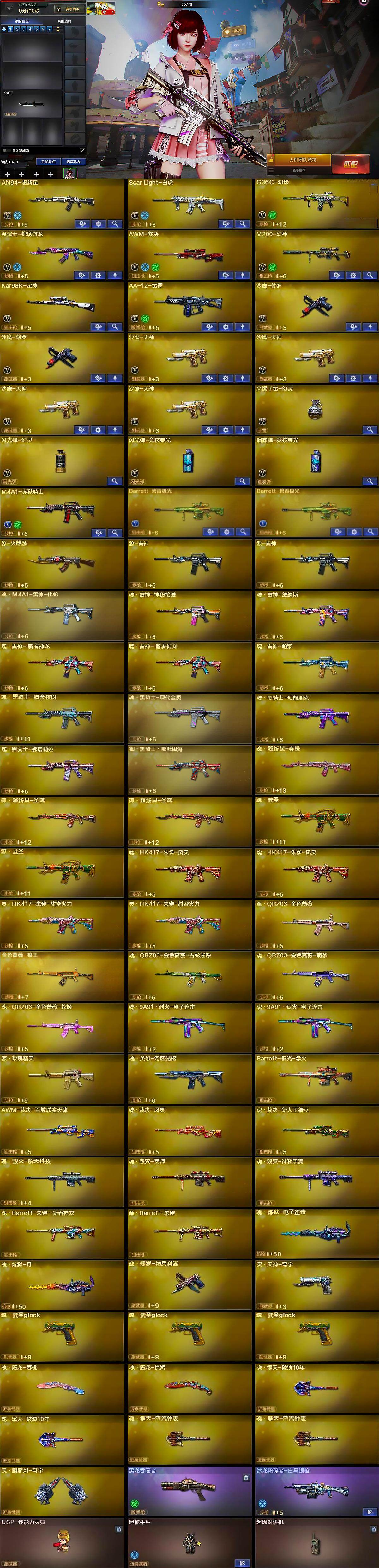 【英雄级武器】:AN94-超新星,Scar Light-白虎,G36C-幻影,黑武士-锦绣游龙,AWM-裁决,M200-幻神,Kar98K-星神,AA-12-雷霆,沙鹰-修罗*2,沙鹰-天神*4,高爆手雷-幻灵,闪光弹-幻灵,闪光弹-竞技荣光,烟雾弹-竞技荣光,M4A1-赤狱骑士,Barrett-碧霄极光*2
