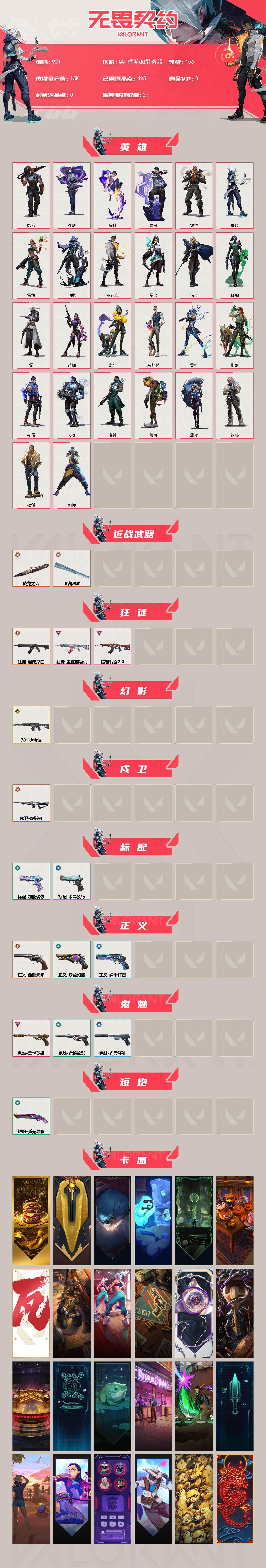 [15563480]【英雄】:幻棱,炼狱,维斯,暮蝶,钛狐,壹决,铁臂,捷风,雷兹,幽影,不死鸟,贤者,猎枭,蝰蛇,零,芮娜,奇乐,尚勃勒,霓虹,斯凯,夜露,K/O,海神,盖可,黑梦,钢锁 【近战武器】:近战武器-威龙之刃,近战武器-澄湖潋滟 【狂徒】:狂徒-混沌序曲,狂徒-般若假面//2.0,狂徒-盖亚的复仇 【幻影】:幻影-781-A协议 【戍卫】:戍卫-噬影者 【标配】:标配-超能偶像,标配-杀毒执行 【正义】:正义-西部未来,正义-沙尘幻旅,正义-纳米打击 【鬼魅】:鬼魅-盖世英雄,鬼魅-诡秘蛇影,鬼魅-光导纤维 【短炮】:短炮-弧光异彩 【卡面】:终章:激斗汉堡 卡面,进入射程 卡面,《双城之战》拥抱 卡面,精灵大战 卡面,欢迎来到底城 卡面,南瓜盛典 卡面,VCT CN首冠 卡面,修车达人 卡面,热舞环节 卡面,正义的化身 卡面,铁之华 卡面,时间到 卡面,最高舞台 卡面,声感陷阱设计图 卡面,霓帧牛蛙 卡面,梦幻奶茶 卡面,源能反应 卡面,零点嗅探设计图 卡面,沙雕爆能器 卡面,无畏契约GO!第一卷:芮娜 卡面,清除名单 卡面,无畏契约GO!第一卷:零 卡面,终章:同步耍酷 卡面,龍记 卡面,化茧成蝶 卡面,完美调谐 卡面 ,暗枪 卡面,终章:黑影先生的咖啡! 卡面,铁臂vs雷兹 卡面,夯实根基 卡面,"Luie" 卡面,热烈欢迎 卡面,铁臂设计图 卡面,代号红色 卡面,冰淇淋店 卡面,新兵报到 卡面,友军火力 卡面,V契约 卡面,无畏契约 卡面 【喷漆】:嗨宝南瓜灯 喷漆,嘭! 喷漆,都算到了 喷漆,控场勿近 喷漆,小丑猫 喷漆,熊抱 喷漆,蛋糕还是爆能器? 喷漆,超级粉丝 喷漆,捷风差距 喷漆,惊声尖叫 喷漆,拼一枪 喷漆,加油!加油! 喷漆,我觉得不行 喷漆,我的刀呢? 喷漆,UWU 喷漆,新潮流 喷漆,双击点赞 喷漆,买装还是存钱 喷漆,醒狮贺春 喷漆,旅行小熊 喷漆,蕊形灯 喷漆,凌空惊吓 喷漆,老铁困了 喷漆,口袋贤者 喷漆,胜利属于无畏契约 喷漆,GLHF 喷漆,无畏契约 喷漆 【挂饰】:终章:猫猫木乃伊 挂饰,悠闲鸡块 挂饰,伞绳 挂饰,《双城之战》小蛋糕 挂饰,第九季//第三幕 纪念币 挂饰,无畏契约GO!第一卷 芮娜 挂饰,无畏契约GO!第一卷 零 挂饰,鱼骨头 挂饰,熔岩灯 挂饰,瞬云履 挂饰,第九季//第二幕 纪念币 挂饰,终章:这瓜保熟 挂饰,