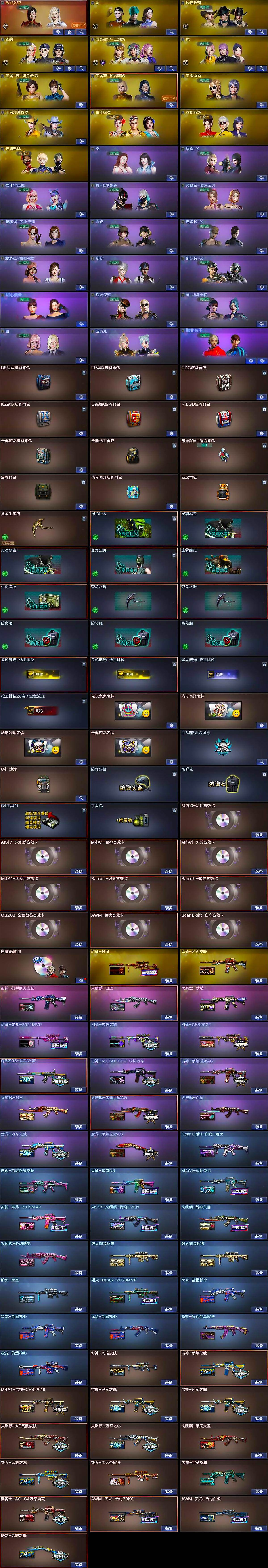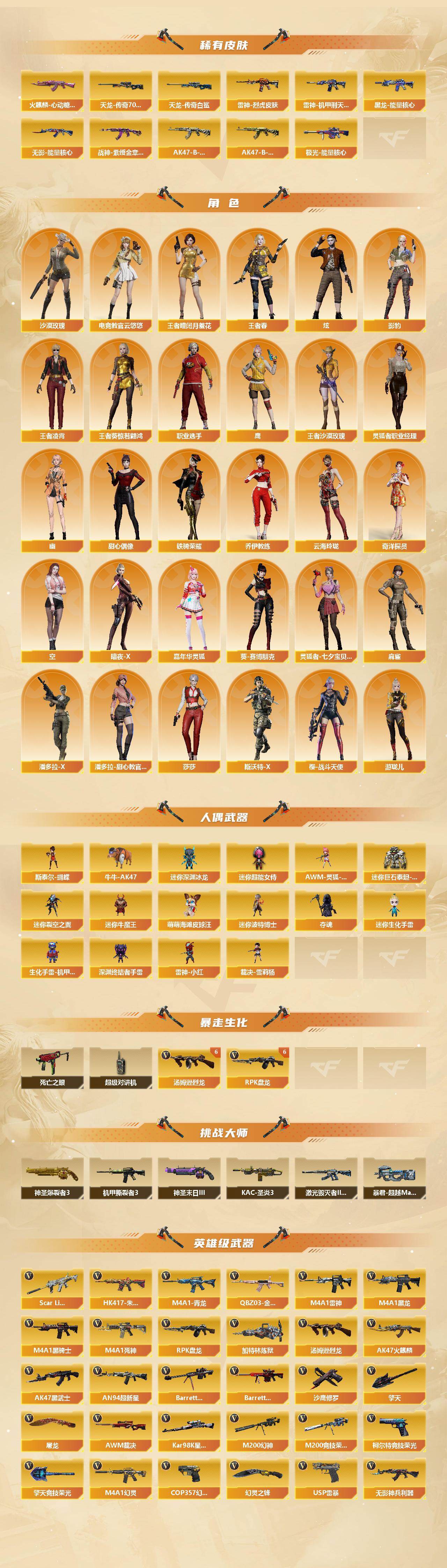 【皮肤】:幻神-周瑜皮肤,幻神-丹凤,幻神-宠儿-2021MVP,幻神-巅峰荣耀,幻神-CFS2022,Scar Light-白虎-暗星,白虎-电玩粉兔皮肤,QBZ03-冠军之薇,雷神-荣耀之魄,M4A1-雷神-CFS 2019,雷神-冠军之魄*2,雷神-传奇N9,M4A1-战神赵云,雷神-宠儿-2019MVP,雷神-R.LGD-CFPLS18冠军,雷神-烈虎皮肤,雷神-荣耀世冠AG,雷神-机甲刑天皮肤,火麒麟-AG战队皮肤,火麒麟-冠军之心,AK47-火麒麟-传奇EVEN,火麒麟-战神关羽,火麒麟-平天大圣,火麒麟-盘古,火麒麟-白虎,火麒麟-荣耀世冠AG,火麒麟-百城,火麒麟-心动糖果,毁灭-荣耀之怒,毁灭耀金皮肤*2,毁灭-星空,毁灭-BEAN-2020MVP,毁灭-黑大圣皮肤,黑龙-能量核心*2,黑龙-墨子皮肤,黑龙-冠军之武,黑骑士-伏羲,黑骑士-AG-S4冠军典藏,无影-能量核心,战神-紫绶金章皮肤,AK47-B-常胜将军-刘备,AK47-B-常胜将军-孙权,AWM-天龙-传奇70KG,AWM-天龙-传奇白鲨,极光-能量核心,屠龙-荣耀