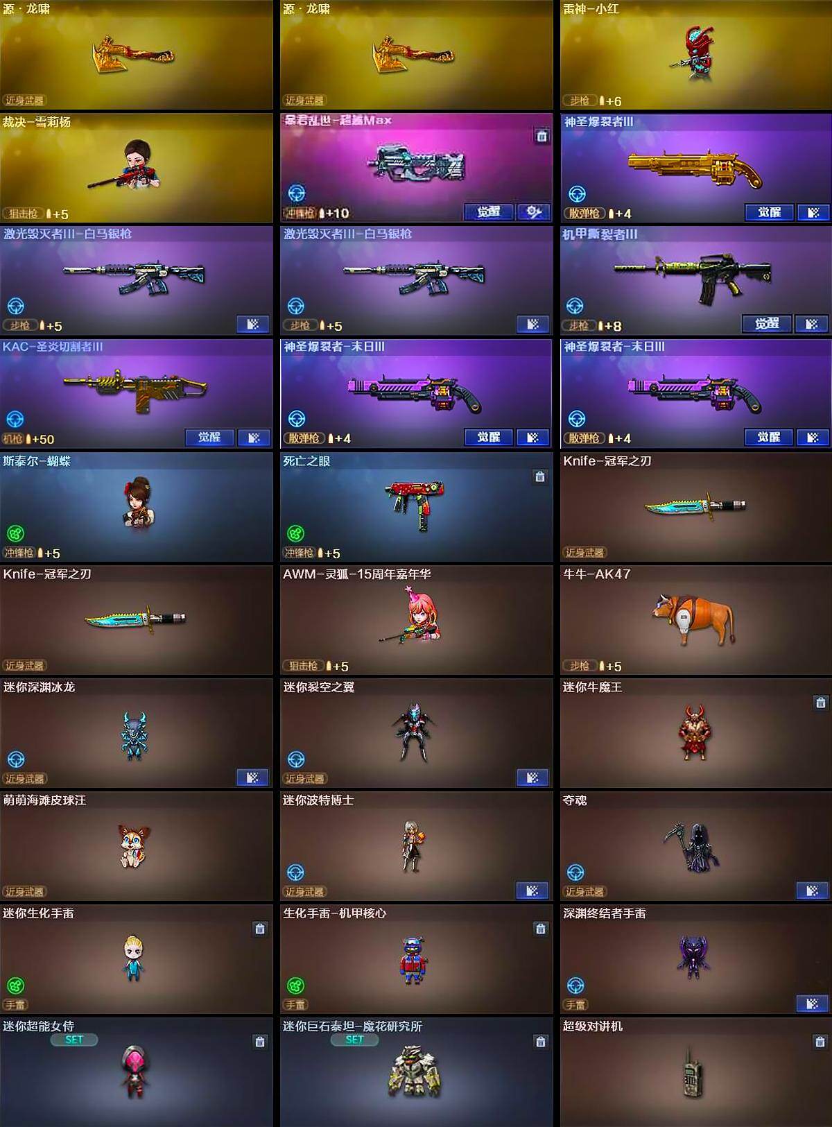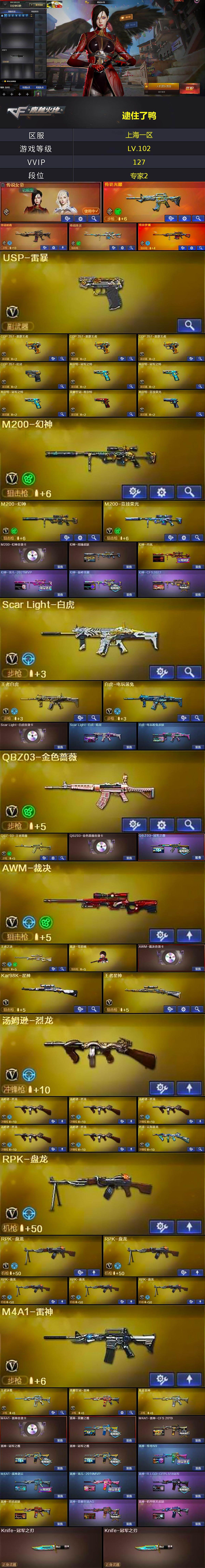 【热门武器】:传说光耀,传说暗裔,传说梦魇,传说圣灵,QBZ03-金色蔷薇,Scar Light-白虎,HK417-朱雀,M4A1-青龙,M200-幻神*2,M200-竞技荣光,死亡之眼,荣耀世冠-火麒麟,荣耀世冠-雷神,白虎-电玩蓝兔,柯尔特-冠军之特*3,荣耀世冠-柯尔特,Kar98K-星神,牛牛-AK47,M4A1-黑骑士*2,汤姆逊-烈龙*6,RPK-盘龙*6,加特林-炼狱*2,斯泰尔-蝴蝶,羊驼玩偶*3,雷神-小红,裁决-雪莉杨,USP-雷暴,COP 357-幻灵,沙鹰-修罗*3,Knife-冠军之刃*2,荣耀世冠-龙啸,黄金猫猫手套-白鲨