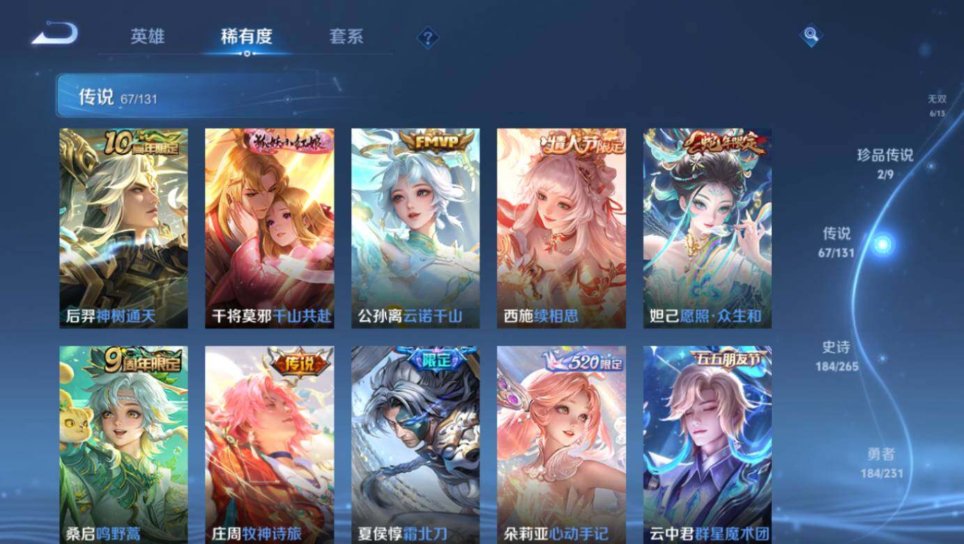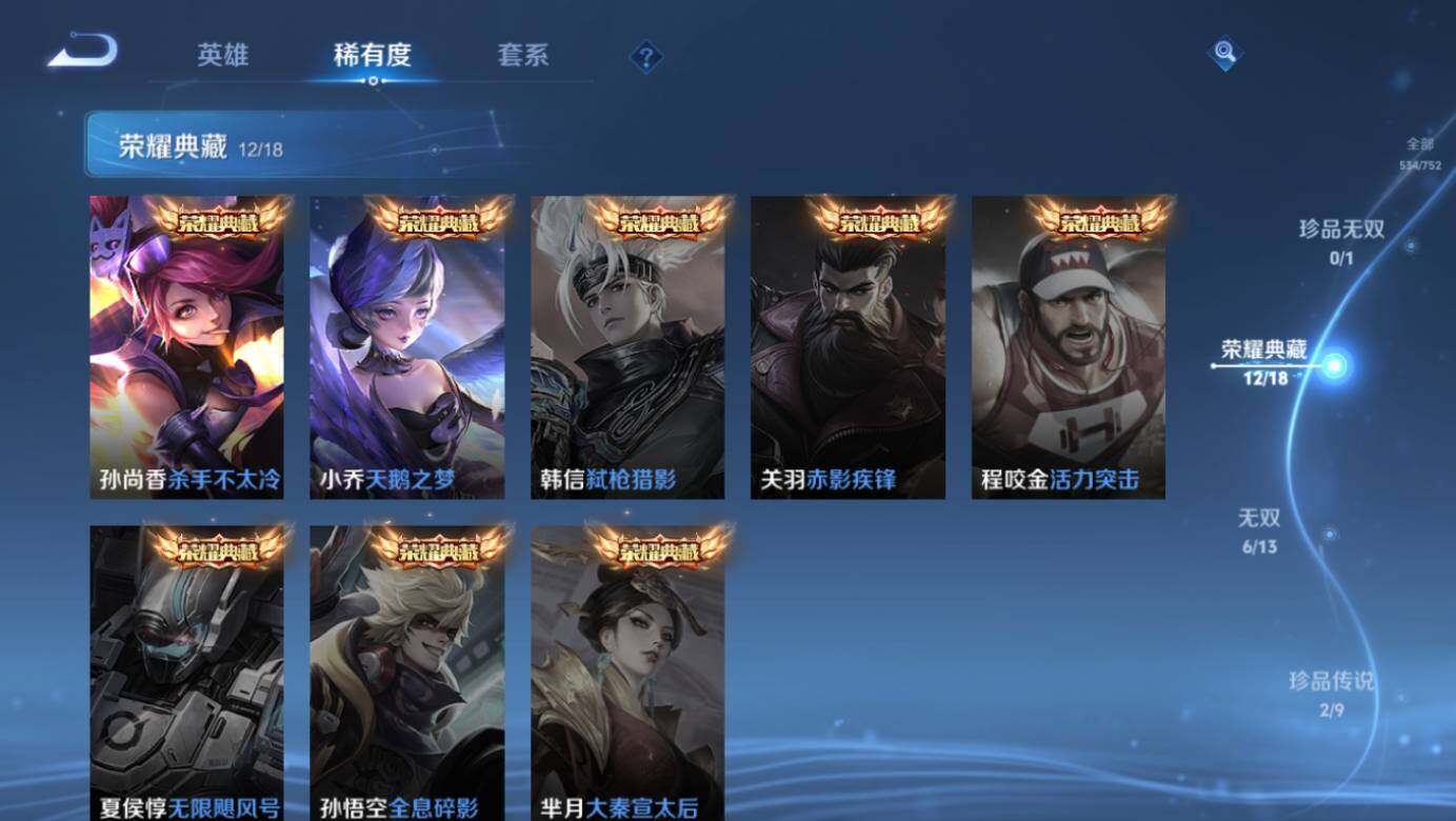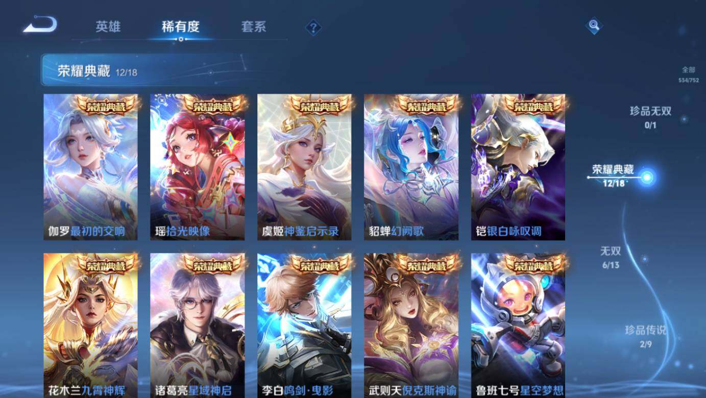 【荣耀典藏】:武则天英雄,武则天倪克斯神谕,小乔天鹅之梦,孙尚香杀手不太冷,鲁班七号星空梦想,李白鸣剑曳影,诸葛亮星域神启,花木兰九霄神辉,铠银白咏叹调,貂蝉幻阙歌,虞姬神鉴启示录,瑶拾光映像,伽罗最初的交响