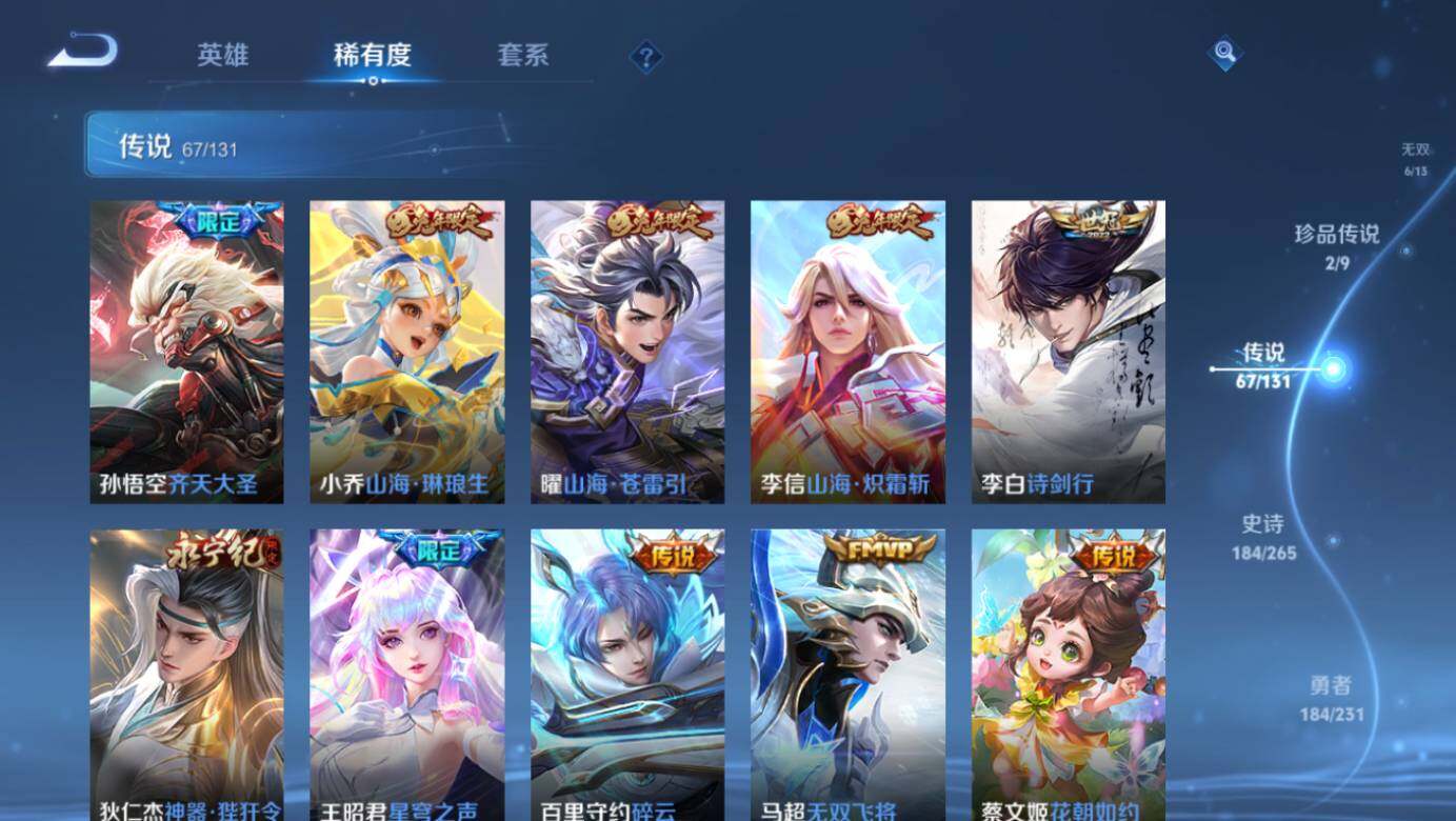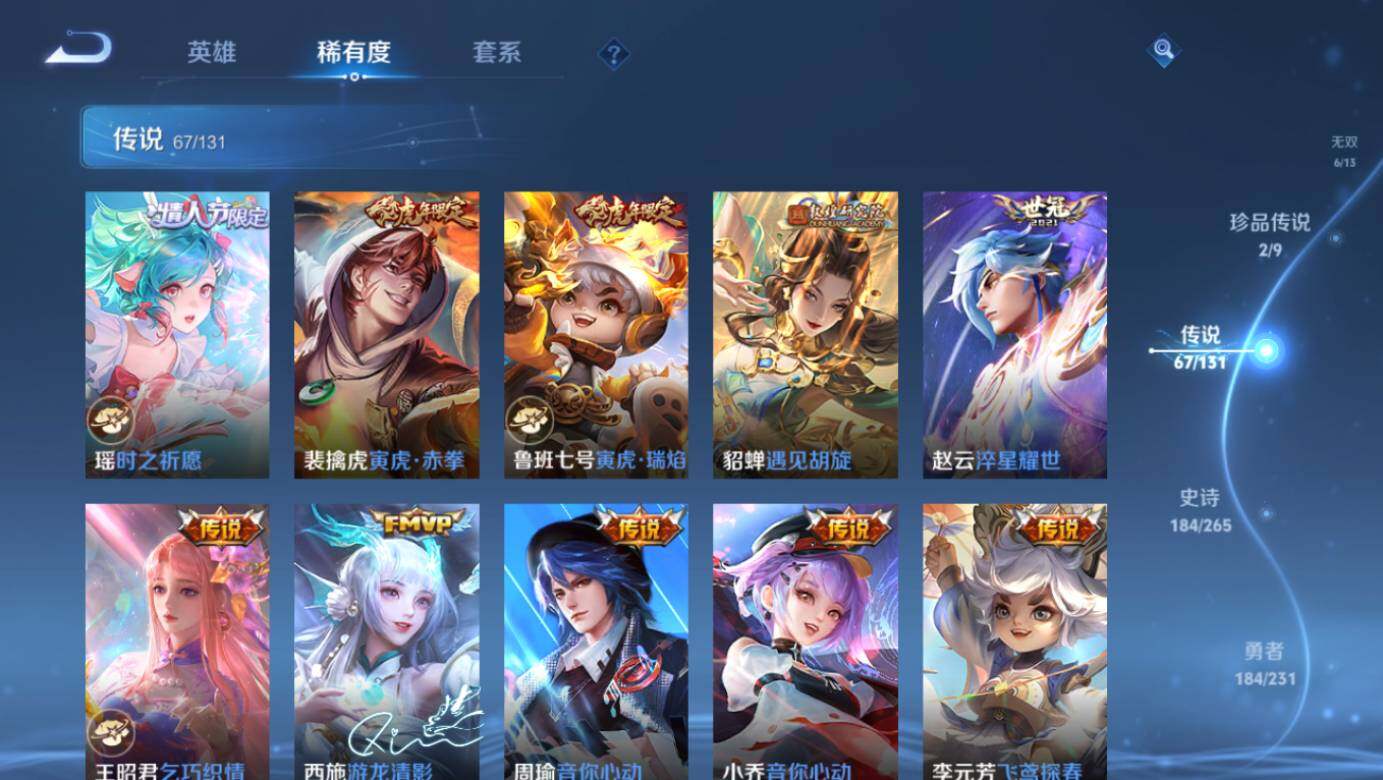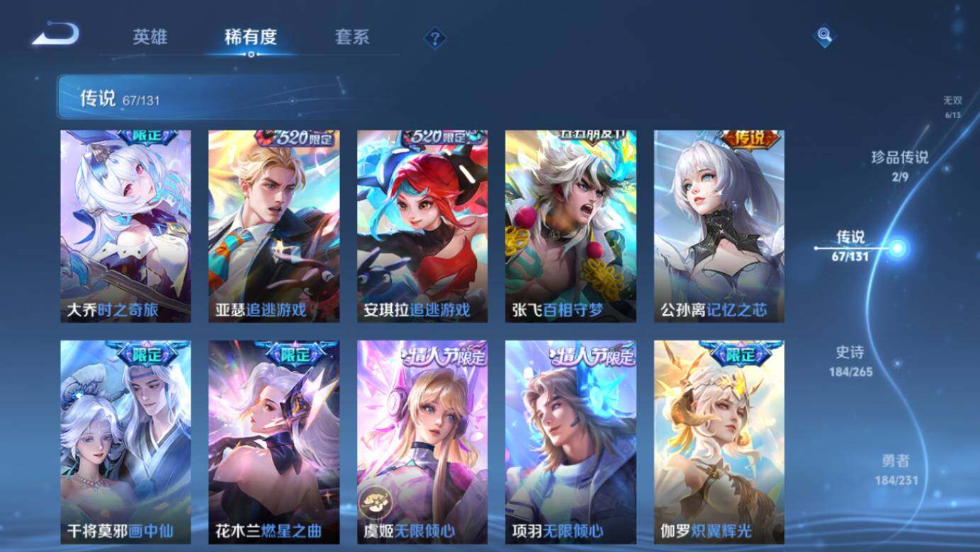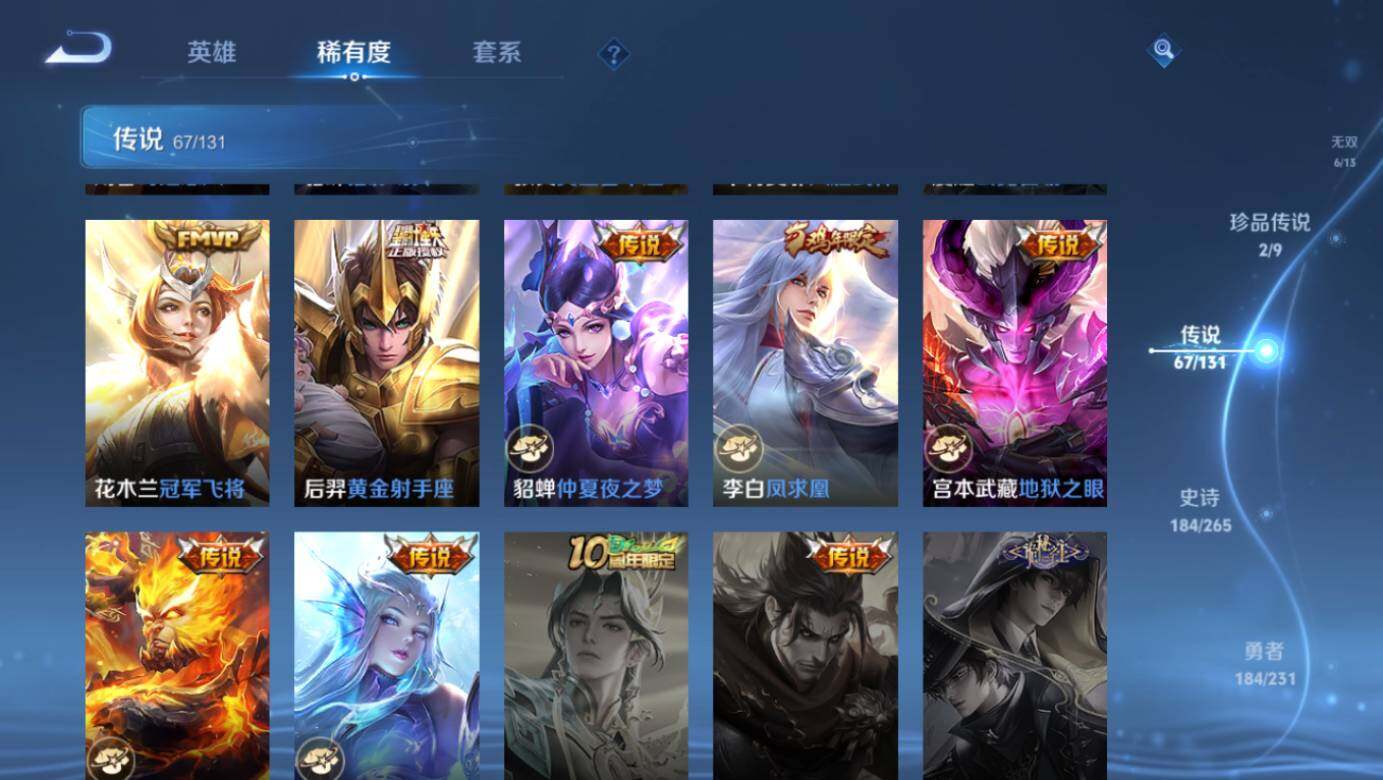 【荣耀典藏】:武则天英雄,武则天倪克斯神谕,小乔天鹅之梦,孙尚香杀手不太冷,鲁班七号星空梦想,李白鸣剑曳影,诸葛亮星域神启,花木兰九霄神辉,铠银白咏叹调,貂蝉幻阙歌,虞姬神鉴启示录,瑶拾光映像,伽罗最初的交响
