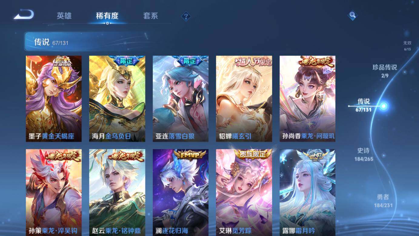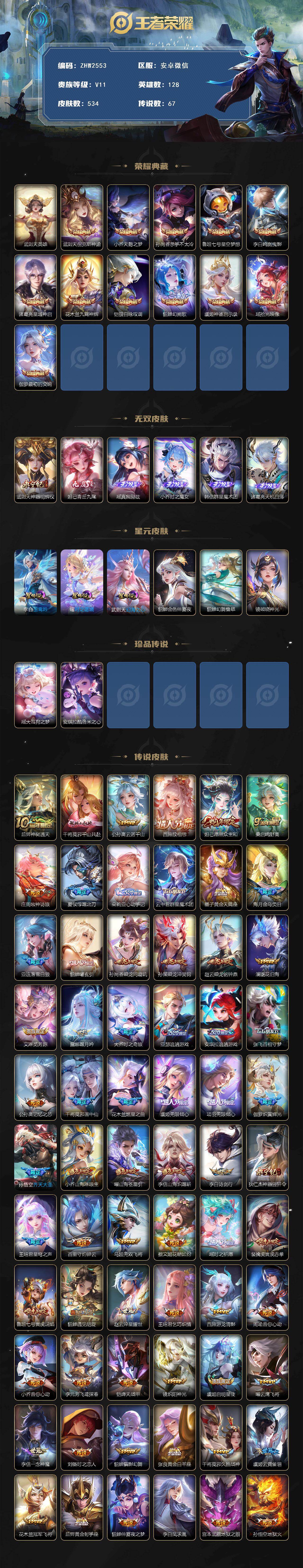 [15564395]安卓WX-V11-最强王者段位-128英雄-534皮肤-12典藏皮肤-1典藏英雄-6星元-6无双-2珍品传说-67传说-184史诗