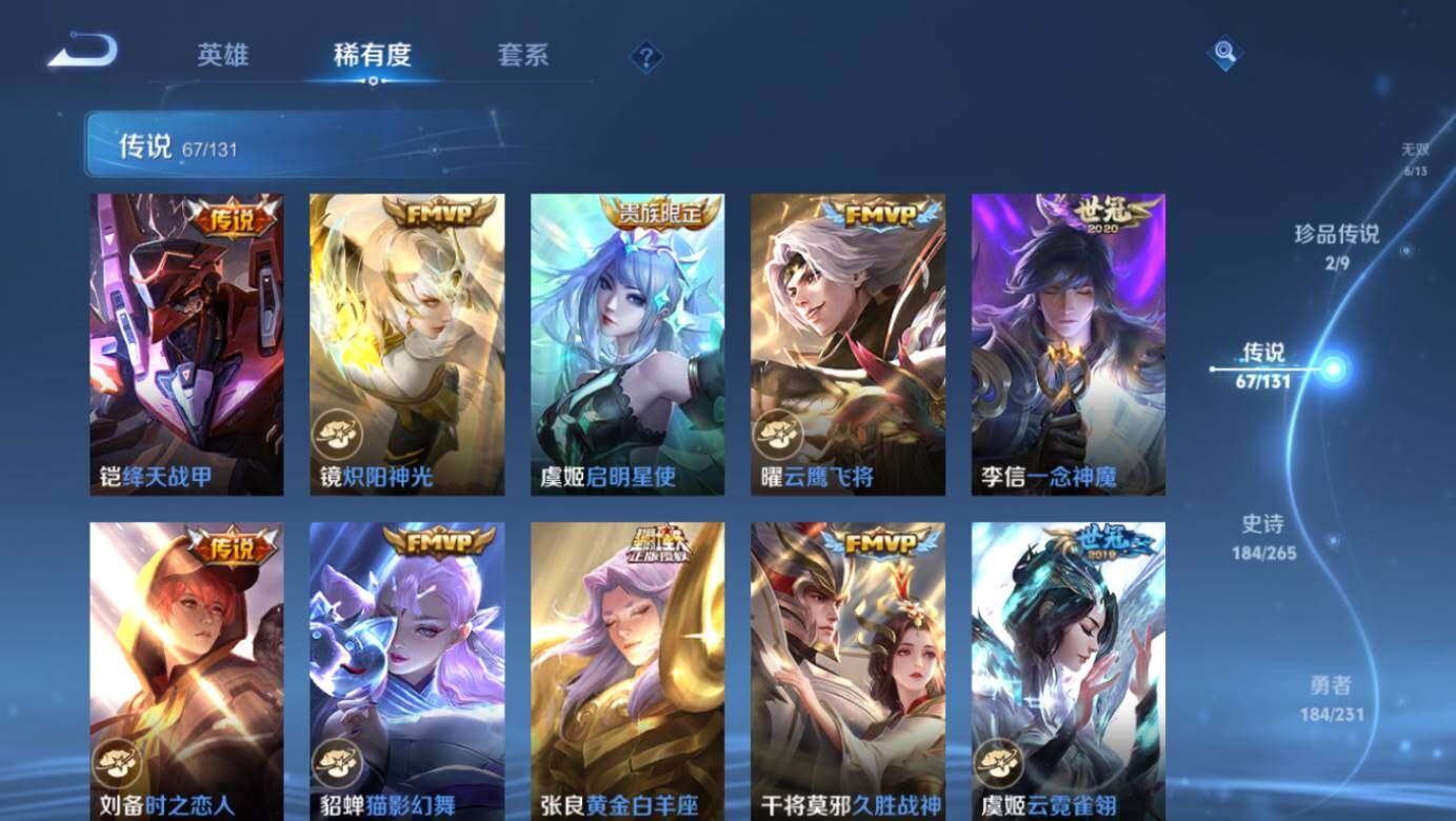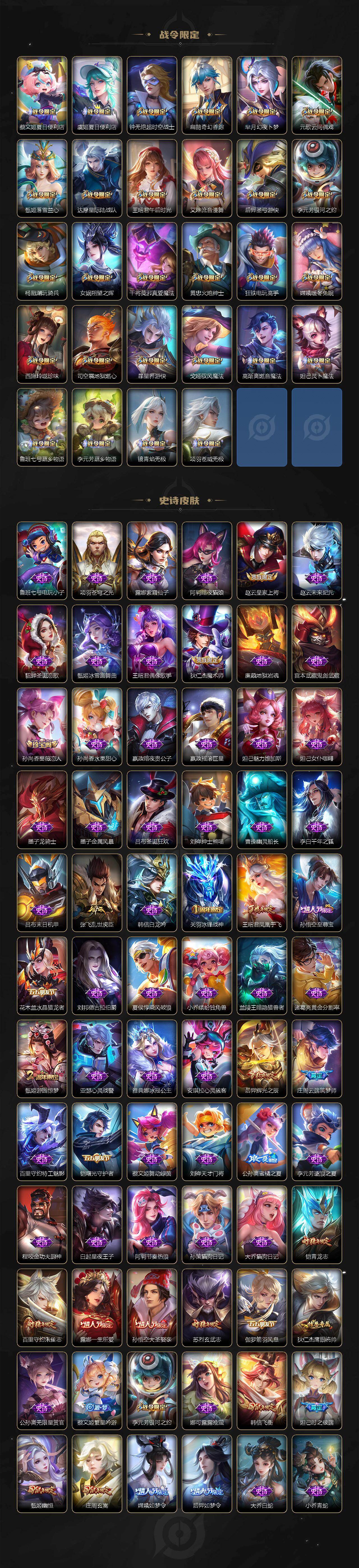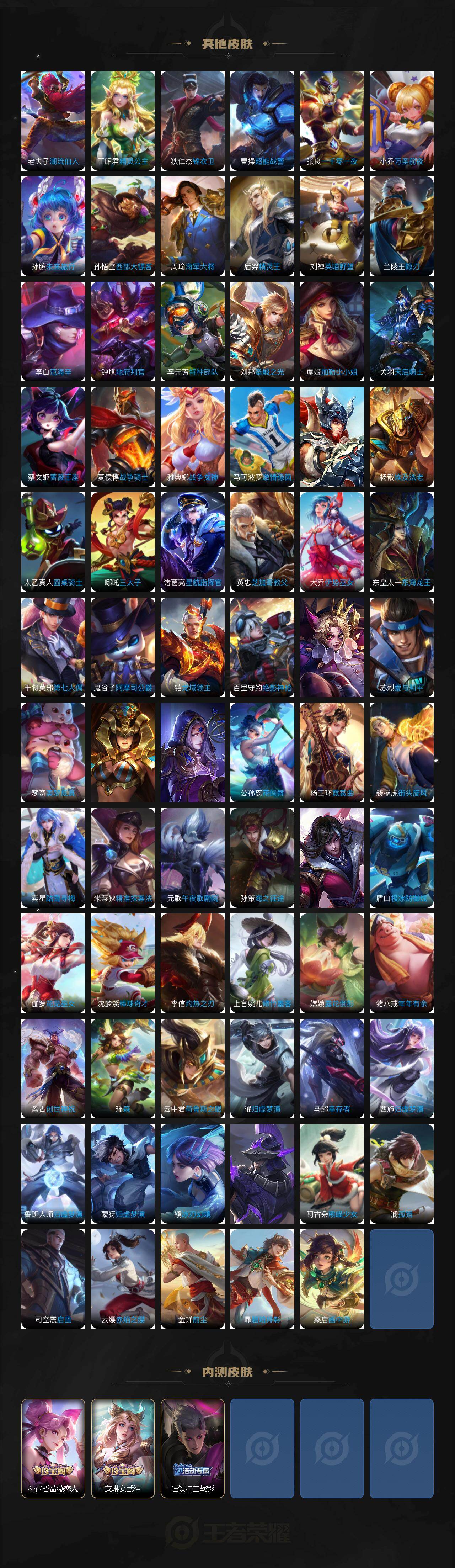 关羽冰锋战神,后羿辉光之辰,庄周玄嵩,甄姬幽恒,韩信飞衡,铠青龙志,苏烈玄武志,百里守约朱雀志,王昭君凤凰于飞,孙悟空大圣娶亲,露娜一生所爱,后羿如梦令,嫦娥如梦令,孙悟空至尊宝,妲己时之彼端,公孙离蜜橘之夏,庄周云端筑梦师,大乔白鹤梁神女,廉颇寅虎·御盾,孙悟空孙行者,甄姬女儿国国王,韩信傲雪梅枪,鲁班七号寅虎·瑞焰,孙膑寅虎·展翼,杨玉环寅虎·心曲,裴擒虎寅虎·赤拳,云中君时之祈愿,瑶时之祈愿,妲己时之奇旅,王昭君星穹之声,上官婉儿神器·万象笔,墨子降魔,李白诗剑行,马可波罗山海·玄木吟,盘古冰霜神祇,瑶山海·碧波行,西施至美·乘鲤谣,夏侯惇霜北刀,桑启鸣野蒿,妲己愿照·众生和