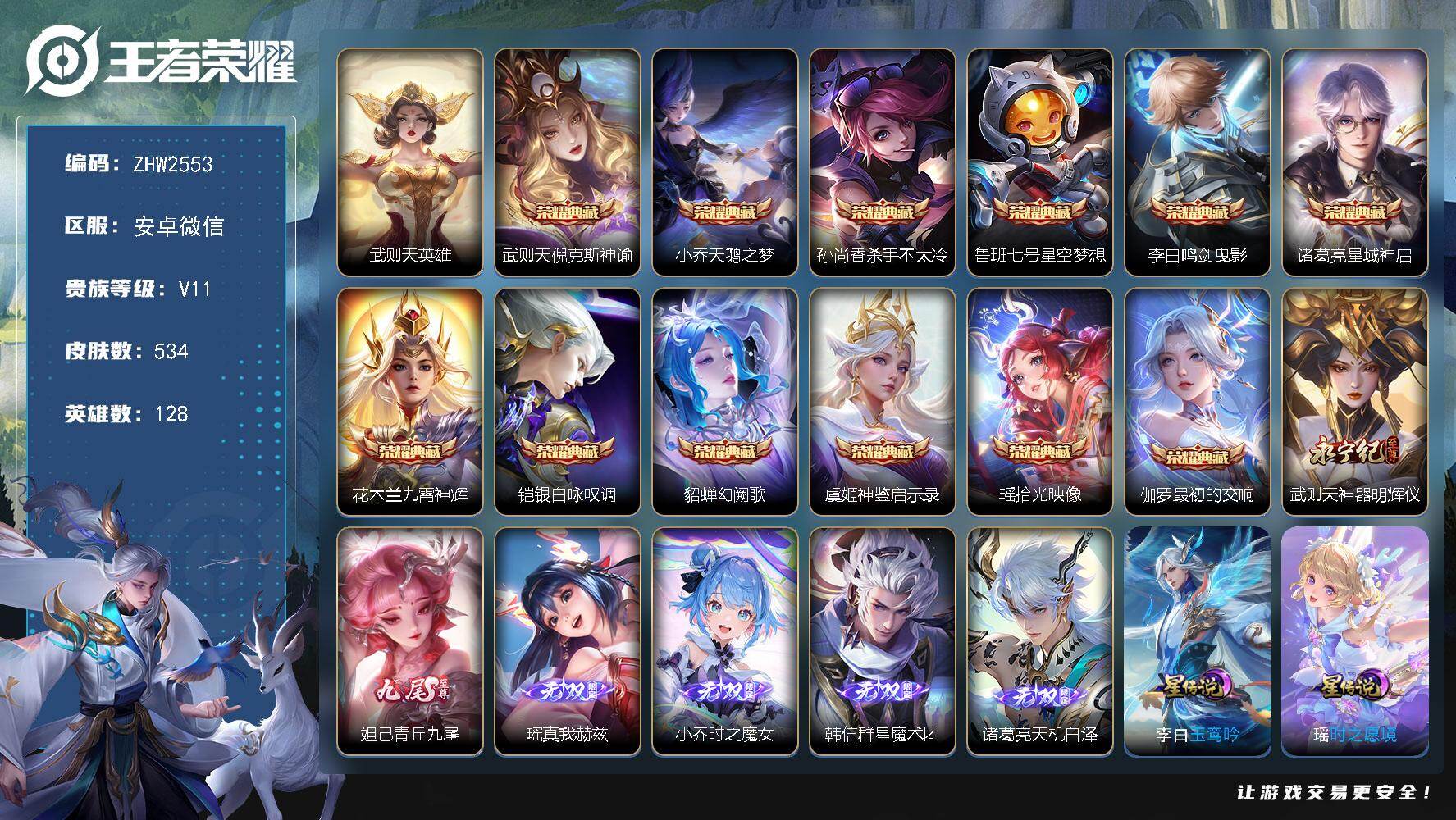 [15564395]安卓WX-V11-最强王者段位-128英雄-534皮肤-12典藏皮肤-1典藏英雄-6星元-6无双-2珍品传说-67传说-184史诗 【英雄全皮】:廉颇全皮,刘禅全皮,武则天全皮,孙权全皮,朵莉亚全皮,刘备全皮,李元芳全皮,苏烈全皮,瑶全皮,云中君全皮,李信全皮,亚连全皮,海月全皮,西施全皮,阿古朵全皮,赵怀真全皮,莱西奥全皮,戈娅全皮,空空儿全皮,影全皮,海诺全皮 【荣耀典藏】:武则天英雄,武则天倪克斯神谕,小乔天鹅之梦,孙尚香杀手不太冷,鲁班七号星空梦想,李白鸣剑曳影,诸葛亮星域神启,花木兰九霄神辉,铠银白咏叹调,貂蝉幻阙歌,虞姬神鉴启示录,瑶拾光映像,伽罗最初的交响 【无双皮肤】:武则天神器明辉仪,妲己青丘九尾,瑶真我赫兹,小乔时之魔女,韩信群星魔术团,诸葛亮天机白泽 【珍品传说】:瑶大耳狗之梦,安琪拉酷洛米之心 【传说皮肤】:后羿神树通天,干将莫邪千山共赴,公孙离云诺千山,西施续相思,妲己愿照众生和,桑启鸣野蒿,庄周牧神诗旅,夏侯惇霜北刀,朵莉亚心动手记,云中君群星魔术团,墨子黄金天蝎座,海月金乌负日,亚连落雪白狼,貂蝉曦玄引,孙尚香乘龙问璇玑,孙策乘龙淬吴钩,赵云乘龙铭钟鼎,澜逐花归海,艾琳觅芳踪,露娜霜月吟,大乔时之奇旅,亚瑟追逃游戏,安琪拉追逃游戏,张飞百相守梦,公孙离记忆之芯,干将莫邪画中仙,花木兰燃星之曲,虞姬无限倾心,项羽无限倾心,伽罗炽翼辉光,孙悟空齐天大圣,小乔山海琳琅生,曜山海苍雷引,李信山海炽霜斩,李白诗剑行,狄仁杰神器狴犴令,王昭君星穹之声,百里守约碎云,马超无双飞将,蔡文姬花朝如约,瑶时之祈愿,裴擒虎寅虎赤拳,鲁班七号寅虎瑞焰,貂蝉遇见胡旋,赵云淬星耀世,王昭君乞巧织情,西施游龙清影,周瑜音你心动,小乔音你心动,李元芳飞鸢探春,铠绛天战甲,镜炽阳神光,虞姬启明星使,曜云鹰飞将,李信一念神魔,刘备时之恋人,貂蝉猫影幻舞,张良黄金白羊座,干将莫邪久胜战神,虞姬云霓雀翎,花木兰冠军飞将,后羿黄金射手座,貂蝉仲夏夜之梦,李白凤求凰,宫本武藏地狱之眼,孙悟空地狱火,武则天海洋之心 【限定皮肤】:夏侯惇霜北刀,暃埋骨钱,蒙犽顽岩魄,蔡文姬夏日便利店,大乔绒语心约,虞姬夏日便利店,姜子牙天穹之誓,李白谪仙醉月,狄仁杰阴阳师,廉颇寅虎御盾,小乔山海琳琅生,赵云皇家上将,墨子降魔,妲己时之彼端,妲己时之奇旅,孙尚香蔷薇恋人,鲁班七号寅虎瑞焰,庄周云端筑