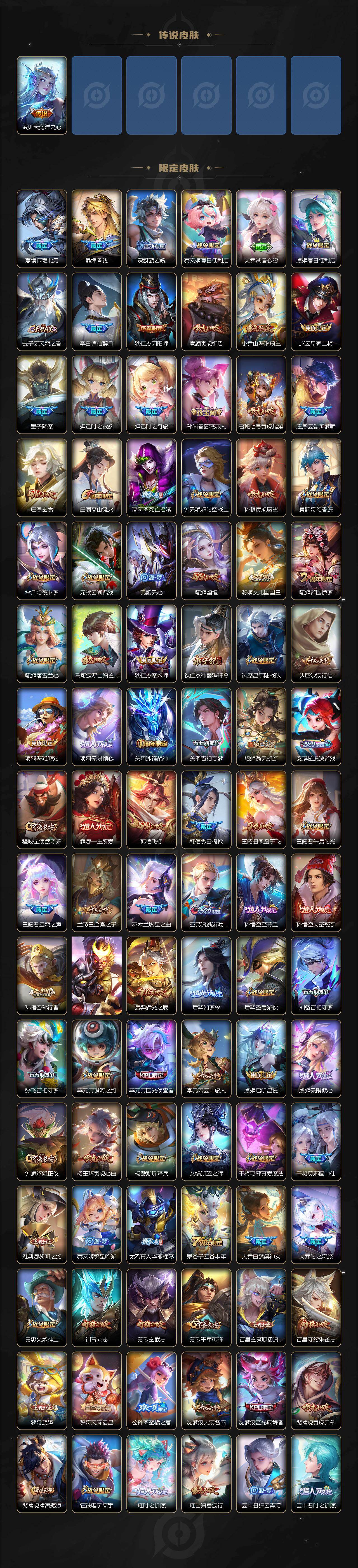 【传说皮肤】:后羿神树通天,干将莫邪千山共赴,公孙离云诺千山,西施续相思,妲己愿照众生和,桑启鸣野蒿,庄周牧神诗旅,夏侯惇霜北刀,朵莉亚心动手记,云中君群星魔术团,墨子黄金天蝎座,海月金乌负日,亚连落雪白狼,貂蝉曦玄引,孙尚香乘龙问璇玑,孙策乘龙淬吴钩,赵云乘龙铭钟鼎,澜逐花归海,艾琳觅芳踪,露娜霜月吟,大乔时之奇旅,亚瑟追逃游戏,安琪拉追逃游戏,张飞百相守梦,公孙离记忆之芯,干将莫邪画中仙,花木兰燃星之曲,虞姬无限倾心,项羽无限倾心,伽罗炽翼辉光,孙悟空齐天大圣,小乔山海琳琅生,曜山海苍雷引,李信山海炽霜斩,李白诗剑行,狄仁杰神器狴犴令,王昭君星穹之声,百里守约碎云,马超无双飞将,蔡文姬花朝如约,瑶时之祈愿,裴擒虎寅虎赤拳,鲁班七号寅虎瑞焰,貂蝉遇见胡旋,赵云淬星耀世,王昭君乞巧织情,西施游龙清影,周瑜音你心动,小乔音你心动,李元芳飞鸢探春,铠绛天战甲,镜炽阳神光,虞姬启明星使,曜云鹰飞将,李信一念神魔,刘备时之恋人,貂蝉猫影幻舞,张良黄金白羊座,干将莫邪久胜战神,虞姬云霓雀翎,花木兰冠军飞将,后羿黄金射手座,貂蝉仲夏夜之梦,李白凤求凰,宫本武藏地狱之眼,孙悟空地狱火,武则天海洋之心