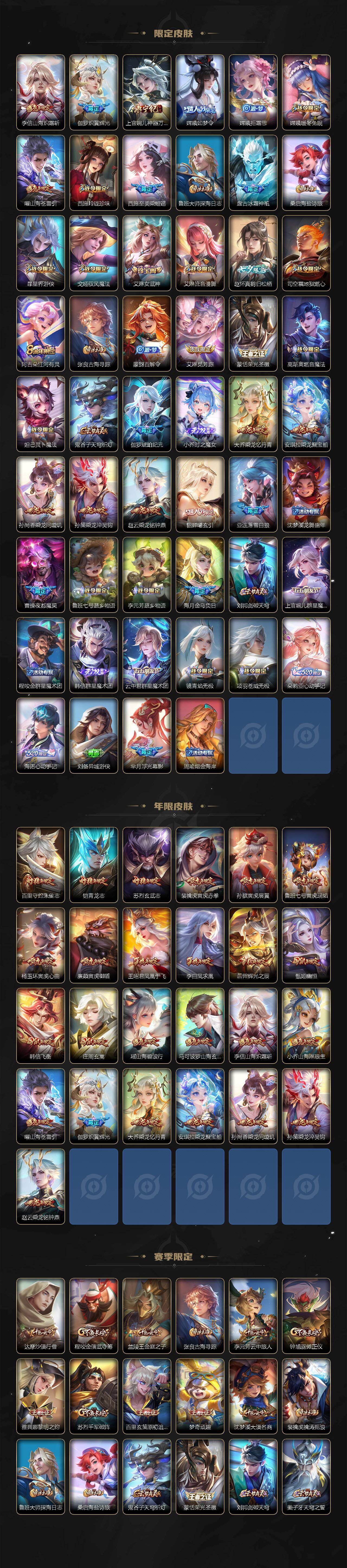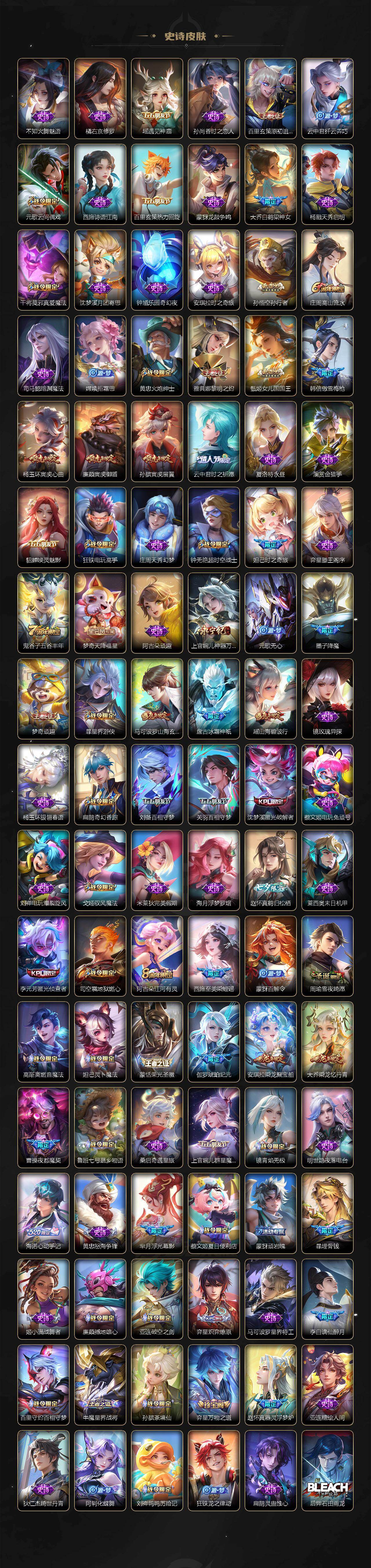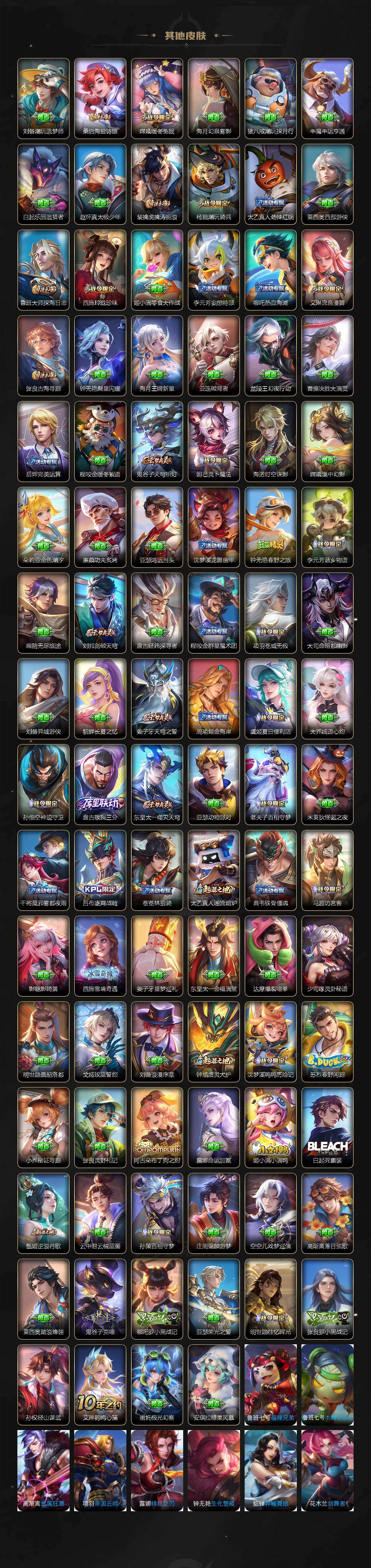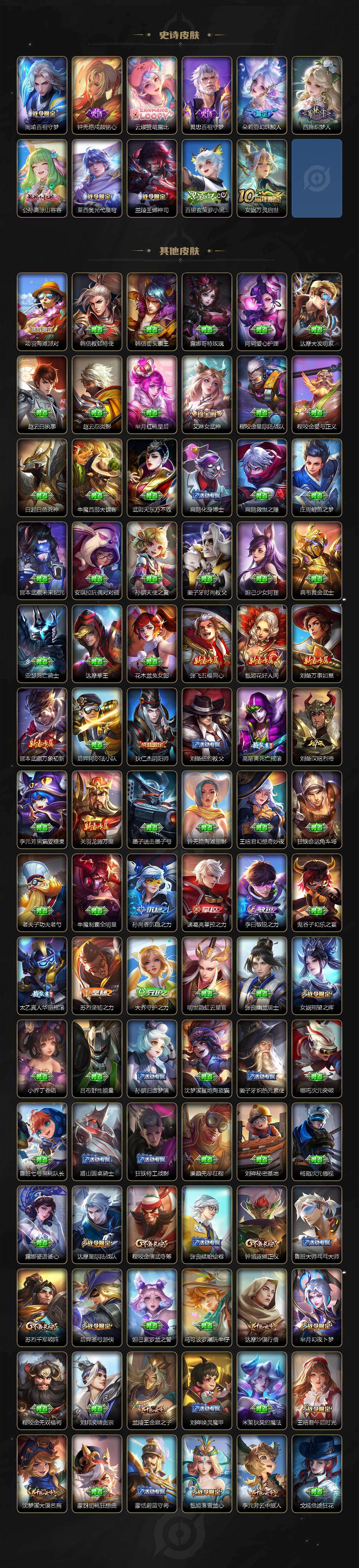 小乔青蛇,大乔白蛇,瑶遇见神鹿,娜可露露晚萤,伽罗箭羽风息,李元芳逐浪之夏,不知火舞魅语,公孙离无限星赏官,大乔猫狗日记,孙策猫狗日记,阿轲节奏热浪,露娜紫霞仙子,诸葛亮黄金分割率,王昭君偶像歌手,韩信白龙吟,项羽苍穹之光,孙尚香时之恋人,阿轲暗夜猫娘,雅典娜冰冠公主,吕布末日机甲,鲁班七号电玩小子,蒙犽龙鼓争鸣,橘右京修罗,墨子龙骑士,嬴政摇滚巨星,刘禅绅士熊喵,刘禅天才门将,白起星夜王子,安琪拉心灵骇客,安琪拉时之奇旅,程咬金功夫厨神,刘邦德古拉伯爵,兰陵王暗隐猎兽者,曹操幽灵船长,宫本武藏鬼剑武藏,司马懿暗渊魔法,亚瑟心灵战警,钟馗乐园奇幻夜,杨戬天秀·启明,蔡文姬舞动绿茵,廉颇地狱岩魂,西施诗语江南,小乔缤纷独角兽,夏侯惇乘风破浪,花木兰水晶猎龙者,铠曙光守护者,百里玄策热力回旋,墨子金属风暴,百里玄策原初追逐者,吕布圣诞狂欢,貂蝉圣诞恋歌,百里守约特工魅影,嬴政暗夜贵公子,嫦娥拒霜思,雅典娜黎明之约,李白千年之狐,夏洛特永昼,澜赏金猎手,貂蝉唤灵魅影,庄周天秀·幻梦,弈星滕王阁序,阿古朵顽趣,镜玫瑰异探,杨玉环银翎春语,刘备百相守梦,关羽百相守梦,沈梦溪匿光破解者,蔡文姬电玩·兔顽号,刘禅电玩·爆裂旋风,海月浮梦罗烟,赵怀真鹤归松栖,莱西奥末日机甲,李元芳匿光侦查者,蒙犽百解令,周瑜雪夜绮愿,高渐离燃音魔法,伽罗琥珀纪元,大乔乘龙·忆丹青,安琪拉乘龙·聚宝船,曹操夜都魔契,桑启奇遇星旅,上官婉儿群星魔术团,明世隐夜落电台,海诺心动手记,李白谪仙醉月,赵怀真器灵·浮梦炉,亚连糖绘人间,狄仁杰绮世丹青