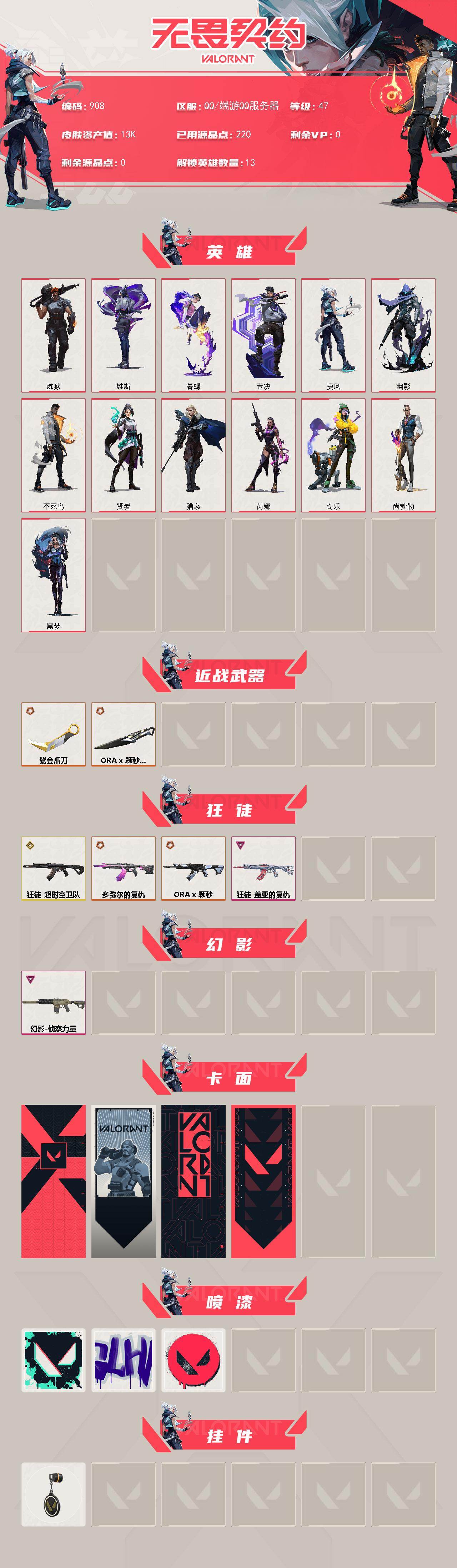 [15564665]【英雄】:炼狱,维斯,暮蝶,壹决,捷风,幽影,不死鸟,贤者,猎枭,芮娜,奇乐,尚勃勒,黑梦 【近战武器】:近战武器-ORA x 颗秒 军刀,近战武器-紫金爪刀 【狂徒】:狂徒-超时空卫队,狂徒-多弥尔的复仇,狂徒-ORA x 颗秒,狂徒-盖亚的复仇 【幻影】:幻影-侦察力量 【卡面】:代号红色 卡面,新兵报到 卡面,V契约 卡面,无畏契约 卡面 【喷漆】:胜利属于无畏契约 喷漆,GLHF 喷漆,无畏契约 喷漆 【挂饰】:无畏契约 纪念币 挂饰
