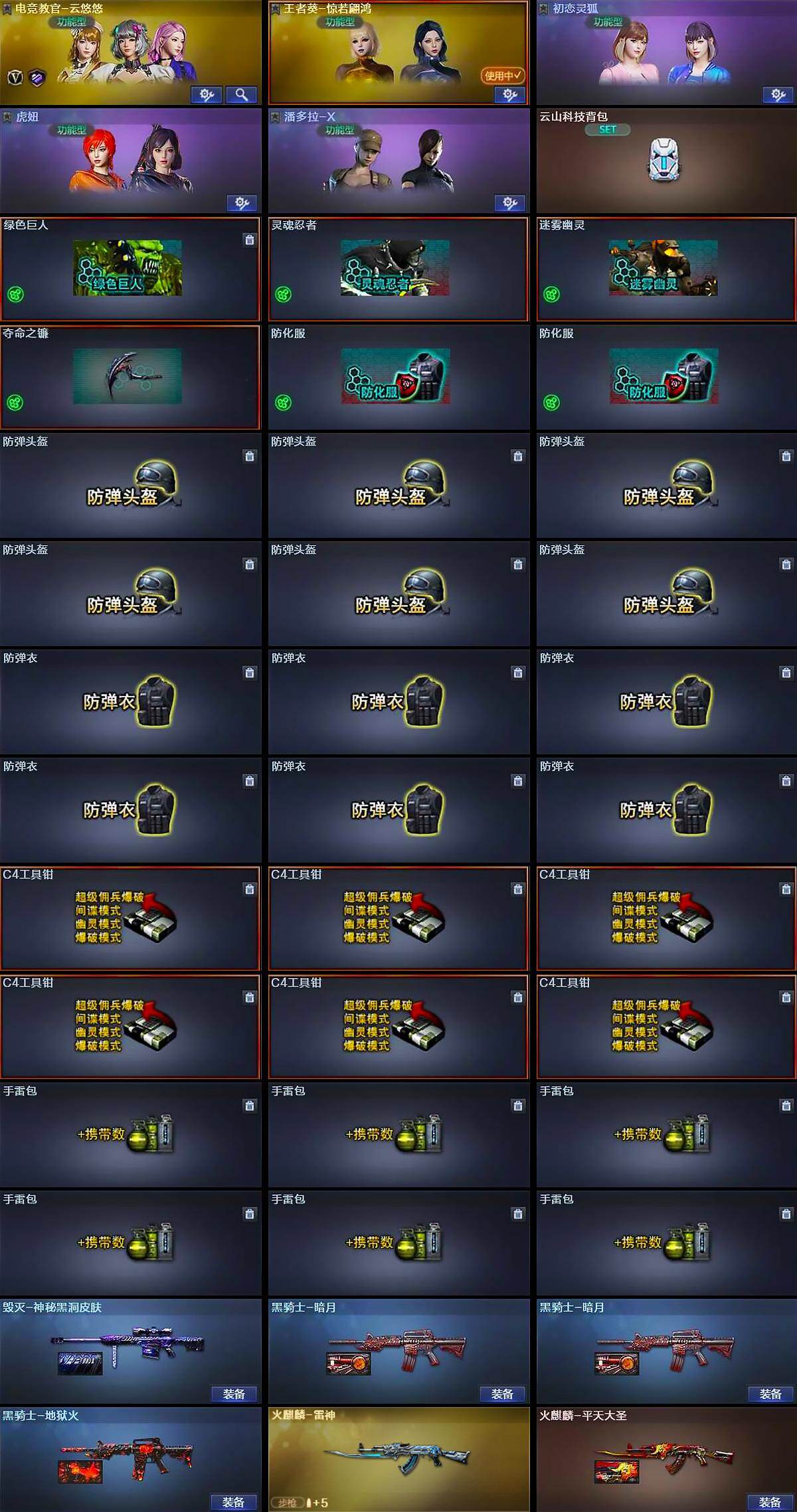【道具】:云山科技背包,绿色巨人,灵魂忍者,迷雾幽灵,夺命之镰,防化服*2,防弹头盔*6,防弹衣*6,C4工具钳*6,手雷包*6