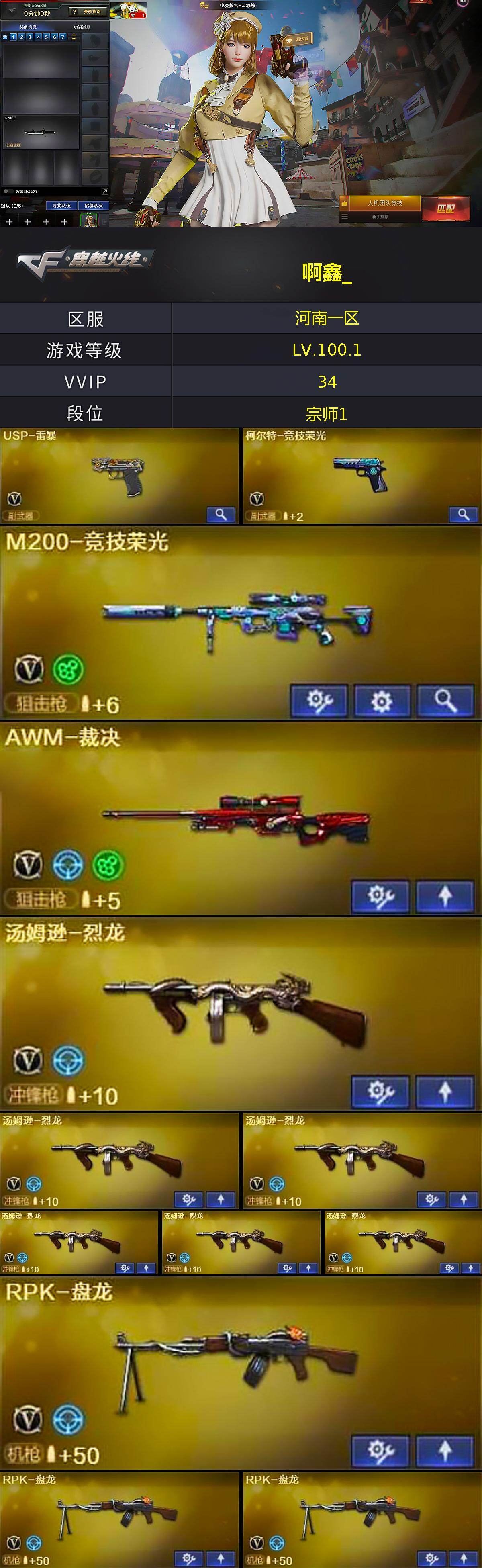 [15566688]河南一区-34V-1王者-1炫金 【热门武器】:M200-竞技荣光,M4A1-黑骑士,汤姆逊-烈龙*6,RPK-盘龙*3,加特林-炼狱*2,USP-雷暴 【王者炫金武器】:炫金毁灭 【皮肤】:火麒麟-雷神,火麒麟-平天大圣,毁灭-神秘黑洞皮肤,黑骑士-暗月*2,黑骑士-地狱火 【角色】:电竞教官-云悠悠,王者葵-惊若翩鸿,初恋灵狐,虎妞,潘多拉-X 【挑战大师】:激光毁灭者III 【英雄级武器】:M4A1-黑龙,M4A1-黑骑士,AK47-无影,王者之烈-觉醒版,Barrett-毁灭,AWM-裁决,M200-竞技荣光,RPK-盘龙*3,加特林-炼狱*2,汤姆逊-烈龙*6,USP-雷暴,柯尔特-竞技荣光,屠龙,擎天-竞技荣光,高爆手雷-竞技荣光*4,闪光弹-竞技荣光*4,烟雾弹-竞技荣光*4 【道具】:云山科技背包,绿色巨人,灵魂忍者,迷雾幽灵,夺命之镰,防化服*2,防弹头盔*6,防弹衣*6,C4工具钳*6,手雷包*6 【特殊枪械】:1黑骑士,6烈龙,3盘龙,2炼狱