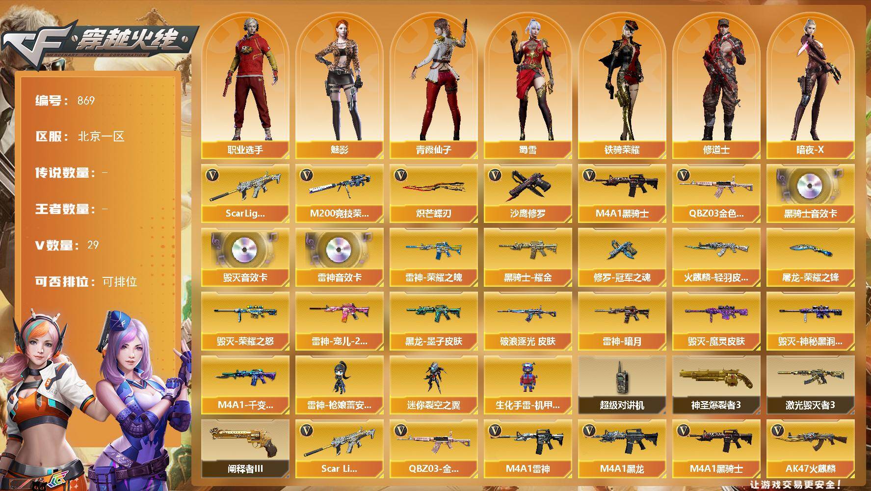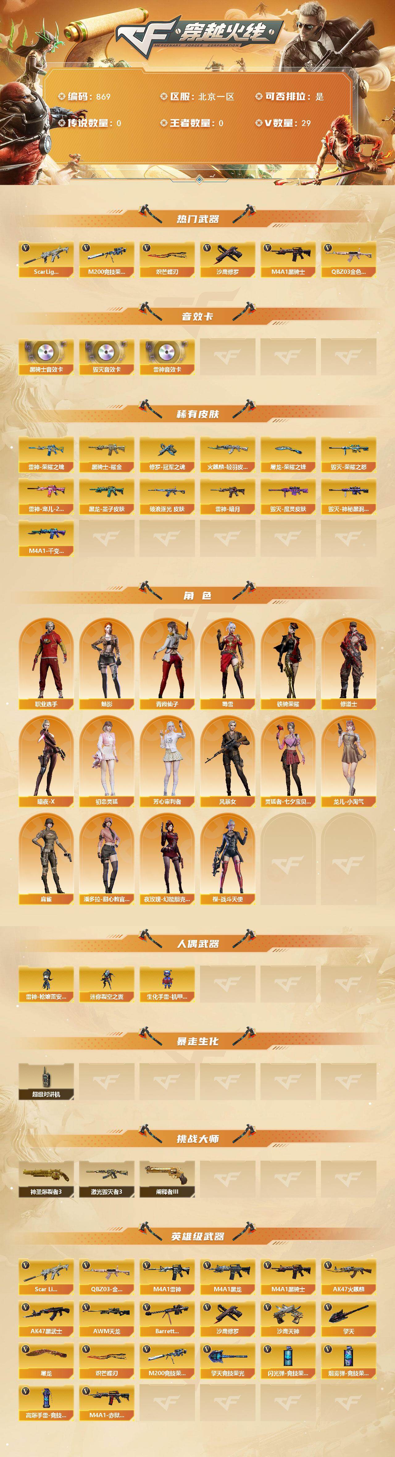 [15566854]北京一区-29V-0王者-0炫金 【热门武器】:QBZ03-金色蔷薇,Scar Light-白虎,M200-竞技荣光,M4A1-黑骑士,沙鹰-修罗*2,炽芒蝶刃 【音效卡】:M4A1-雷神音效卡,M4A1-黑骑士音效卡,Barrett-毁灭音效卡 【皮肤】:金色蔷薇-破浪逐光 皮肤,雷神-暗月,雷神-荣耀之魄,雷神-宠儿-2019MVP,火麒麟-轻羽皮肤,毁灭-荣耀之怒,毁灭-魔灵皮肤,毁灭-神秘黑洞皮肤,M4A1-千变-孔明皮肤,黑龙-墨子皮肤,黑骑士耀金皮肤,修罗-冠军之魂*2,屠龙-荣耀之锋 【角色】:魅影,修道士,暗夜-X,初恋灵狐,芳心审判者,风暴女,灵狐者-七夕宝贝,龙儿-小淘气,麻雀,潘多拉-甜心教官,青霞仙子,蜀雪,铁骑荣耀,夜玫瑰-幻能朋克,樱-战斗天使,职业选手 【人偶武器】:雷神-枪娘蕾安娜,迷你裂空之翼,生化手雷-机甲核心 【暴走生化】:超级对讲机 【挑战大师】:神圣爆裂者III,激光毁灭者III*2,阐释者III 【英雄级武器】:AK47-火麒麟,M4A1-黑龙,M4A1-雷神,M4A1-黑骑士,AK47-黑武士*2,Scar Light-白虎,QBZ03-金色蔷薇,AWM-天龙,Barrett-毁灭*2,M200-竞技荣光,沙鹰-修罗*2,沙鹰-天神,屠龙,擎天*2,擎天-竞技荣光,炽芒蝶刃,高爆手雷-竞技荣光*2,闪光弹-竞技荣光*2,烟雾弹-竞技荣光*2,M4A1-赤狱骑士 【道具】:BS战队炫彩背包,炫彩背包,女皇终结者-魔龙之吻,救世主-黑桃战神,绿色巨人,夺命之镰,防化服*2,枪王排位29赛季金色流光,C4-红龙,防弹头盔*5,防弹衣*5,C4工具钳*5,手雷包*5 【特殊枪械】:1白虎,1黑骑士