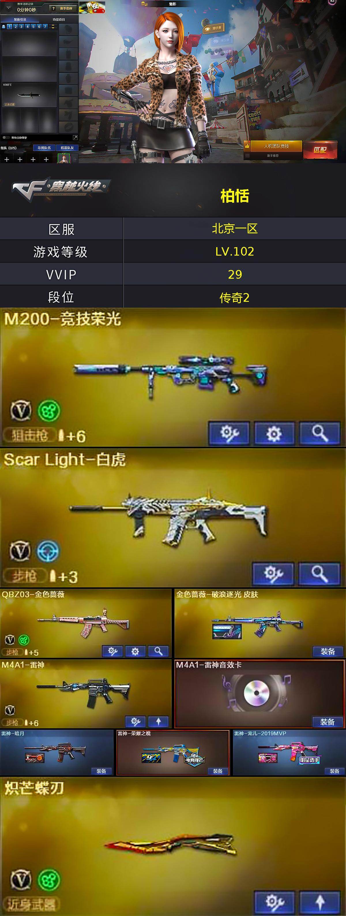 【热门武器】:QBZ03-金色蔷薇,Scar Light-白虎,M200-竞技荣光,M4A1-黑骑士,沙鹰-修罗*2,炽芒蝶刃