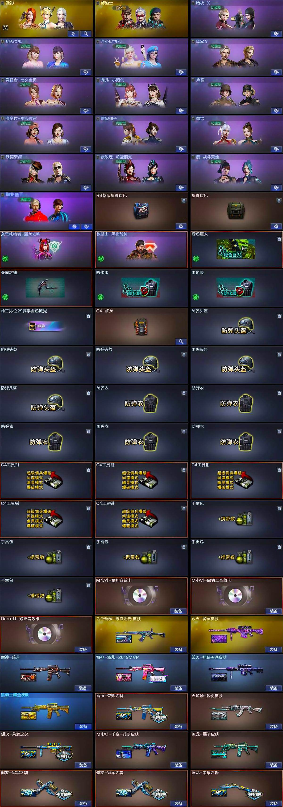 【道具】:BS战队炫彩背包,炫彩背包,女皇终结者-魔龙之吻,救世主-黑桃战神,绿色巨人,夺命之镰,防化服*2,枪王排位29赛季金色流光,C4-红龙,防弹头盔*5,防弹衣*5,C4工具钳*5,手雷包*5