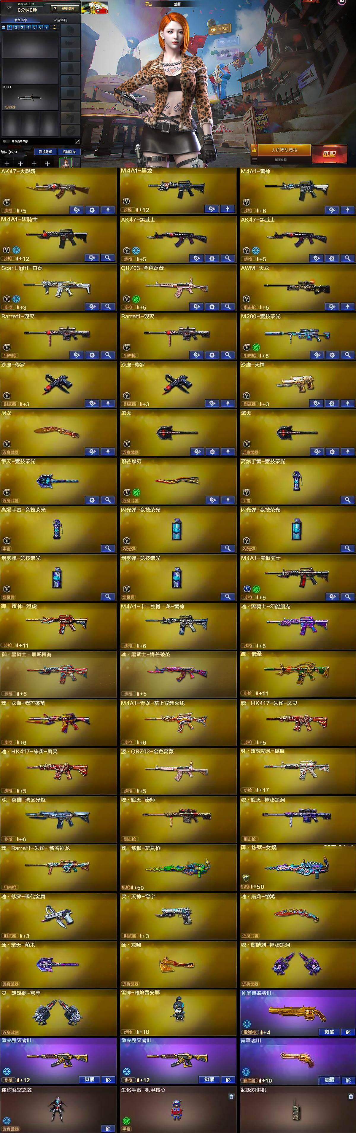 【英雄级武器】:AK47-火麒麟,M4A1-黑龙,M4A1-雷神,M4A1-黑骑士,AK47-黑武士*2,Scar Light-白虎,QBZ03-金色蔷薇,AWM-天龙,Barrett-毁灭*2,M200-竞技荣光,沙鹰-修罗*2,沙鹰-天神,屠龙,擎天*2,擎天-竞技荣光,炽芒蝶刃,高爆手雷-竞技荣光*2,闪光弹-竞技荣光*2,烟雾弹-竞技荣光*2,M4A1-赤狱骑士