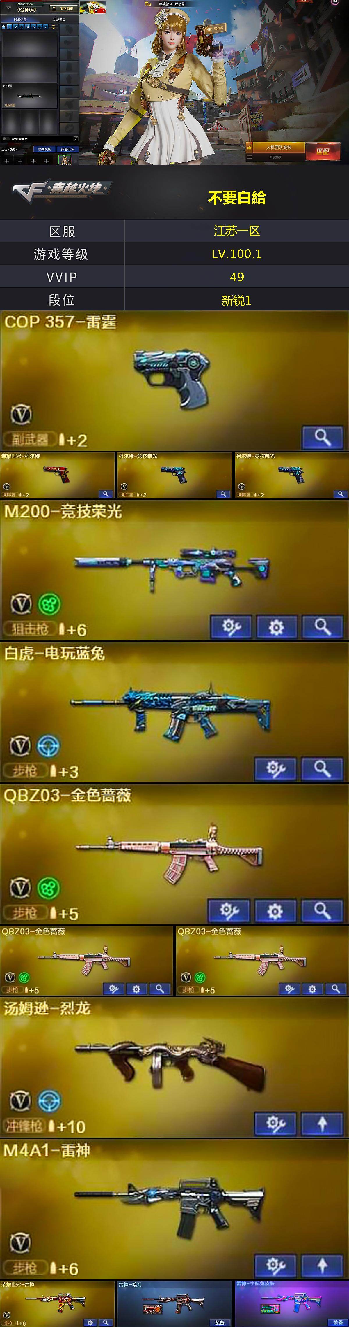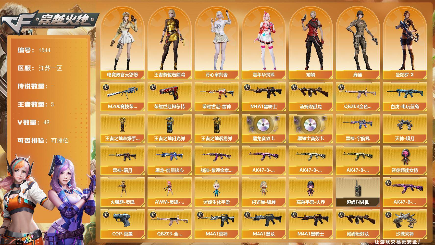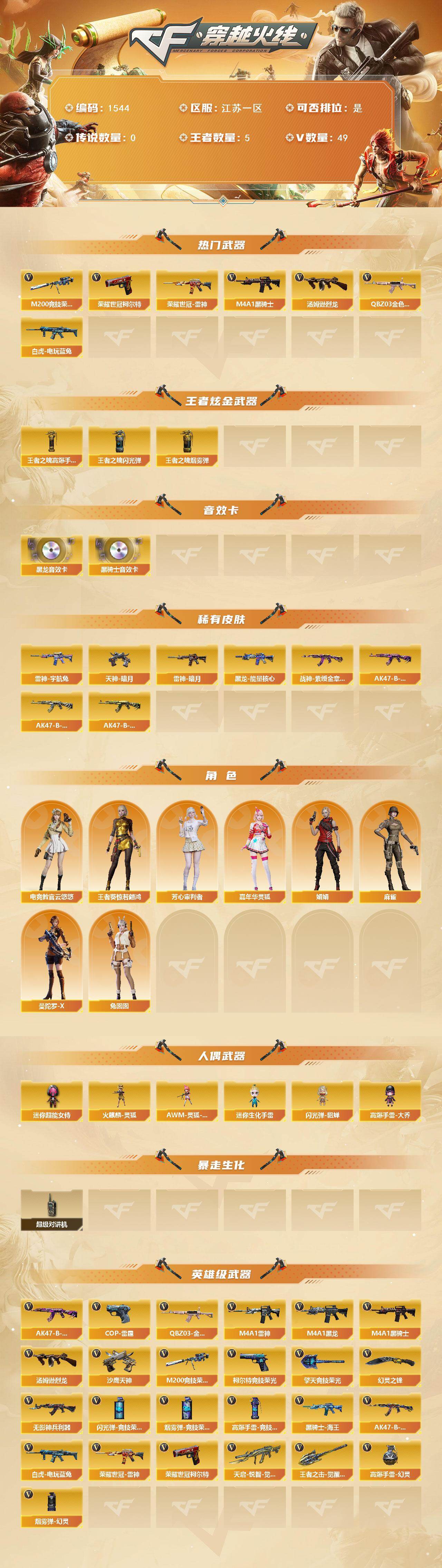 [15566944]江苏一区-49V-5王者-0炫金 【热门武器】:QBZ03-金色蔷薇*3,M200-竞技荣光,荣耀世冠-雷神,白虎-电玩蓝兔,荣耀世冠-柯尔特,M4A1-黑骑士*2,汤姆逊-烈龙 【王者炫金武器】:王者之魄高爆手雷,王者之魄闪光弹,王者之魄烟雾弹 【音效卡】:M4A1-黑龙音效卡,M4A1-黑骑士音效卡 【皮肤】:雷神-暗月,雷神-宇航兔皮肤,黑龙-能量核心,战神-紫绶金章皮肤,AK47-B-常胜将军-曹操*2,AK47-B-常胜将军-刘备,AK47-B-常胜将军-孙权,天神-暗月 【角色】:电竞教官-云悠悠,王者葵-惊若翩鸿,芳心审判者,嘉年华灵狐,娟娟,麻雀,曼陀罗-X,兔囡囡 【人偶武器】:火麒麟-灵狐,AWM-灵狐-15周年嘉年华,迷你生化手雷,闪光弹-貂蝉,高爆手雷-大乔,迷你超能女侍 【暴走生化】:超级对讲机 【英雄级武器】:M4A1-黑龙,M4A1-雷神,M4A1-黑骑士*2,无影-神兵利器,QBZ03-金色蔷薇*3,天启-悦智-觉醒版,AK47-B-战神,黑骑士-海王*2,AK47-B-常胜将军,白虎-电玩蓝兔,荣耀世冠-雷神,M200-竞技荣光,汤姆逊-烈龙,沙鹰-天神*3,COP-雷霆,荣耀世冠-柯尔特,柯尔特-竞技荣光*2,幻灵之锋,擎天-竞技荣光*3,王者之击-觉醒版,高爆手雷-幻灵*2,高爆手雷-竞技荣光*4,闪光弹-竞技荣光*6,烟雾弹-幻灵*2,烟雾弹-竞技荣光*4 【道具】:炫彩背包,背包-葫芦兄弟,超级背包*2,绿色巨人,灵魂忍者,迷雾幽灵,夺命之镰,防化服*2,金色流光-枪王排位,星辰流光-枪王排位,电玩兔兔表情,C4-红龙,防弹头盔*3,防弹衣*3,C4工具钳*3,手雷包*3 【特殊枪械】:2黑骑士,1烈龙