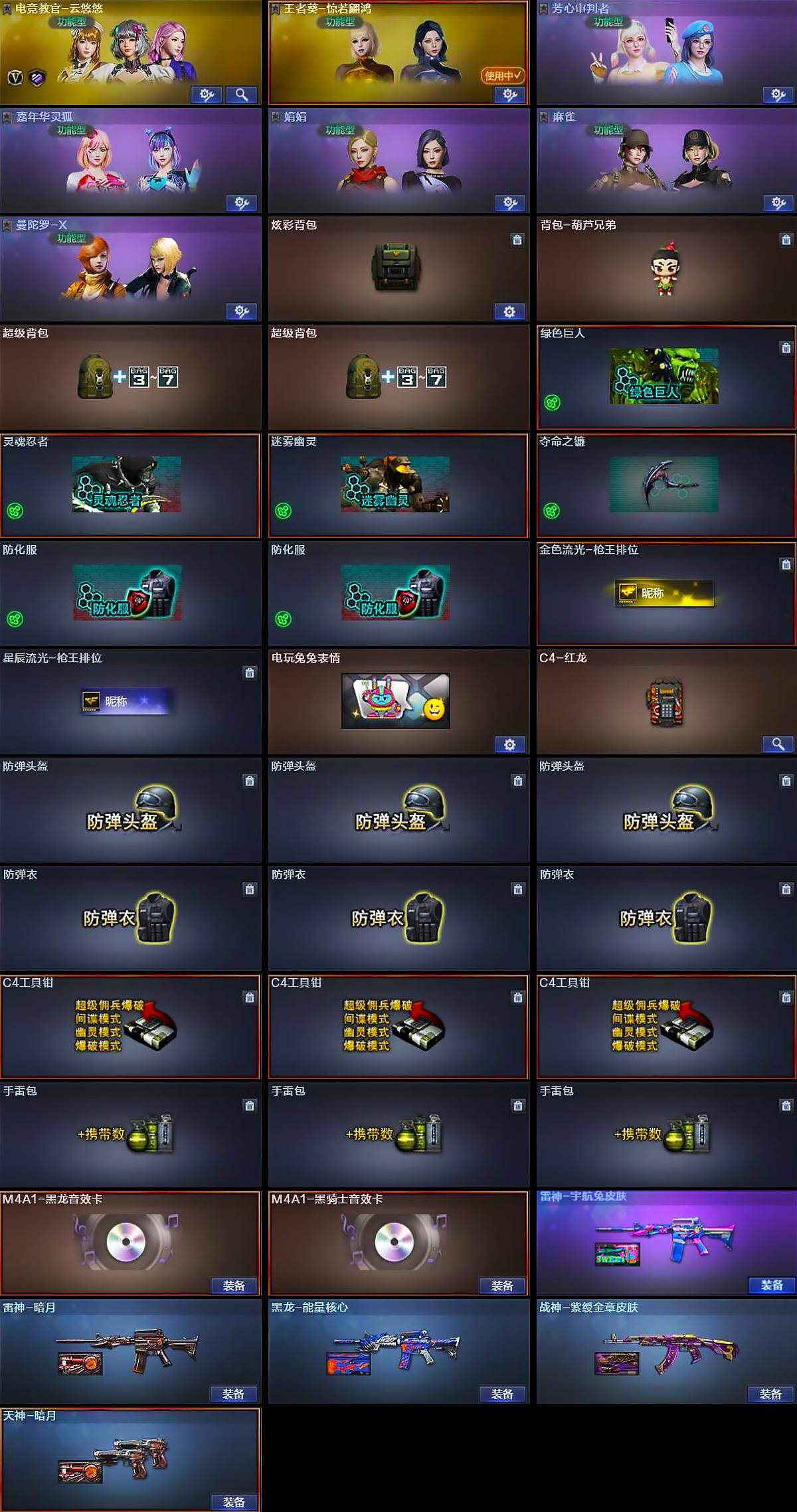 【道具】:炫彩背包,背包-葫芦兄弟,超级背包*2,绿色巨人,灵魂忍者,迷雾幽灵,夺命之镰,防化服*2,金色流光-枪王排位,星辰流光-枪王排位,电玩兔兔表情,C4-红龙,防弹头盔*3,防弹衣*3,C4工具钳*3,手雷包*3