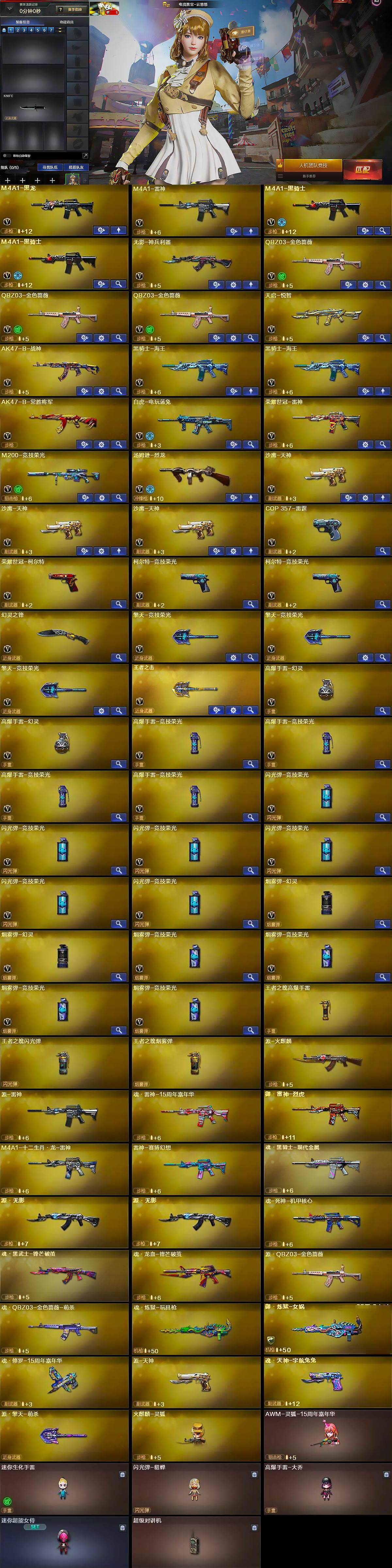 【热门武器】:QBZ03-金色蔷薇*3,M200-竞技荣光,荣耀世冠-雷神,白虎-电玩蓝兔,荣耀世冠-柯尔特,M4A1-黑骑士*2,汤姆逊-烈龙