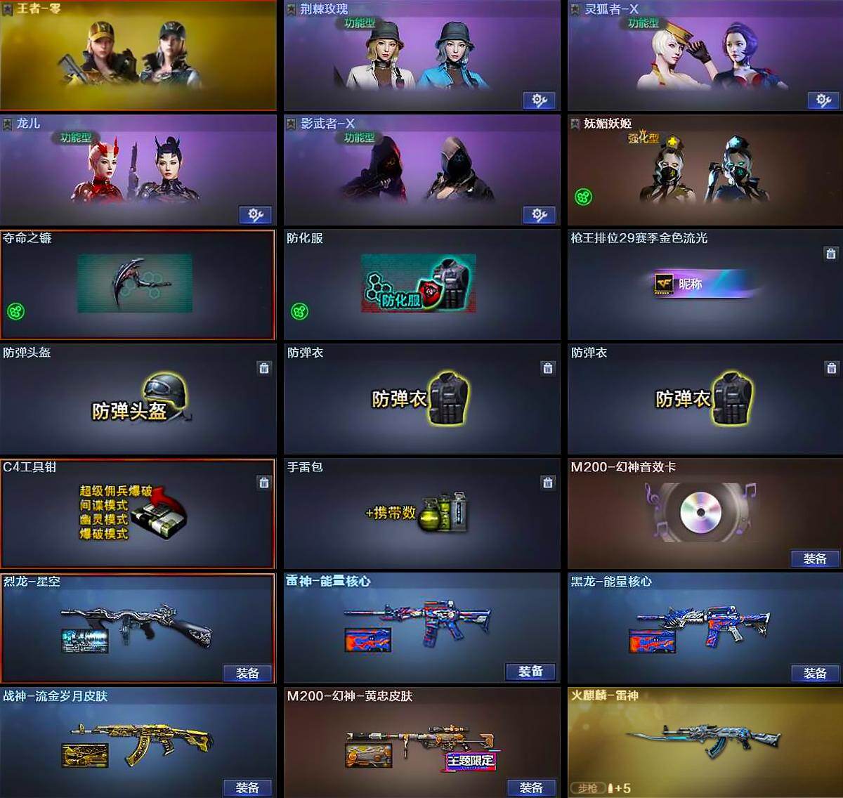 【道具】:妩媚妖姬,夺命之镰,防化服,枪王排位29赛季金色流光,防弹头盔,防弹衣*2,C4工具钳,手雷包
