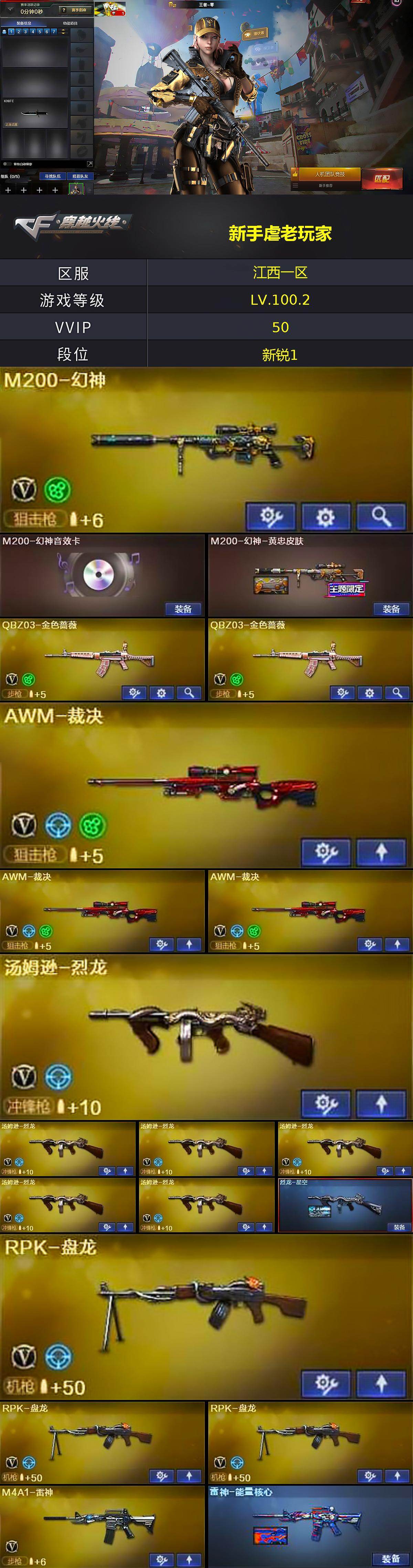 [15567608]江西一区-50V-1王者-1炫金 【热门武器】:QBZ03-金色蔷薇*2,M200-幻神,汤姆逊-烈龙*6,RPK-盘龙*3,加特林-炼狱,斯泰尔-蝴蝶 【王者炫金武器】:炫金毁灭 【音效卡】:M200-幻神音效卡 【皮肤】:M200-幻神-黄忠皮肤,烈龙-星空,雷神-能量核心,火麒麟-雷神,黑龙-能量核心,战神-流金岁月皮肤 【角色】:王者-零,荆棘玫瑰,灵狐者-X,龙儿,影武者-X 【人偶武器】:斯泰尔-蝴蝶,COP-旗袍*2 【挑战大师】:激光毁灭者III 【英雄级武器】:M4A1-千变,AK47-火麒麟,M4A1-黑龙*2,M4A1-雷神,M4A1-死神,AK12-天启*2,QBZ03-金色蔷薇*2,AWM-天龙,AWM-裁决*3,M200-幻神,RPK-盘龙*3,加特林-炼狱,汤姆逊-烈龙*6,AA-12-雷霆,麒麟刺-堕天神,擎天,麒麟刺*3,斩神刀-雷暴,王者之锋-觉醒版,高爆手雷-雷霆,高爆手雷-雷暴*3,高爆手雷-堕天神,闪光弹-雷霆,闪光弹-雷暴*3,闪光弹-堕天神,烟雾弹-雷霆,烟雾弹-雷暴*3,烟雾弹-堕天神 【道具】:妩媚妖姬,夺命之镰,防化服,枪王排位29赛季金色流光,防弹头盔,防弹衣*2,C4工具钳,手雷包 【特殊枪械】:蝴蝶斯泰尔+6烈龙,6烈龙,3盘龙,1炼狱,1蝴蝶斯泰尔