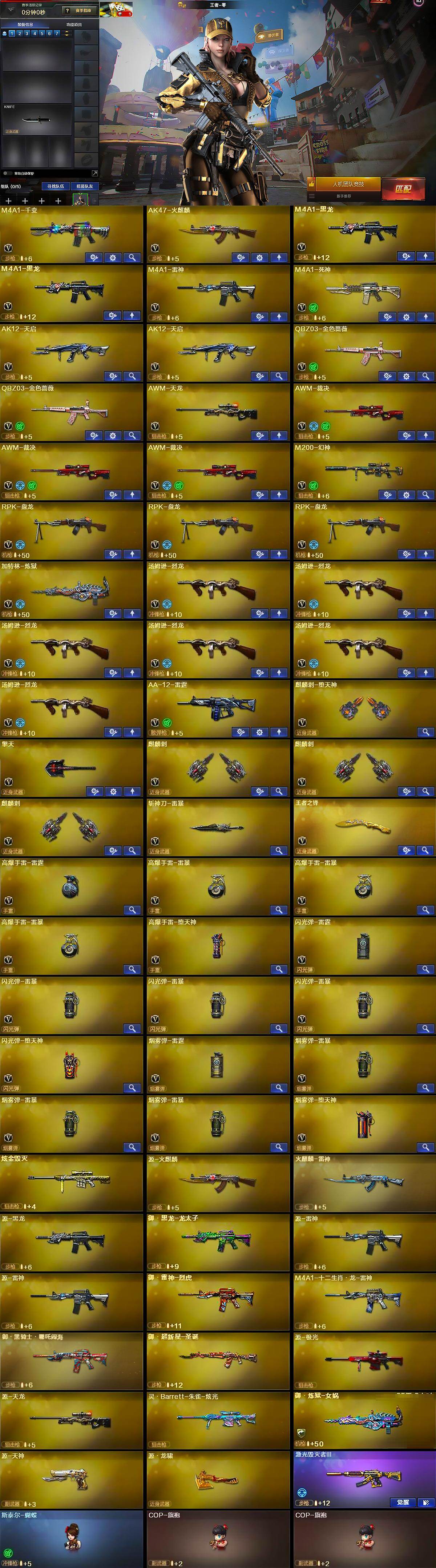 【英雄级武器】:M4A1-千变,AK47-火麒麟,M4A1-黑龙*2,M4A1-雷神,M4A1-死神,AK12-天启*2,QBZ03-金色蔷薇*2,AWM-天龙,AWM-裁决*3,M200-幻神,RPK-盘龙*3,加特林-炼狱,汤姆逊-烈龙*6,AA-12-雷霆,麒麟刺-堕天神,擎天,麒麟刺*3,斩神刀-雷暴,王者之锋-觉醒版,高爆手雷-雷霆,高爆手雷-雷暴*3,高爆手雷-堕天神,闪光弹-雷霆,闪光弹-雷暴*3,闪光弹-堕天神,烟雾弹-雷霆,烟雾弹-雷暴*3,烟雾弹-堕天神