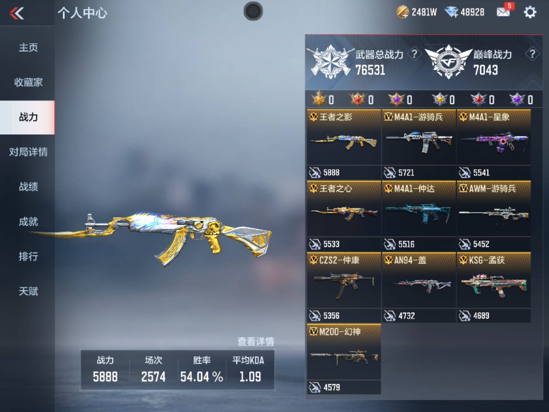 【热门武器】:KSG-孟获,81式-光明之神,M4A1-仲达,AK47-常胜,M4A1-星象,AK47-游骑兵,M4A1-游骑兵,TAC-慈,M200-幻神,AWM-游骑兵,VEPR12-宙斯,COP 357-赤龙,黄金COP 357,COP 357-A,COP 357-绚樱*4,CZS2-仲康,AN94-盖